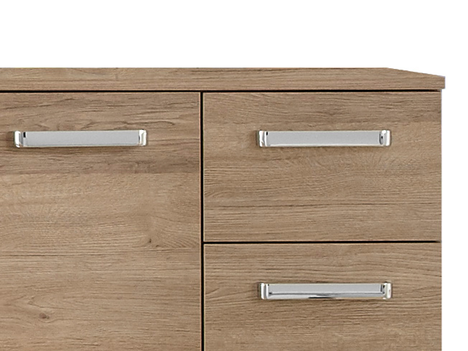 Optisch überzeugt der Schrank durch seine moderne Optik in Sanremo Eiche Terra quer, einer Nachbildung, die natürliche Holzoberflächen gekonnt imitiert. Die Melaminharzbeschichtung macht die Oberfläche nicht nur kratzfest und pflegeleicht, sondern verleiht dem Schrank auch eine hochwertige Anmutung. Die Griffe und Füße in Chrom-Glanz setzen zusätzliche Akzente und runden das zeitlose Design ab.