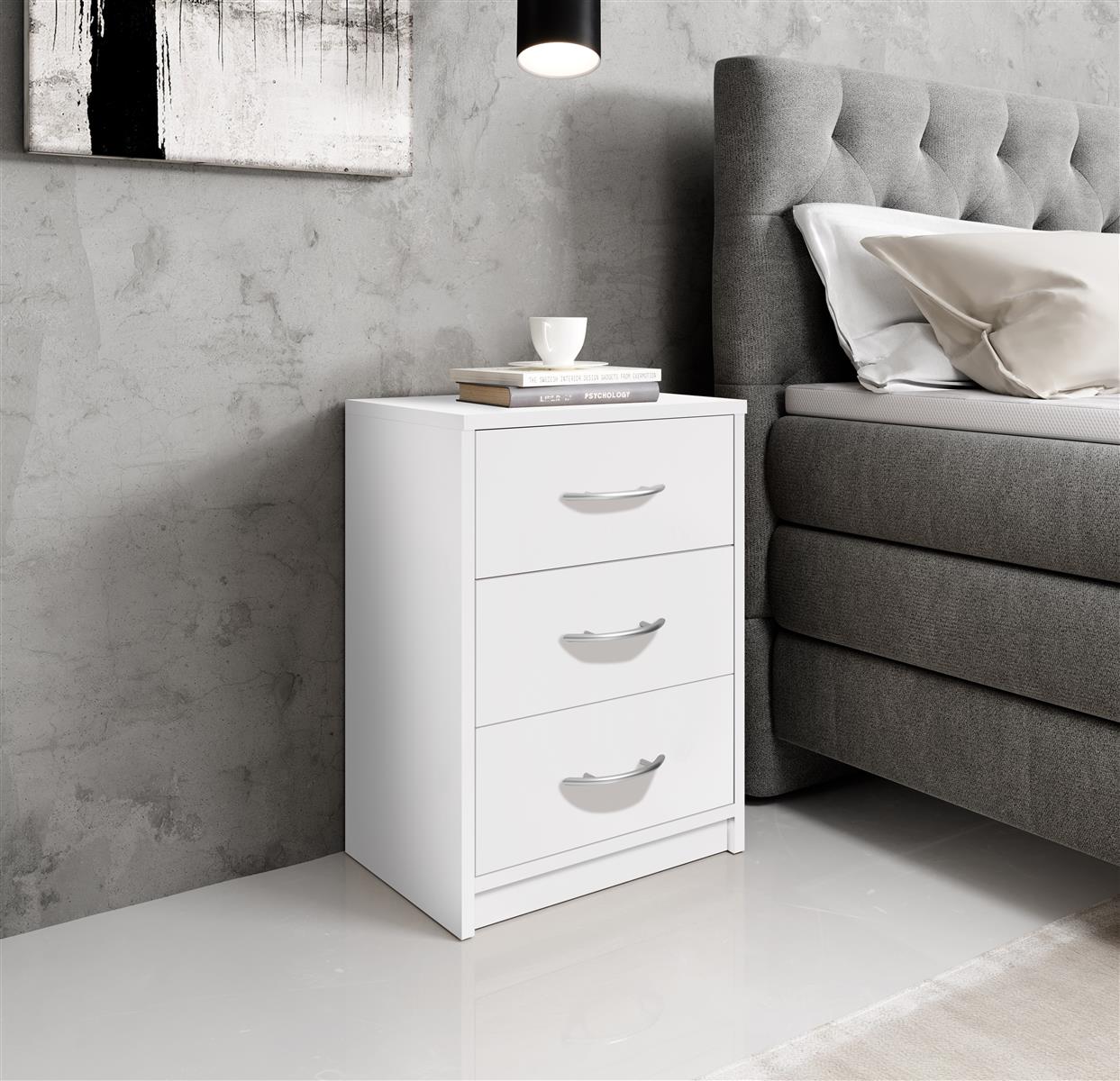 [metaDescription] => Nachttisch Weiß - Schlichter Nachtschrank mit drei Schubladen passend zu jedem Bett & Boxspringbett - 39 x 54 x 28 cm (B/H/T)