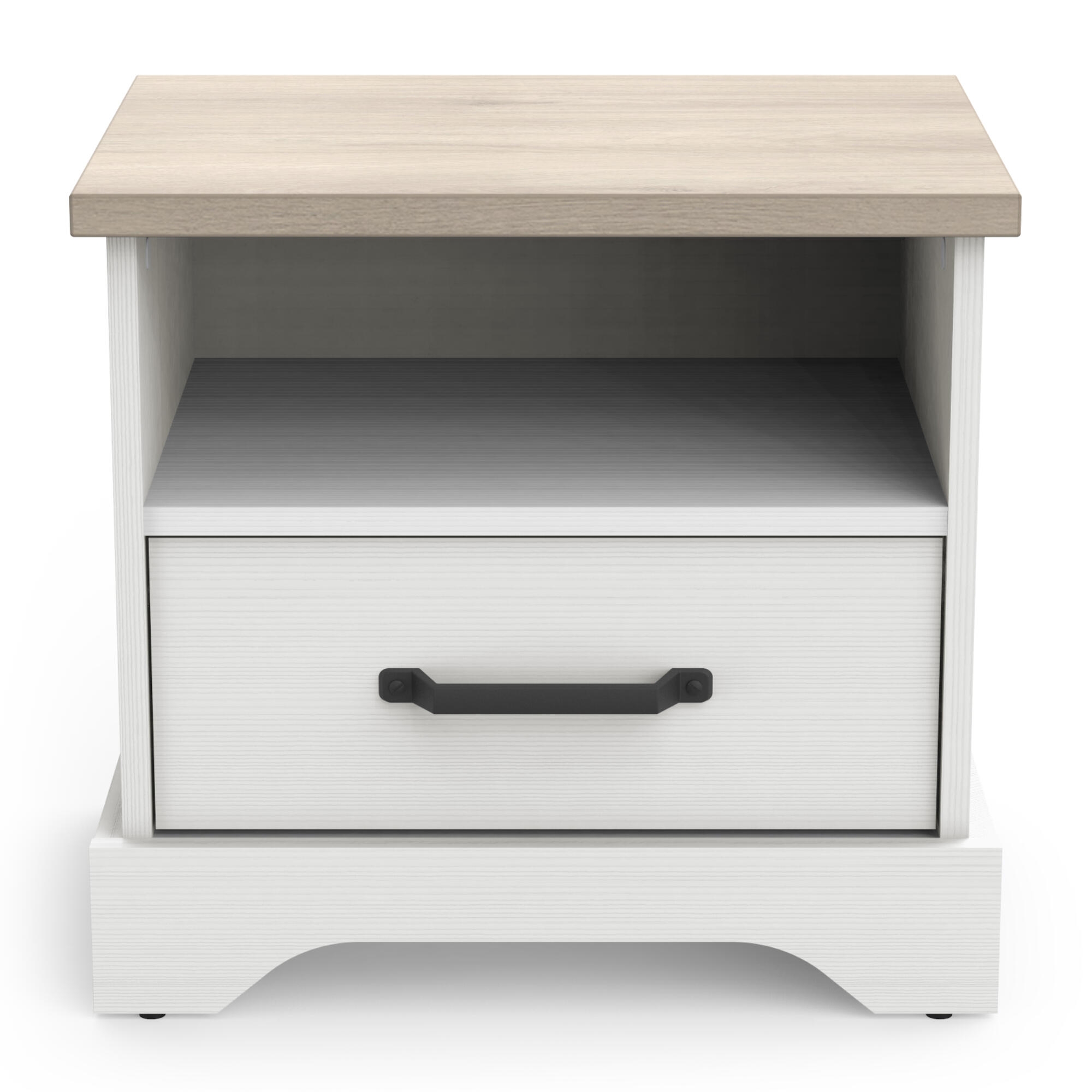 Die Kombination aus weiß strukturiertem Melamin und Papierdekor in Eiche Kronberg, in Form geschnittenen Füßen und einem grau antik lackierten Griff in Metalloptik verleiht der Nachtkommode ein modernes, wohnliches Design, das sich harmonisch in viele Schlafzimmerstile einfügt.