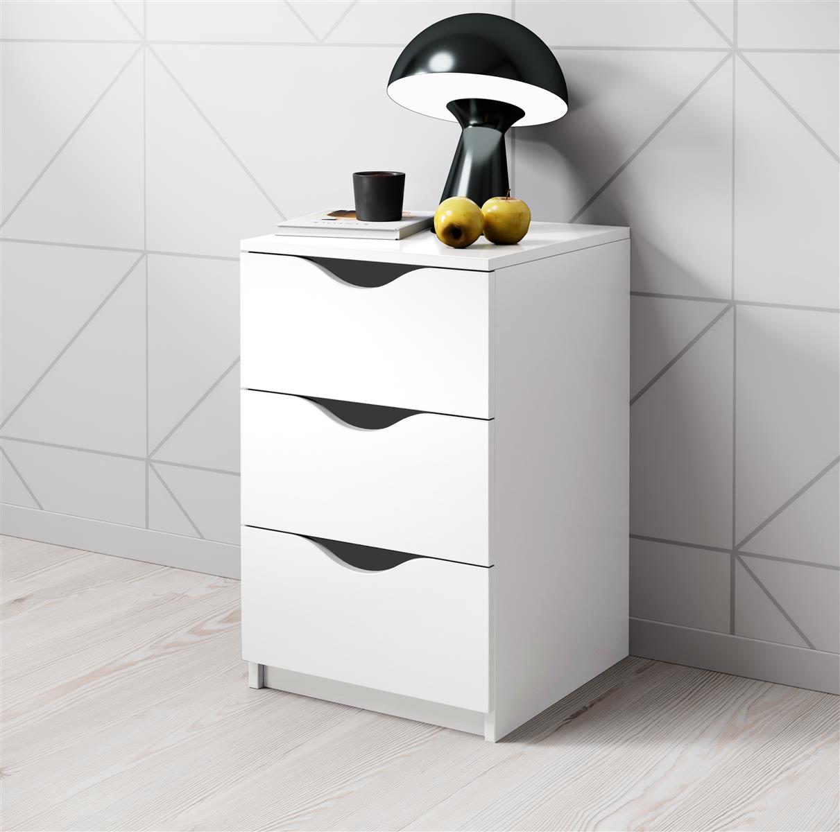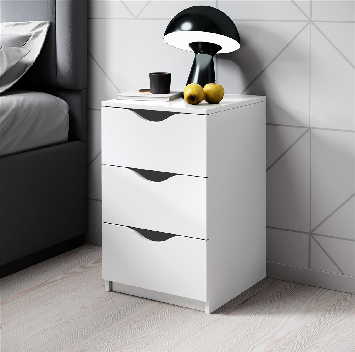 Die weiße Farbgestaltung und der moderne Stil lassen sich vielseitig mit unterschiedlichen Betten und Einrichtungskonzepten kombinieren, während die stabile Ausführung aus Spanplatte für eine solide Basis im Alltag sorgt.