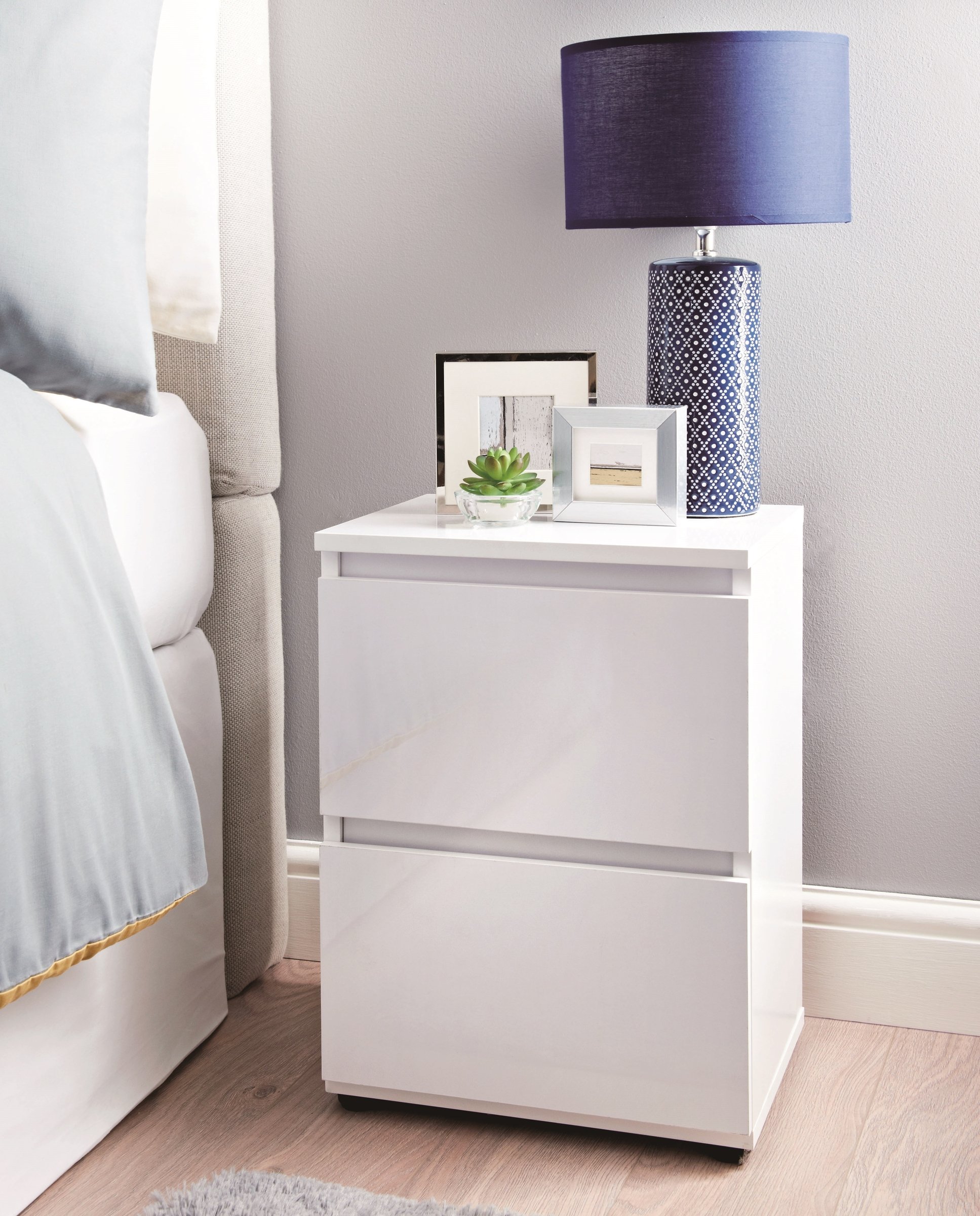 Dank des grifflosen Designs überzeugt die Nachtkommode mit einer eleganten, modernen Optik, die sich harmonisch in jedes zeitgemäße Schlafzimmer einfügt. Die zwei geräumigen Schubladen sorgen für Ordnung und lassen sich leicht öffnen, ohne das klare Design zu stören.