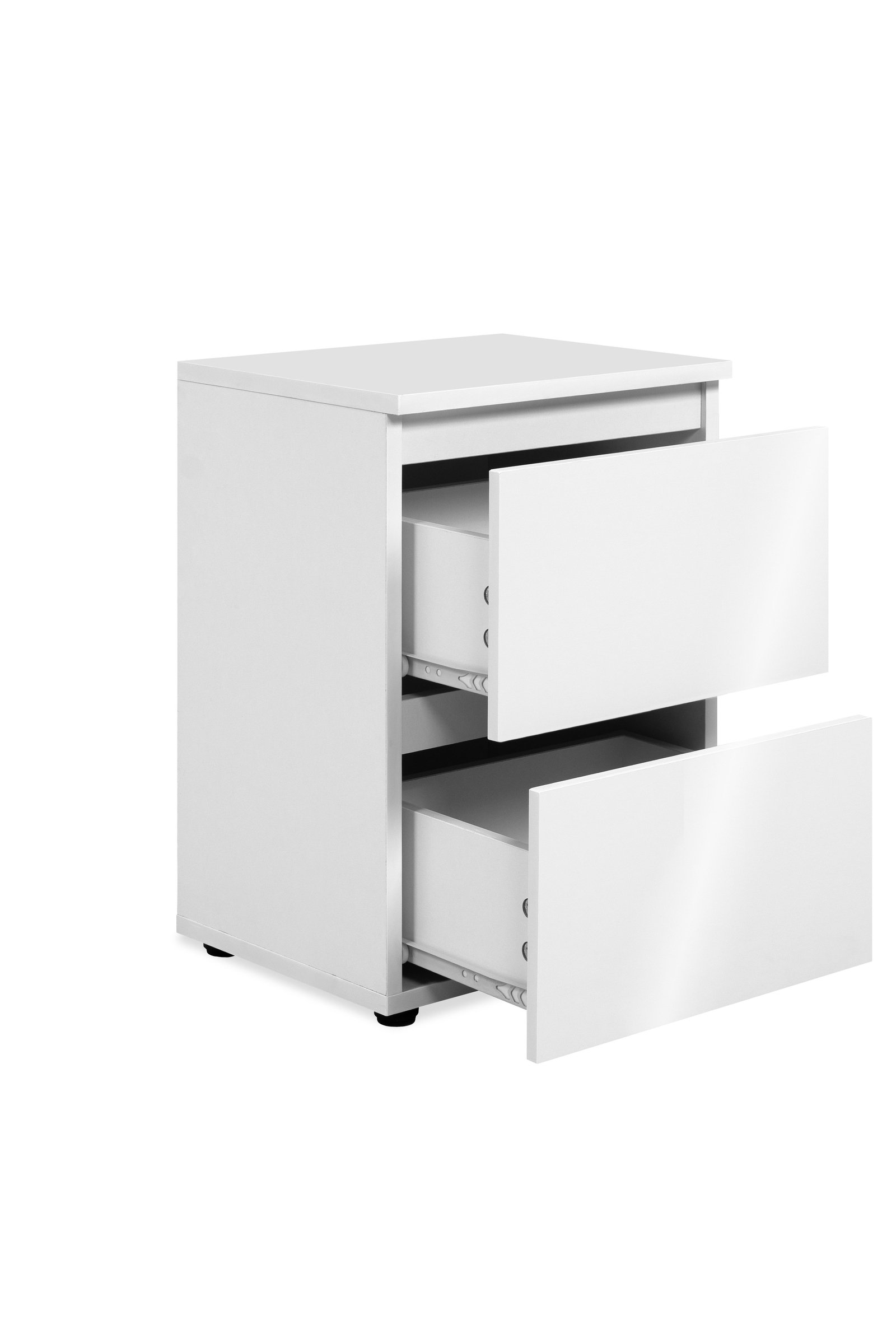 Die Farben können je nach Monitoreinstellung leicht von den Originalfarbtönen abweichen. Die Nachtkommode >Lulea< ist in weiß glänzend gehalten, mit schwarzen Kunststofffüßen.