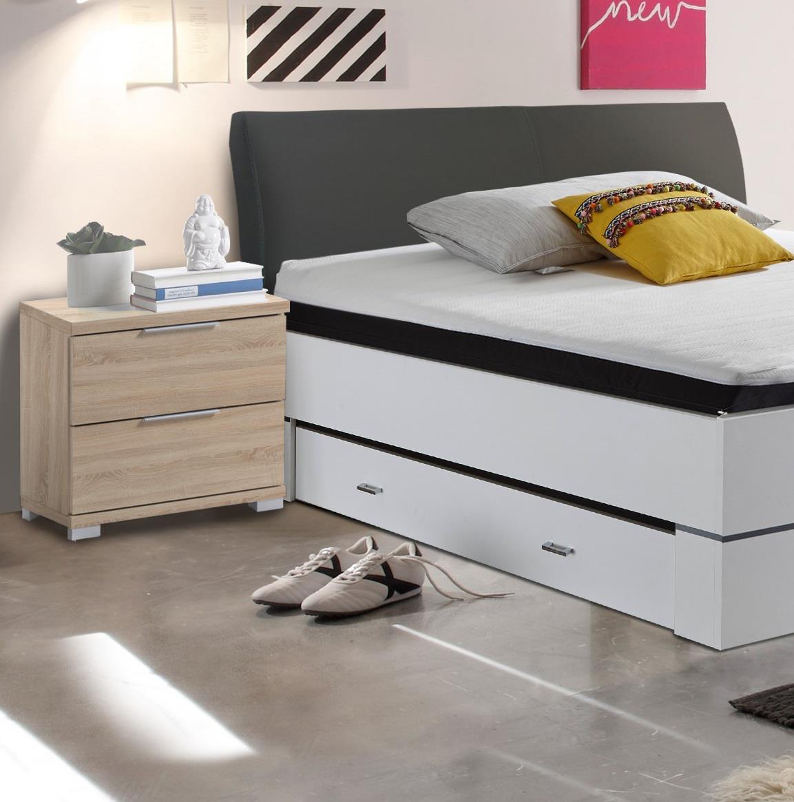Zwei Schubladen sorgen dafür, dass persönliche Dinge, wie Brille, Ladegeräte oder Pflegeprodukte, ordentlich verstaut und dennoch schnell erreichbar sind. Die Stangengriffe aus Kunststoff unterstützen den angenehmen Bedienkomfort und runden das moderne Erscheinungsbild ab.