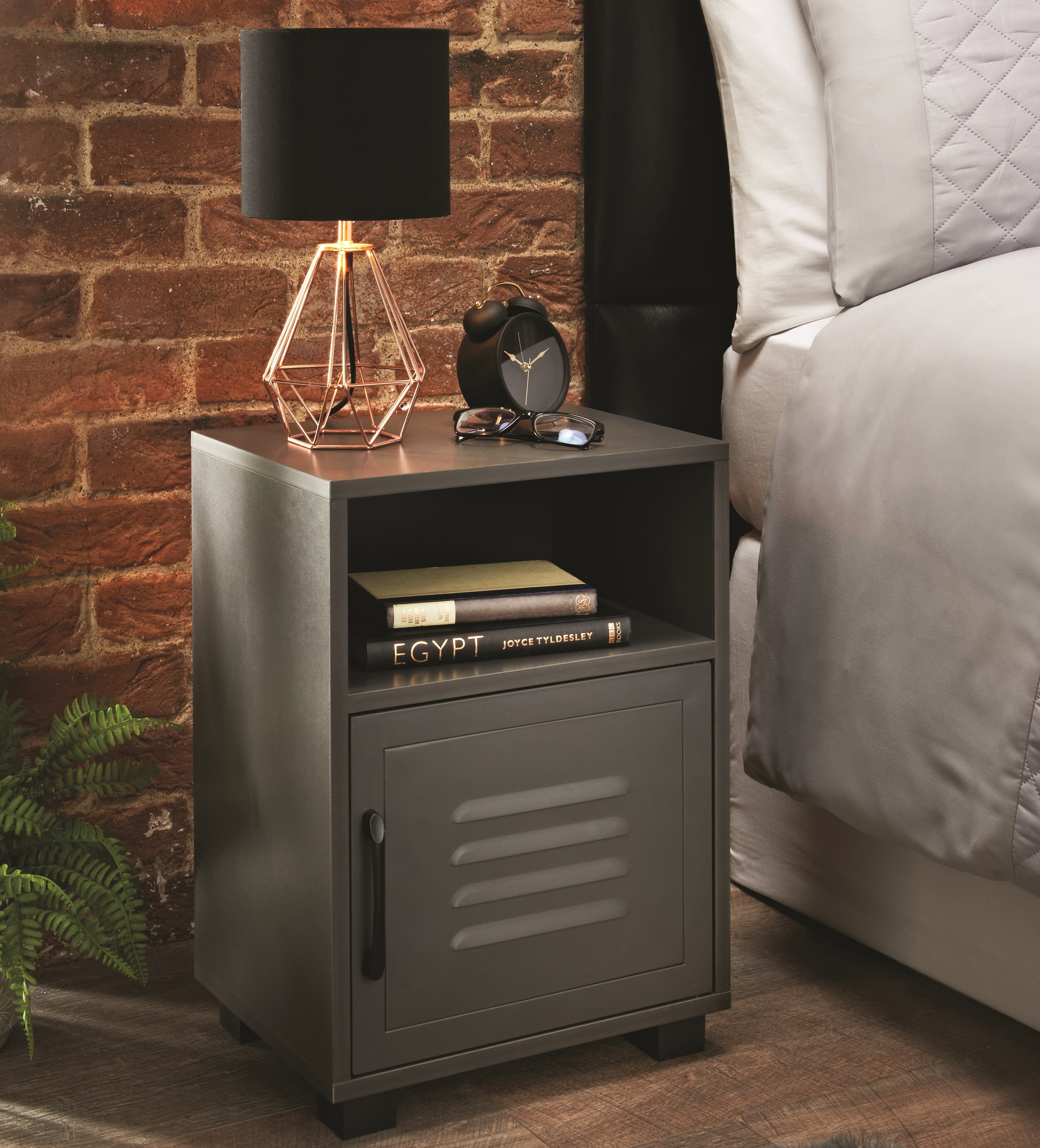 Dank einer Metalltür und einem offenen Fach kombiniert die Konsole geschlossenen Stauraum mit schneller Zugänglichkeit. Die dunkelgraue Oberfläche und die schwarzen Kunststofffüße verleihen ihr einen eleganten, zeitgemäßen Look, der sich harmonisch in jedes Schlafzimmerkonzept einfügt. Robuster Holzwerkstoff mit 15 mm Korpusstärke sorgt für Stabilität und Langlebigkeit.
