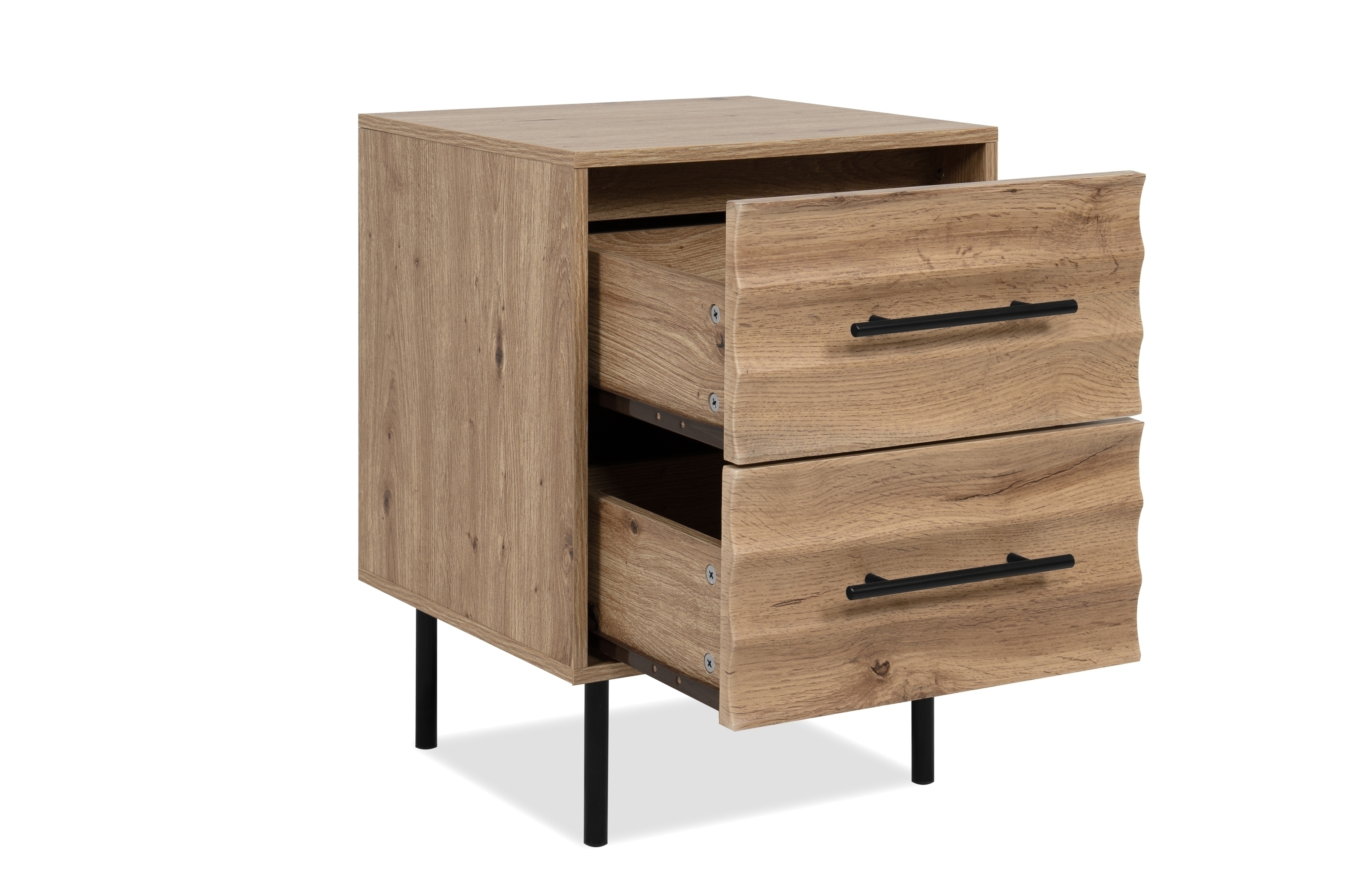 Dank zwei geräumiger Schubladen haben Bücher, Ladegeräte, Brillen oder persönliche Gegenstände direkt am Bett ihren festen Platz. Die pflegeleichte Oberfläche lässt sich einfach feucht abwischen, sodass die Kommode auch im täglichen Gebrauch lange wie neu aussieht.