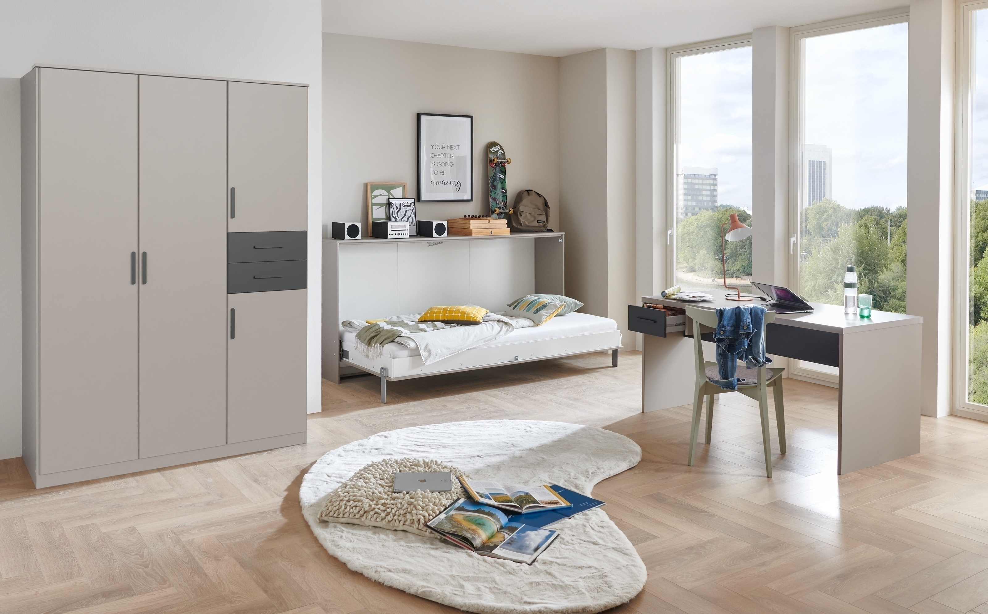 [cWert] => Modernes Design in SAHARAGRAU + WEISS mit Griffen in GRAFIT – stilvolle Optik passend zu zeitgemäßen Jugendzimmer Möbeln.