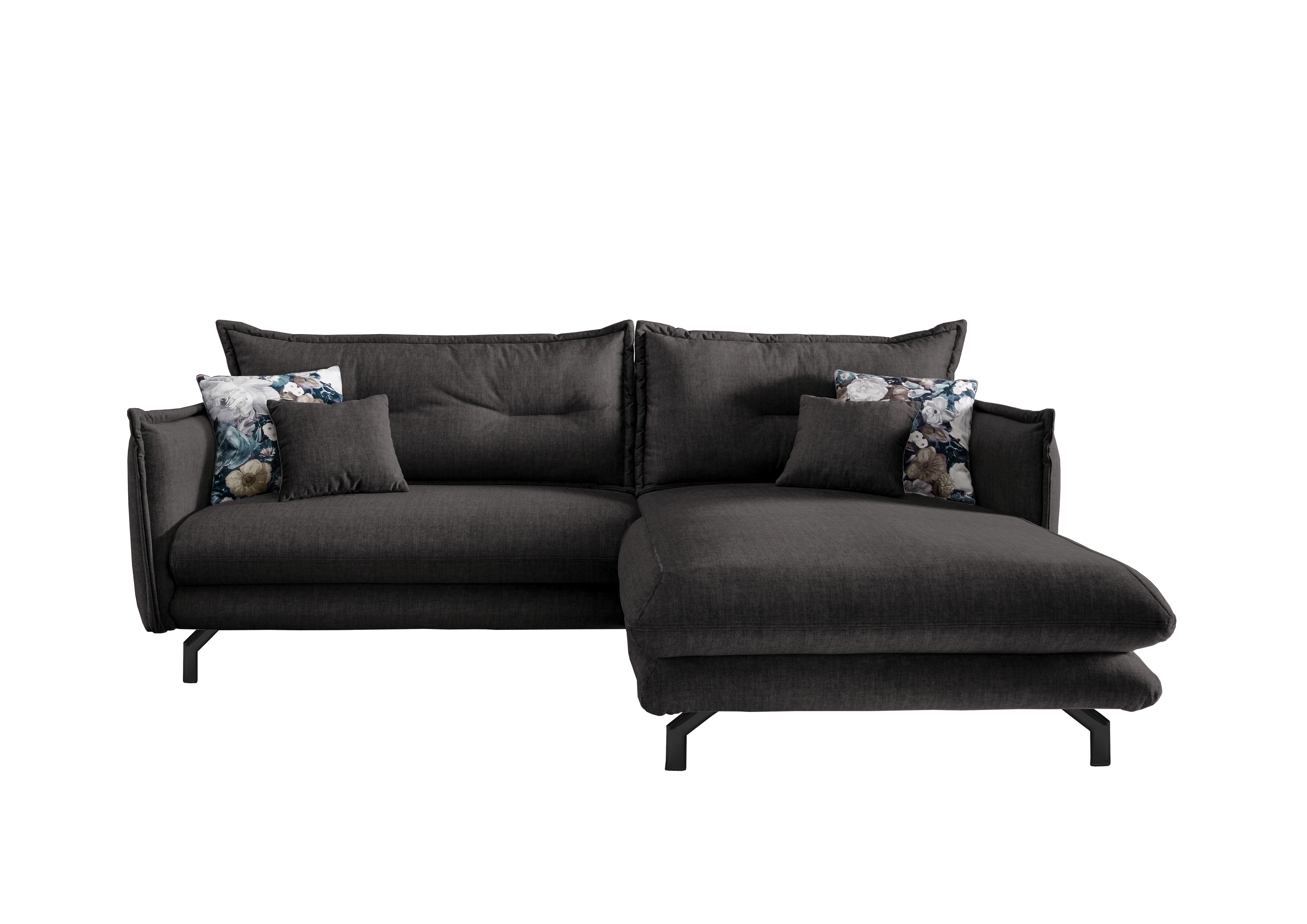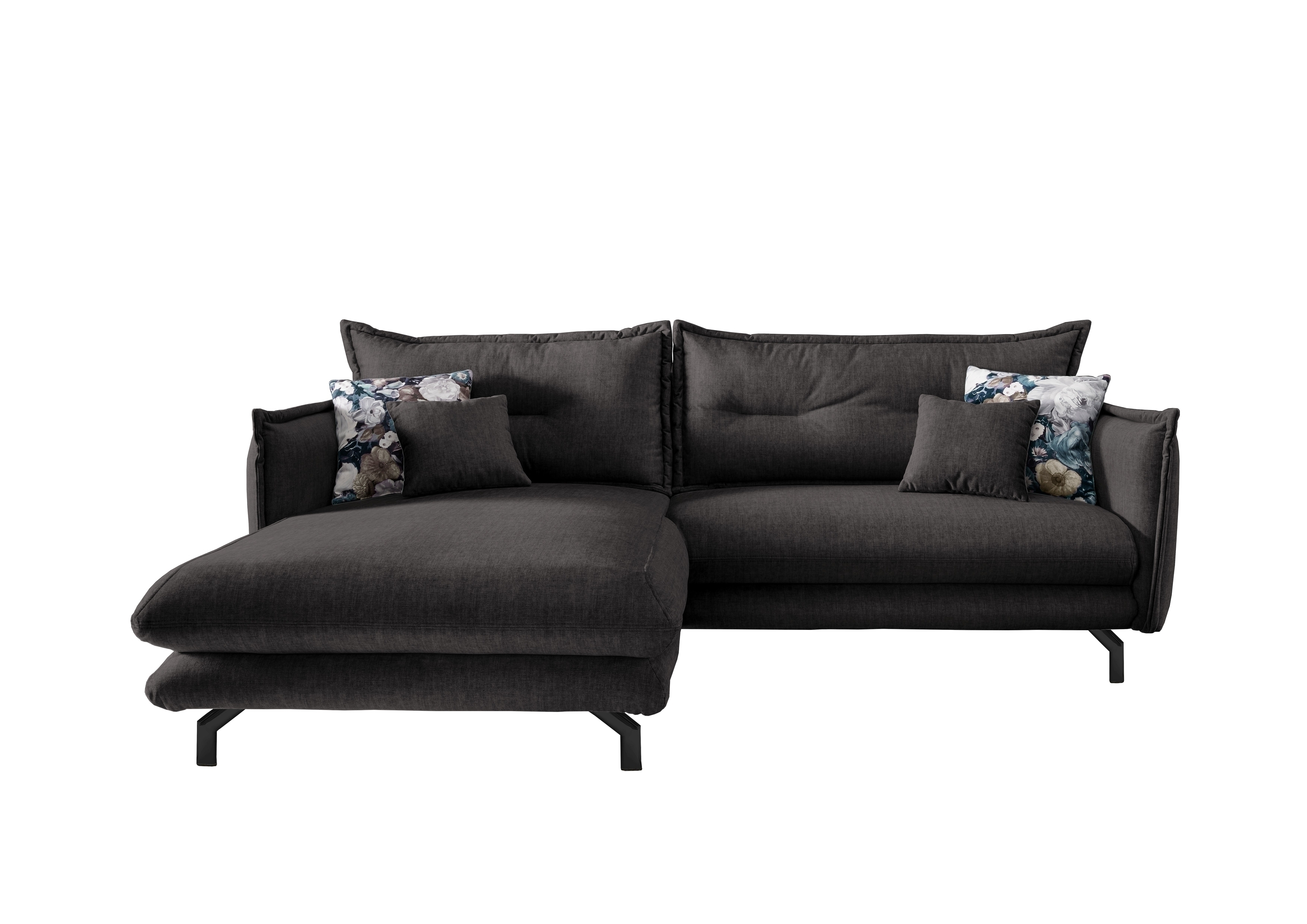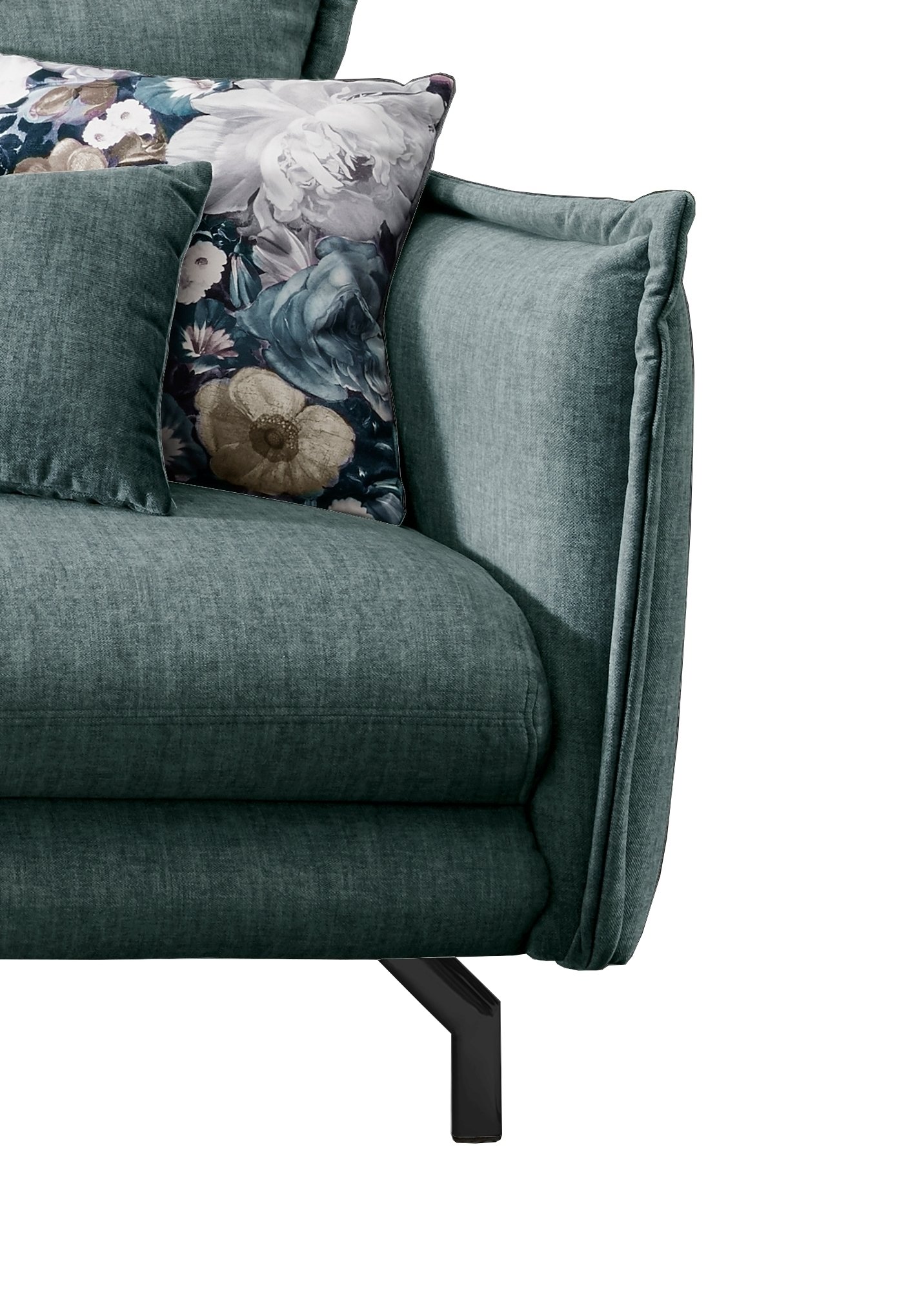 Verstellbare Armlehnen, zwei Zierkissen und zwei Wendekissen mit türkisfarbenem Blumenmuster sorgen für zusätzlichen Komfort und dekorative Akzente. Schwarze Metallfüße runden das moderne Erscheinungsbild ab und unterstreichen die solide Verarbeitung dieser Polsterecke der Serie Launce.