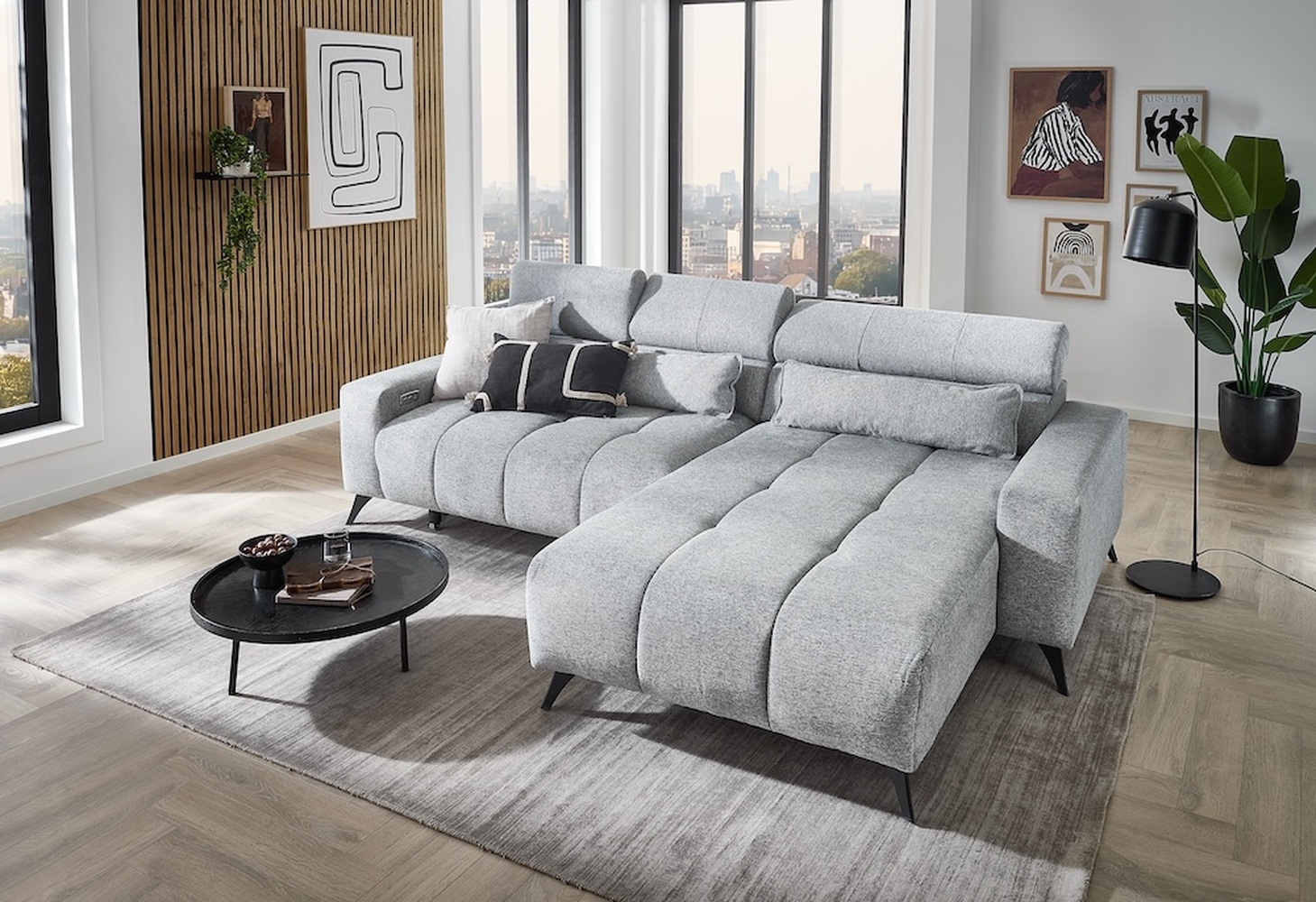[BulletPoints] => Polstergarnitur 267x185 cm in Stellvariante 004 rechts, Sitzhöhe 45 cm, Sitztiefe 67–127 cm, Liegefläche 221x127 cm – ideal für moderne Wohnlandschaften mit viel Platz.;Strukturstoff Aragon 80 in silbergrau, 95 % Polyester und 5 % Nylon, 340 g/m², mit 45.000–60.000 Scheuertouren – strapazierfähig, pflegeleicht und langlebig.;Hoher Sitzkomfort durch Nosagunterfederung mit Polyätherschaum, elektrische XL Sitztiefenverstellung bis +60 cm und manuell verstellbare Kopfteile.;Modernes Design mit kubischen Armlehnen, Waffelsteppung im Sitz, schwarzen Metallfüßen und 2 Nierenkissen, plus USB und USB-C Anschluss integriert.;Lieferumfang: Sitzelement links und Ottomane rechts inklusive 2 Kissen, Polstergarnitur wird teilmontiert geliefert und ist schnell einsatzbereit.