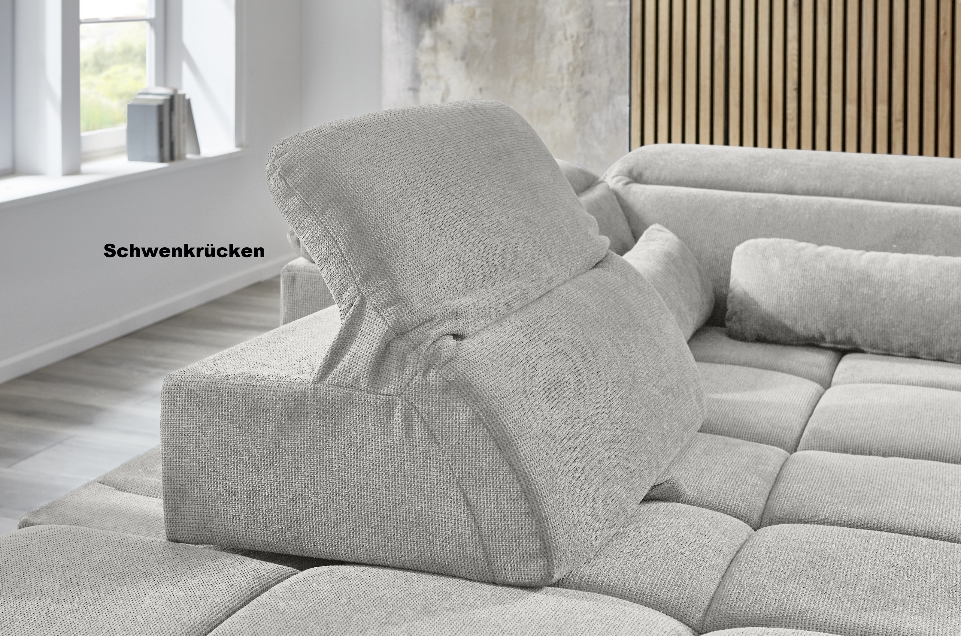 [BulletPoints] => Großzügige Abmessungen von 231x323cm bieten viel Platz und Komfort, ideal für Wohnräume mit großzügiger Stellfläche und flexible Sitzmöglichkeiten.;Bezug aus hochwertigem Aragon 80 Material aus 95 % Polyester und 5 % Nylon, robust, pflegeleicht und mit einer Scheuerbeständigkeit von bis zu 60.000 Touren.;Komfortabler Polsteraufbau mit Nosagunterfederung und Schaumstoff für angenehmes Sitzen, gepaart mit einer modernen kubischen Form und Waffelsteppung.;Individuelle Anpassung durch 5 manuell verstellbare Kopfteile und elektrische XXL-Sitztiefenverstellung (+60 cm) für ergonomisches Sitzen und Liegen.;Lieferzustand teilmontiert, bestehend aus 2-Sitzer rechts, Ecke und Ottomane links, einfacher Aufbau und leichter Transport durch 3-teilige Konstruktion.