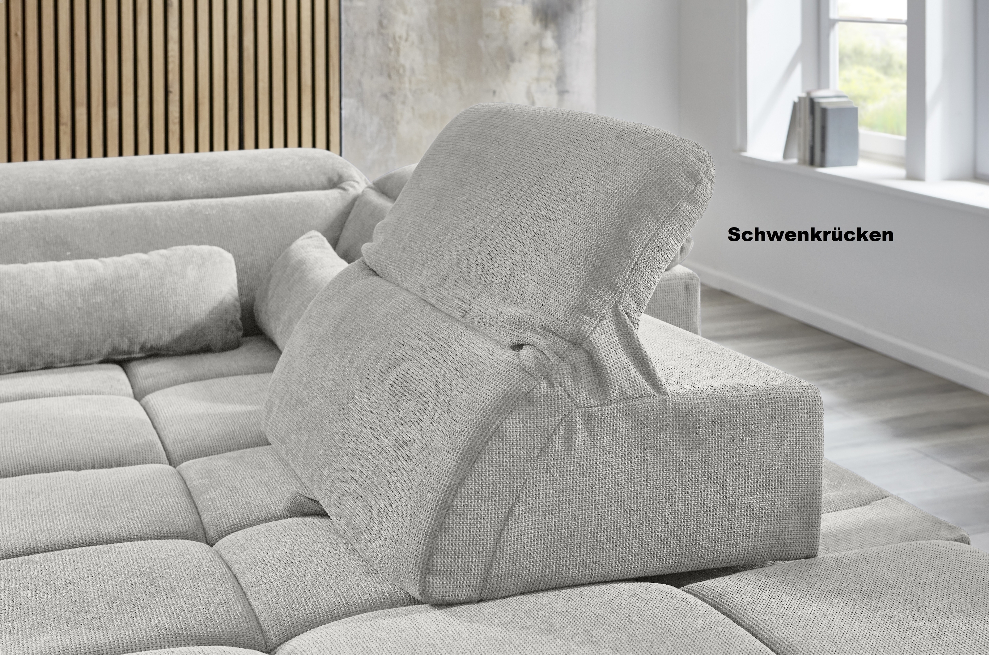[cWert] => Großzügige Abmessungen von 231x323cm bieten viel Platz und Komfort, ideal für Wohnräume mit großzügiger Stellfläche und flexible Sitzmöglichkeiten.;Bezug aus hochwertigem Aragon 80 Material aus 95 % Polyester und 5 % Nylon, robust, pflegeleicht und mit einer Scheuerbeständigkeit von bis zu 60.000 Touren.;Komfortabler Polsteraufbau mit Nosagunterfederung und Schaumstoff für angenehmes Sitzen, gepaart mit einer modernen kubischen Form und Waffelsteppung.;Individuelle Anpassung durch 5 manuell verstellbare Kopfteile und elektrische XXL-Sitztiefenverstellung (+60 cm) für ergonomisches Sitzen und Liegen.;Lieferzustand teilmontiert, bestehend aus 2-Sitzer rechts, Ecke und Ottomane links, einfacher Aufbau und leichter Transport durch 3-teilige Konstruktion.