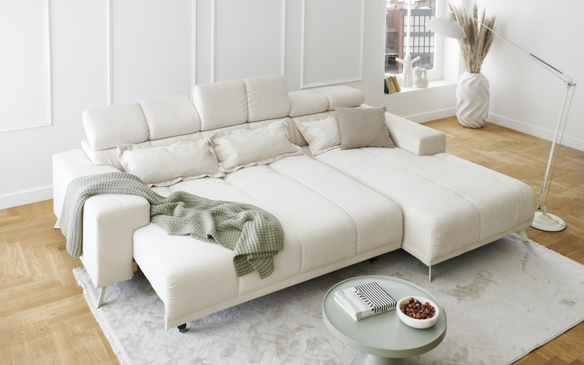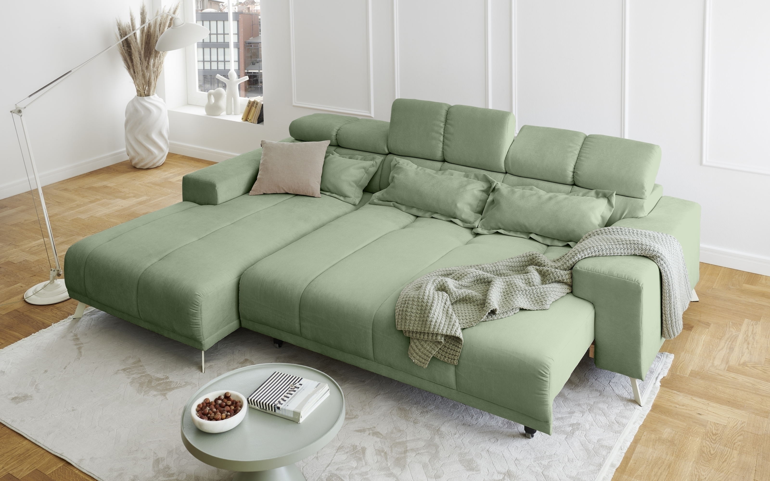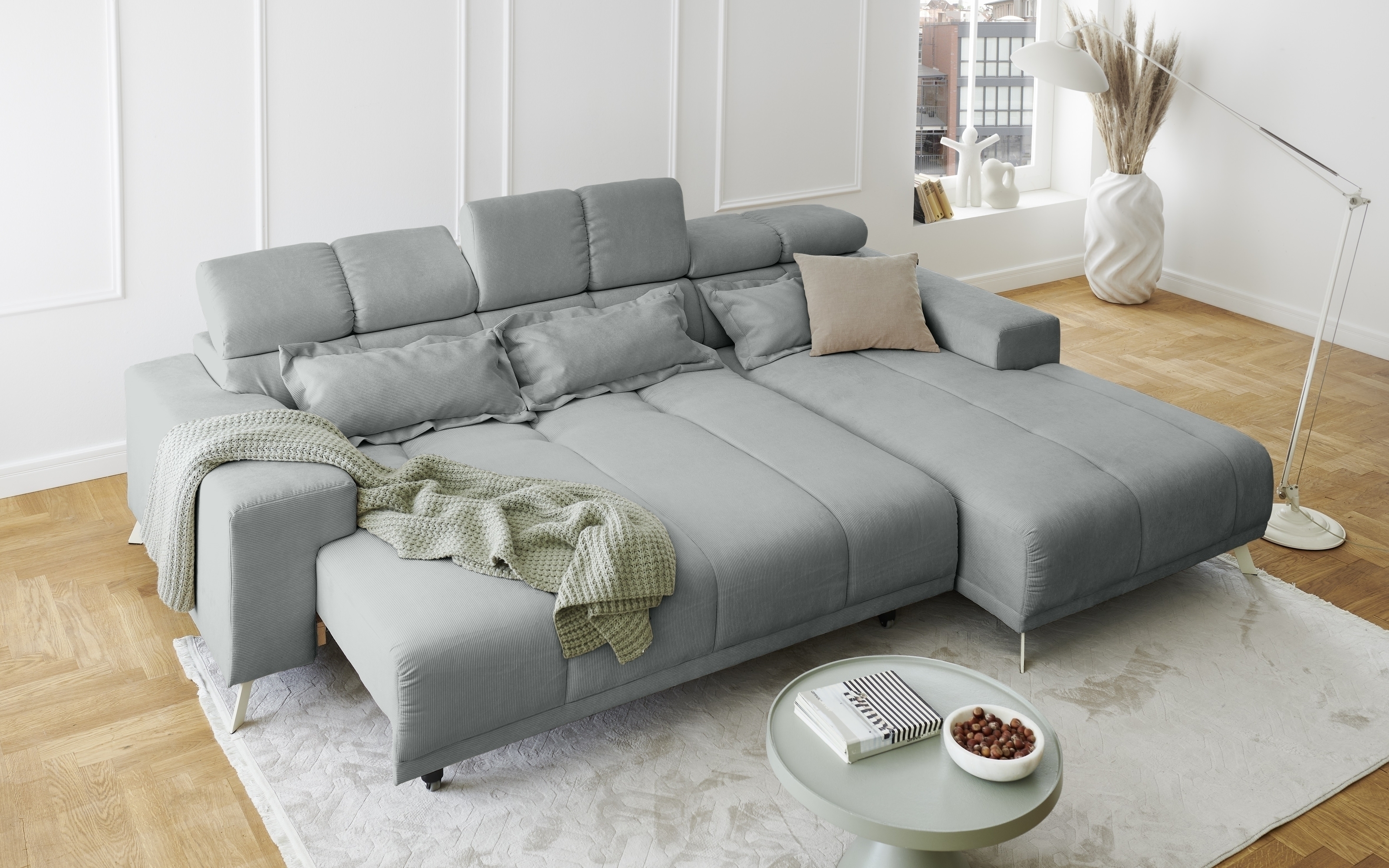Polstergarnitur Sally Ottomane rechts – Polsterecke mit elektrischer Sitztiefenverstellung und Feincord-Bezug