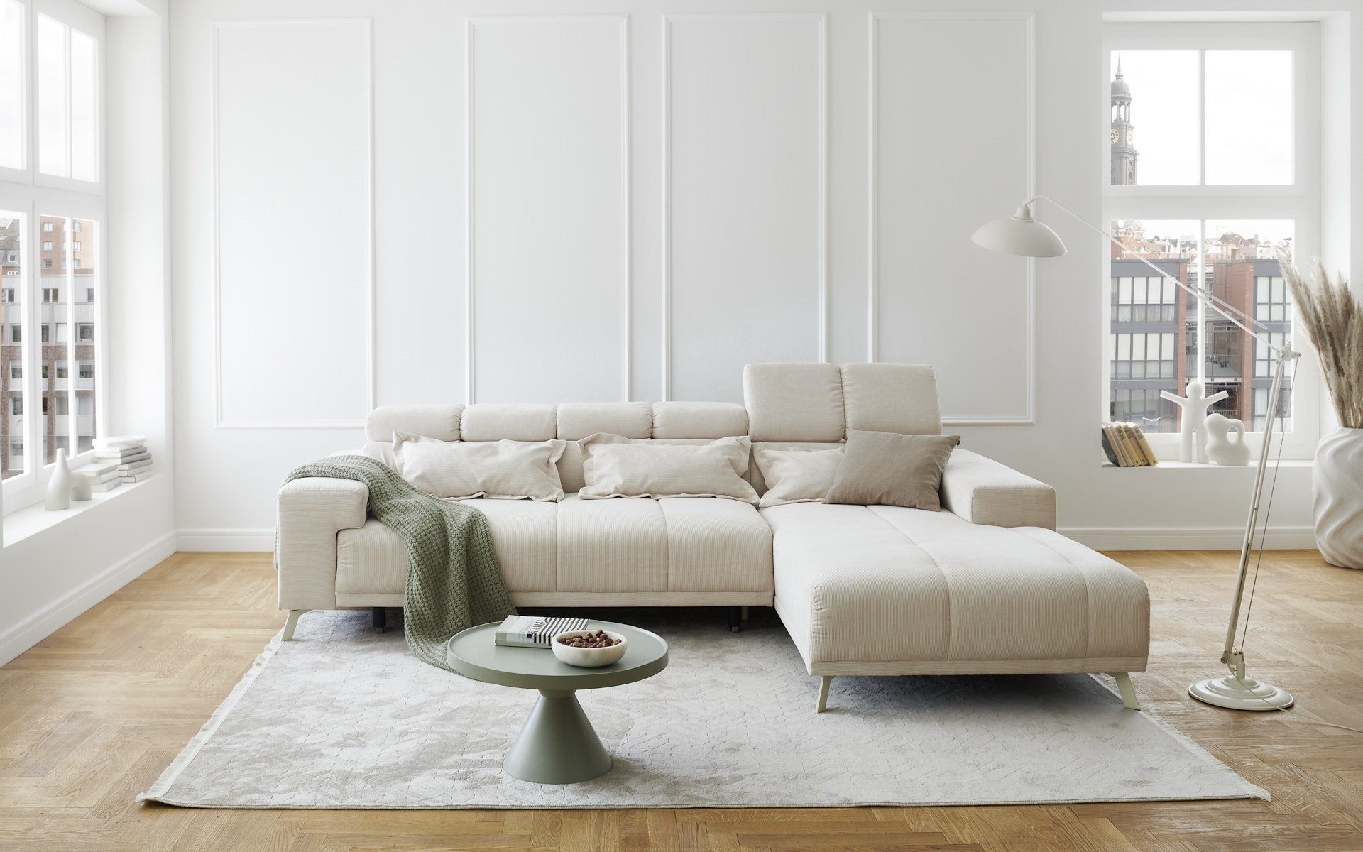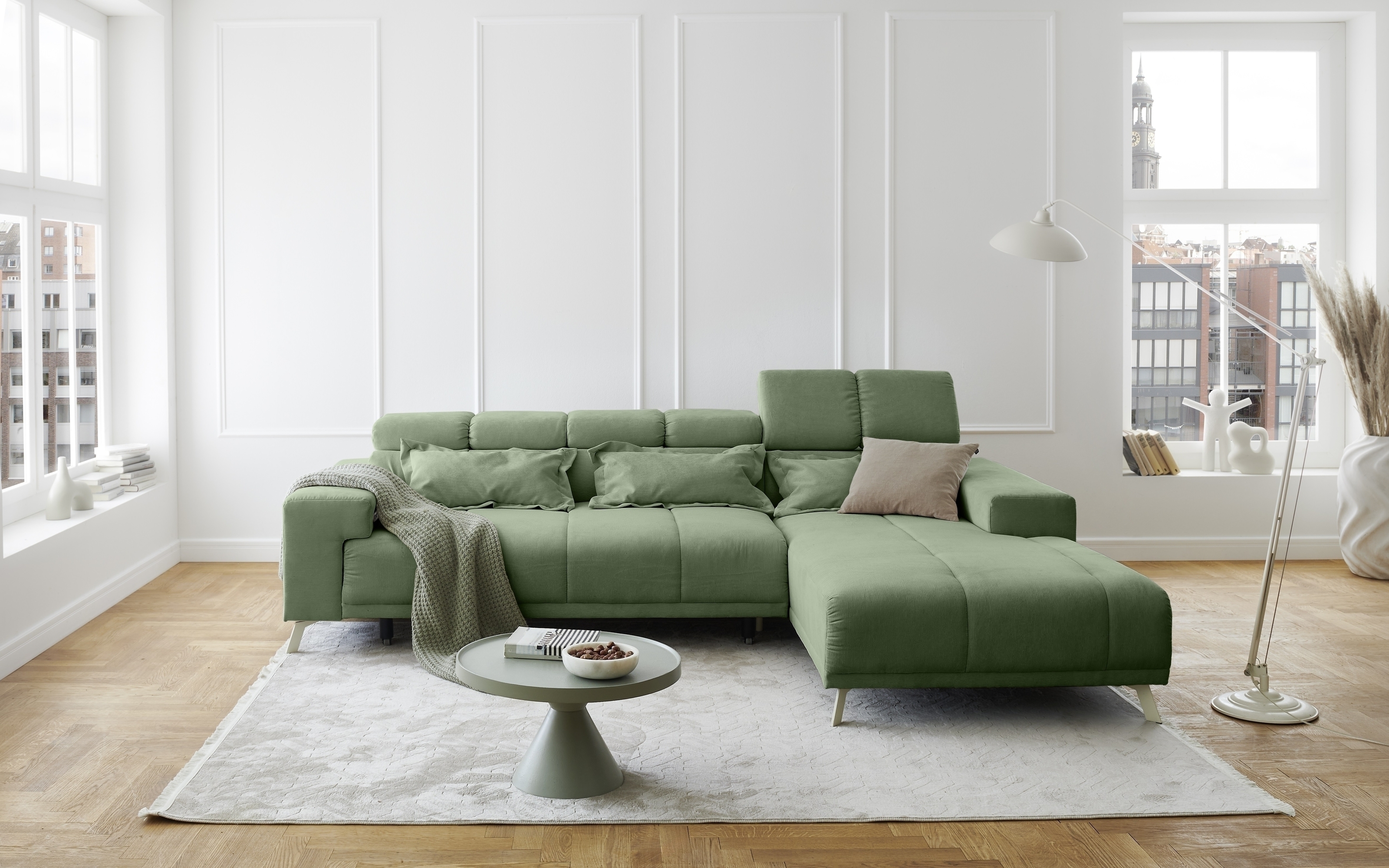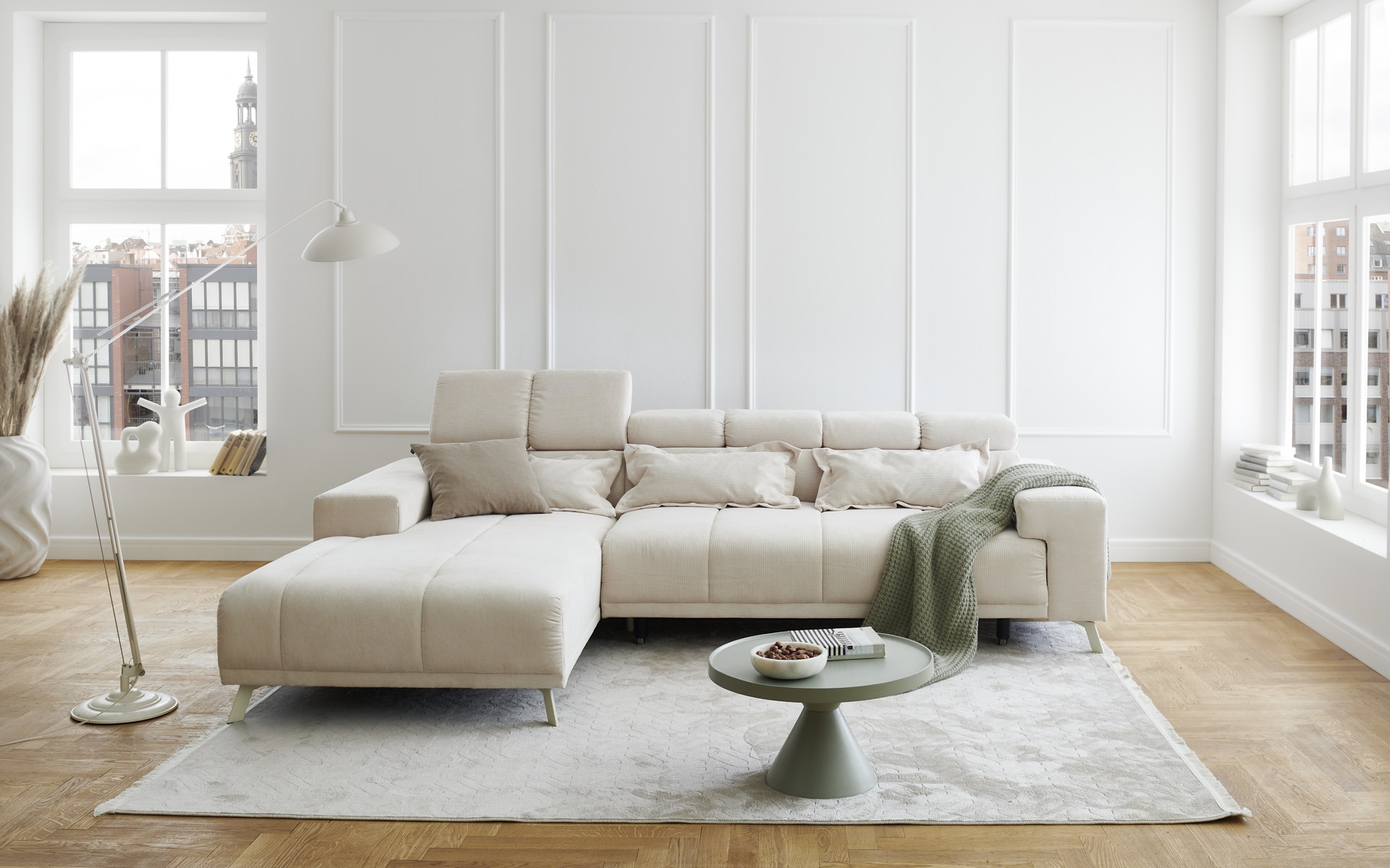 Polstergarnitur Sally Ottomane rechts – Polsterecke mit elektrischer Sitztiefenverstellung und Feincord-Bezug