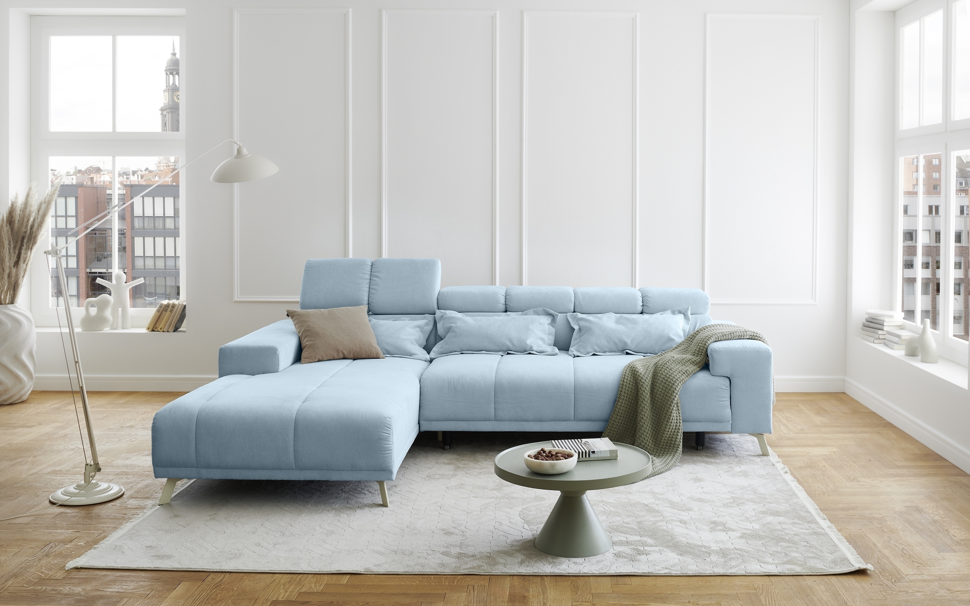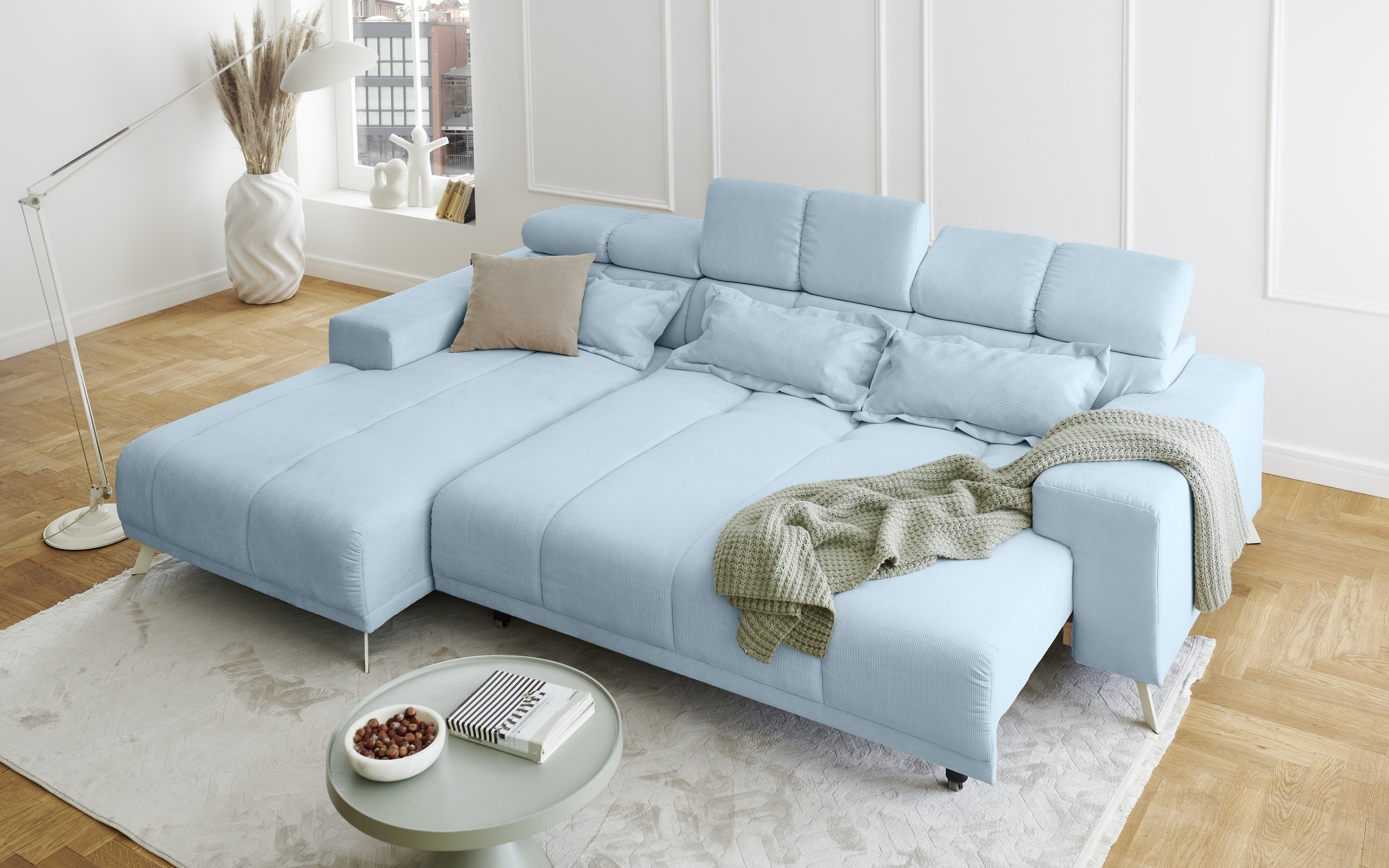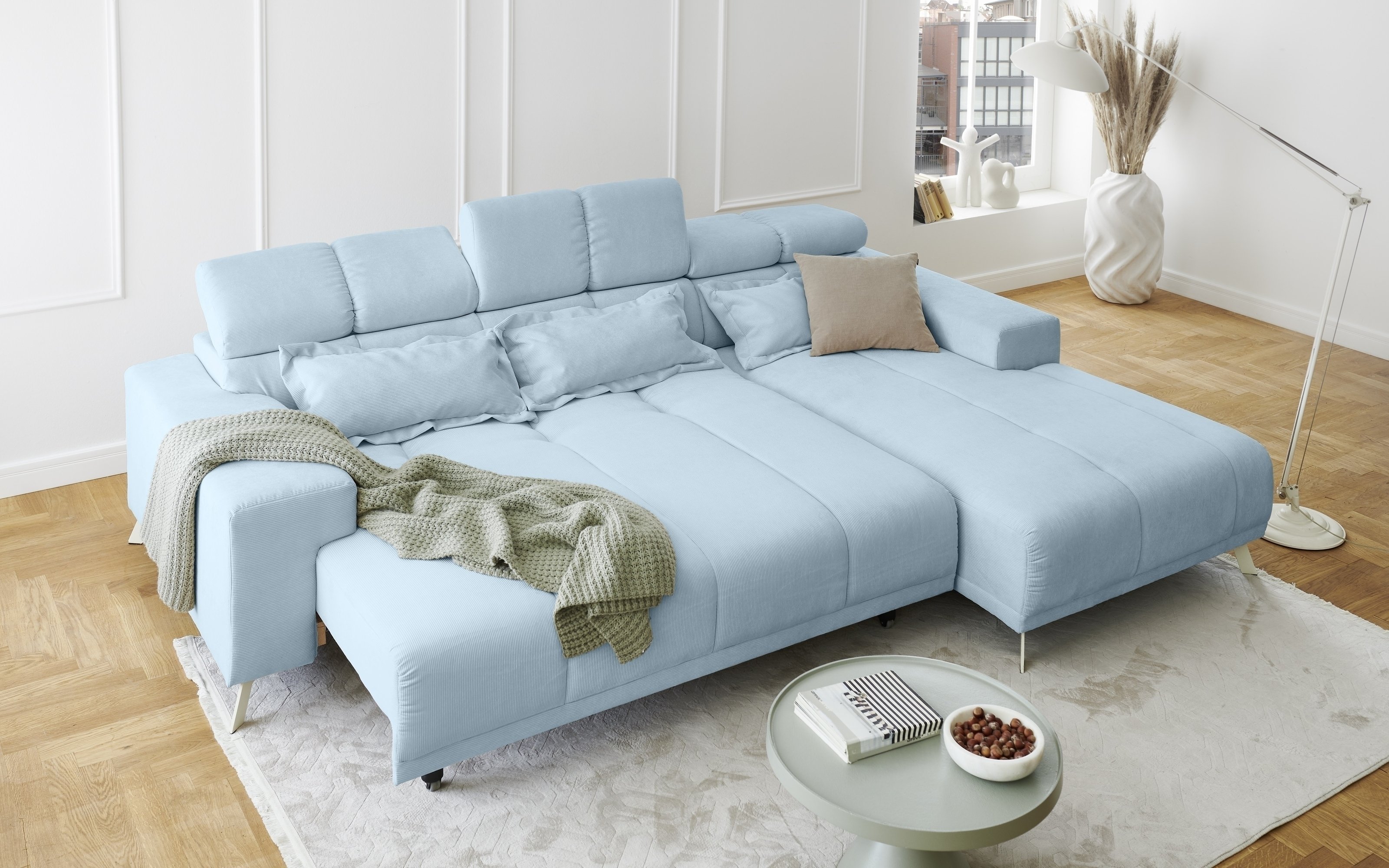 [cWert] => Sally Polstergarnitur Ottomane links mit großzügigen Maßen 285x201x79 cm bietet reichlich Platz für Entspannung in modernem hellblauem Fjord 83 Feincord.