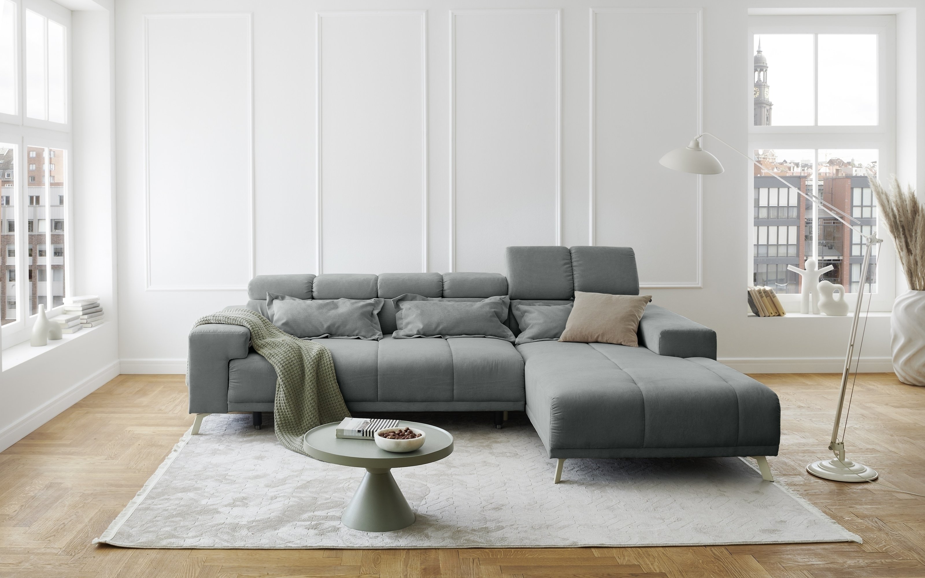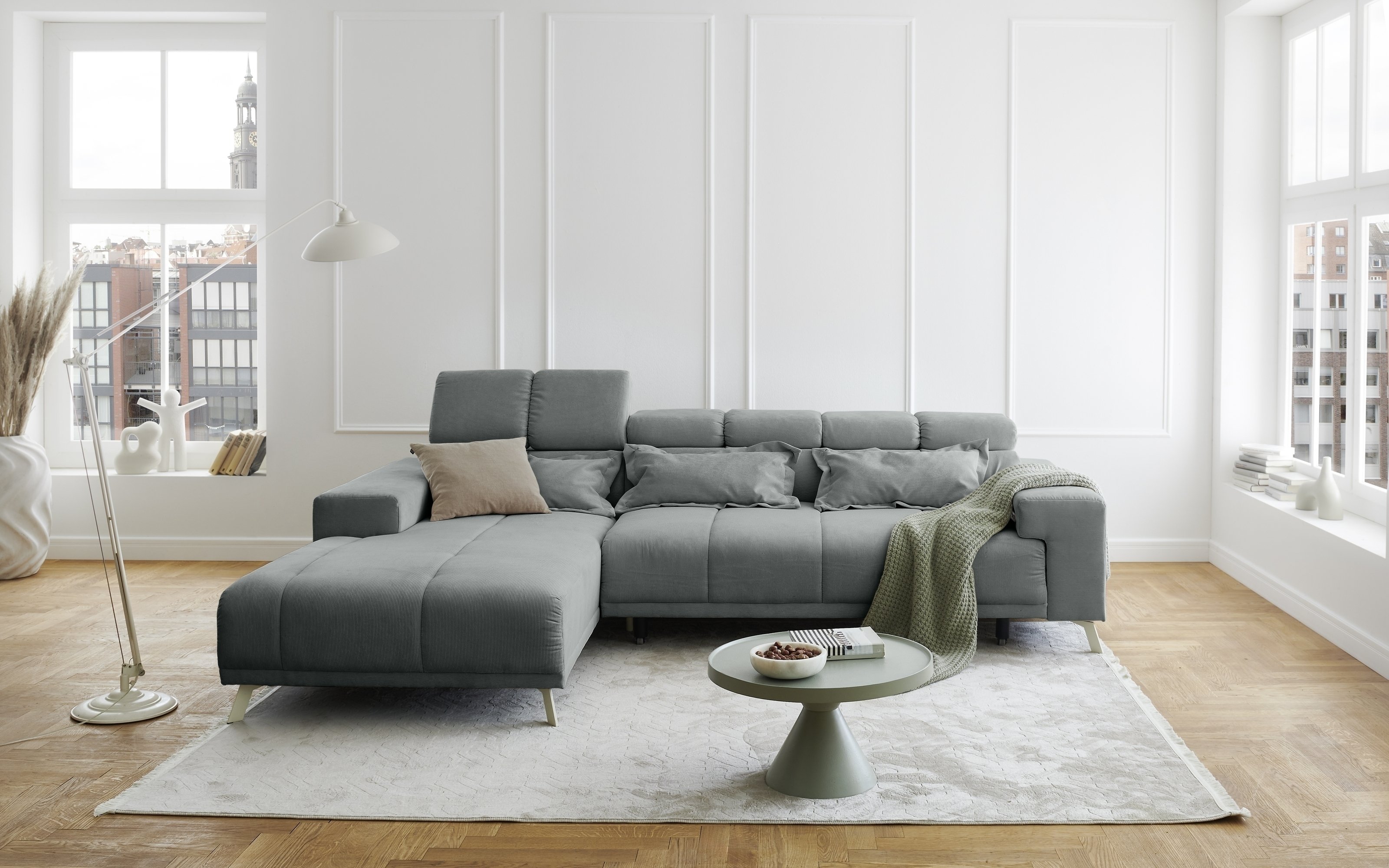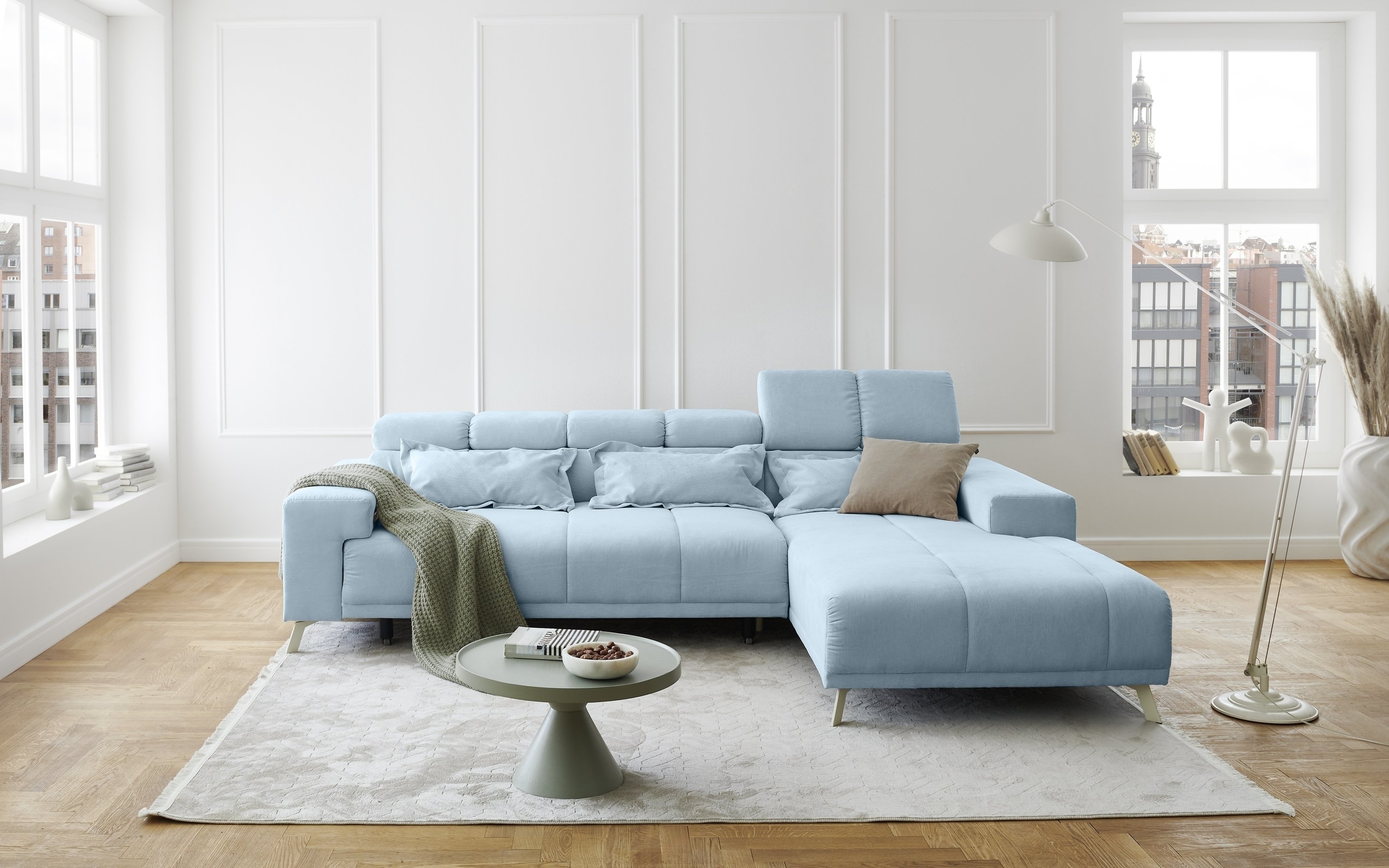 [cWert] => Sally Polstergarnitur Ottomane links mit großzügigen Maßen 285x201x79 cm bietet reichlich Platz für Entspannung in modernem hellblauem Fjord 83 Feincord.