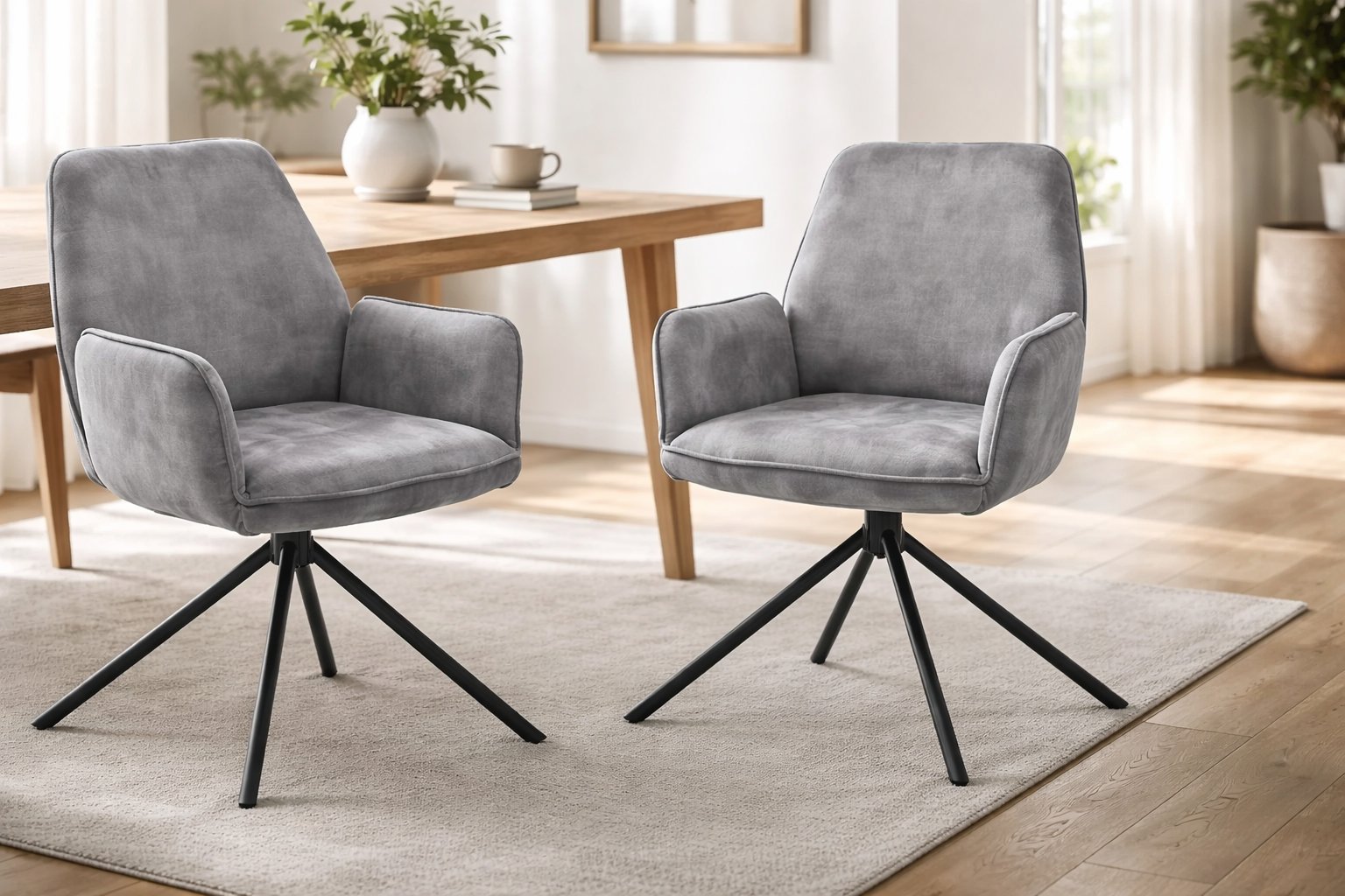 [cKurzBeschreibung] => Moderner Esszimmerstuhl mit Armlehnen im praktischen 2-er Set, Bezug mit Vintage-Veloursoptik aus 100% Polyester in Grau, Gestell aus Metall in Schwarz matt lackiert. Breite 60 cm, Höhe 89 cm, Tiefe 64 cm