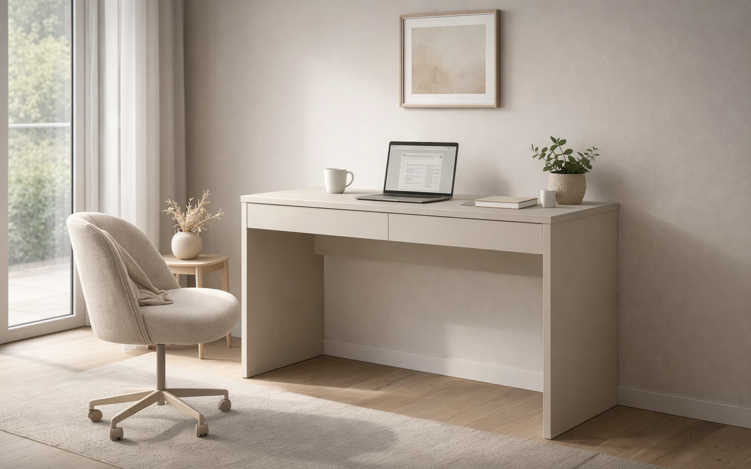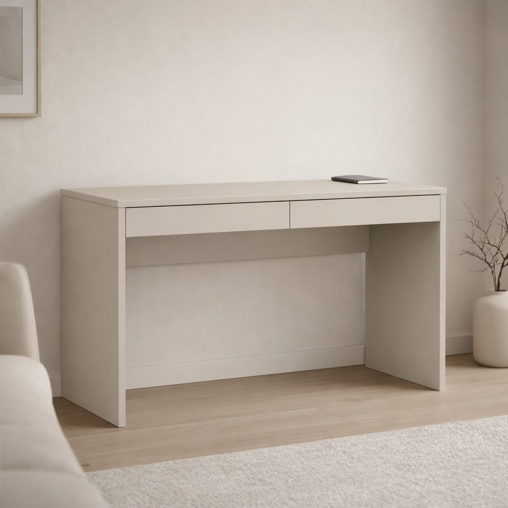 [BulletPoints] => Schreibtisch in Sand mit den Maßen 124,8 cm Breite, 77,3 cm Höhe und 53,1 cm Tiefe – ideal für Homeoffice und kleine Arbeitsbereiche mit viel Platz zum Arbeiten.;Robuster Schreibtisch aus langlebiger Spanplatte, Tischplatte und Korpus in harmonischer Sandfarbe für eine moderne und freundliche Büroeinrichtung.;Praktischer Arbeitsplatz mit 2 Schubladen und hochwertigem Vollauszug für leichtgängigen Zugriff auf Bürobedarf und wichtige Unterlagen.;Belastbare Tischplatte mit bis zu 50 kg Tragkraft, perfekt geeignet für Monitore, Drucker und weiteres Büro-Equipment für effizientes Arbeiten.;Der Schreibtisch wird zerlegt geliefert und lässt sich dank übersichtlicher Anleitung einfach und schnell selbst montieren, ideal für flexible Einrichtung.