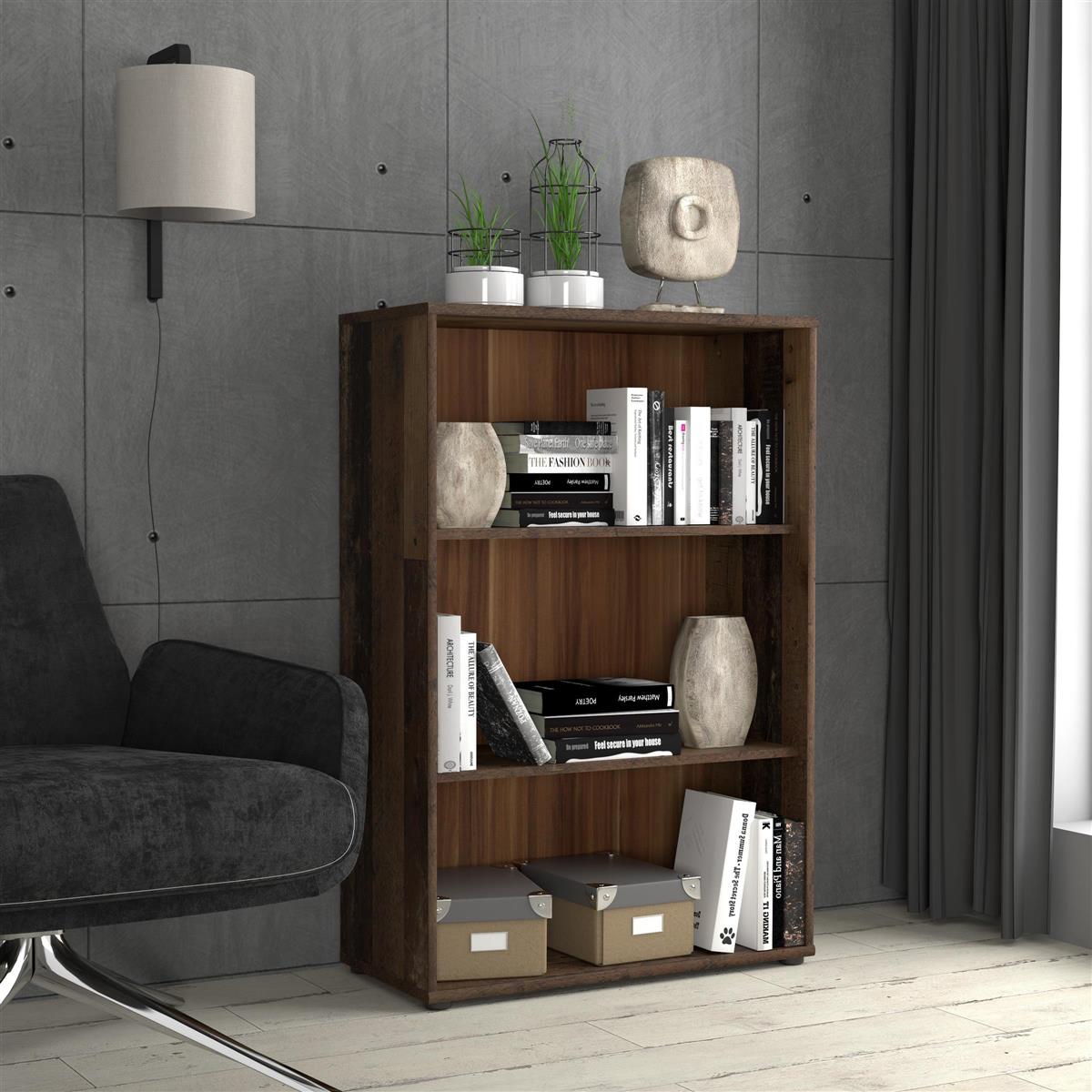 Die Nachbildung in Old Wood Vintage verleiht dem Regal einen warmen, wohnlichen Charakter und unterstreicht den modernen Wohnstil. Mit seinen Maßen von ca. 73,7 cm Breite, 111,1 cm Höhe und 34,8 cm Tiefe lässt sich das Möbelstück gut in Wohnzimmer, Esszimmer, Flur, Schlafzimmer oder Arbeitszimmer integrieren, ohne den Raum zu überladen.