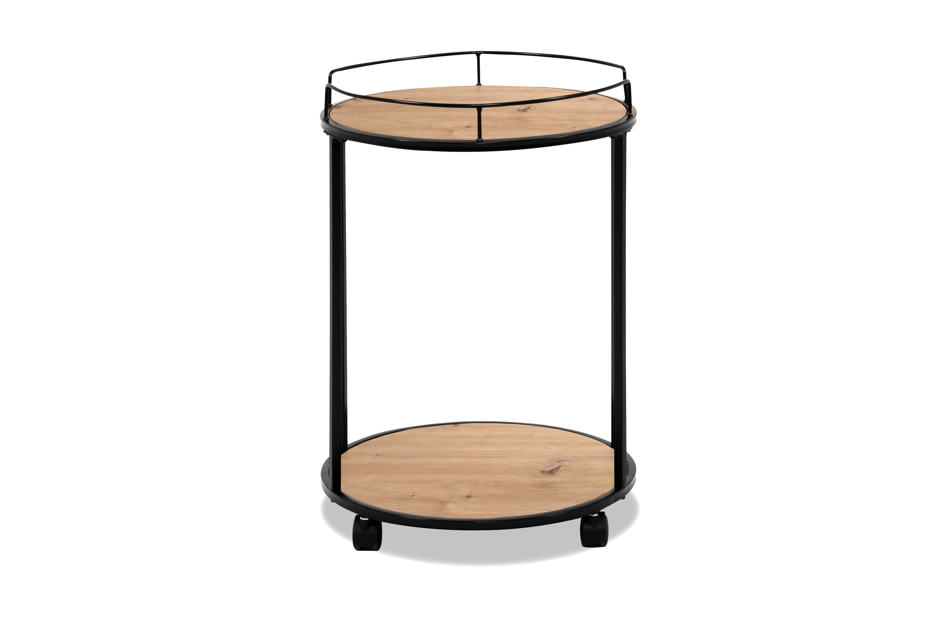 [BulletPoints] => Maße & Form: Moderner Beistelltisch Trelleborg mit kompakten Maßen 44 x 68 x 44 cm (B/H/T), ideal als Ablage oder zusätzlicher Tisch im Wohn- und Küchenbereich;Material & Stabilität: Robuste Tischplatte aus MDF Holzwerkstoff mit 1,2 cm Stärke auf stabilem Metallgestell in Schwarz für sicheren Stand und lange Haltbarkeit;Design & Farbe: Stilvoller runder Beistelltisch in warmem Artisan Oak Dekor mit schwarzem Metallgestell, passend für moderne Wohnzimmer, Küchen oder multifunktionale Räume;Funktion & Mobilität: Mit 2 Ablageböden und 4 Rollen ausgestattet, leicht beweglich, flexibel einsetzbar für Getränke, Dekoration, Bücher oder Küchenutensilien;Lieferzustand & Montage: Beistelltisch wird zerlegt geliefert, kompakt verpackt, leichtes Gesamtgewicht von 3,5 kg ermöglicht einfachen Transport und schnelle Montage