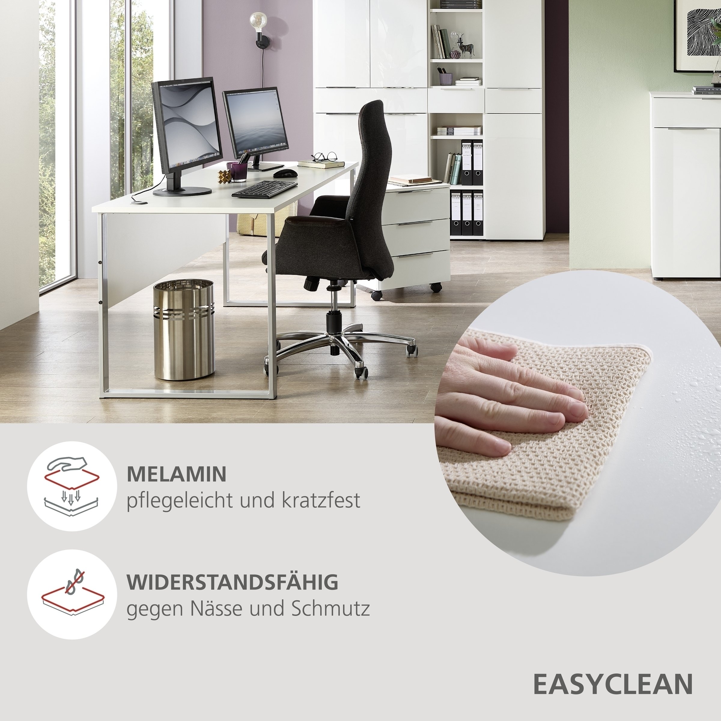 [cWert] => Großzügige Maße von 170/77/73 cm (B/H/T) bieten viel Arbeitsfläche für Homeoffice, Büro oder Jugendzimmer und ermöglichen komfortables, strukturiertes Arbeiten mit ausreichend Platz.;Moderne Optik in Weiß mit silberfarbenen Metallfüßen – ideal kombinierbar mit verschiedenen Einrichtungsstilen von minimalistisch bis zeitgemäß und funktional gestaltet.;Robuste beschichtete Spanplatte aus Holzwerkstoffen mit widerstandsfähiger Melaminbeschichtung – pflegeleicht, strapazierfähig und für den täglichen Gebrauch geeignet.;Integrierte 2 Kabeldurchlässe in der Tischplatte sorgen für eine ordentliche Kabelführung und unterstützen einen aufgeräumten Arbeitsplatz ohne sichtbaren Kabelsalat.;Lieferung erfolgt zerlegt in 2 Packstücken inklusive Aufbauanleitung – einfache Selbstmontage für einen schnellen und unkomplizierten Aufbau im Wunschraum.
