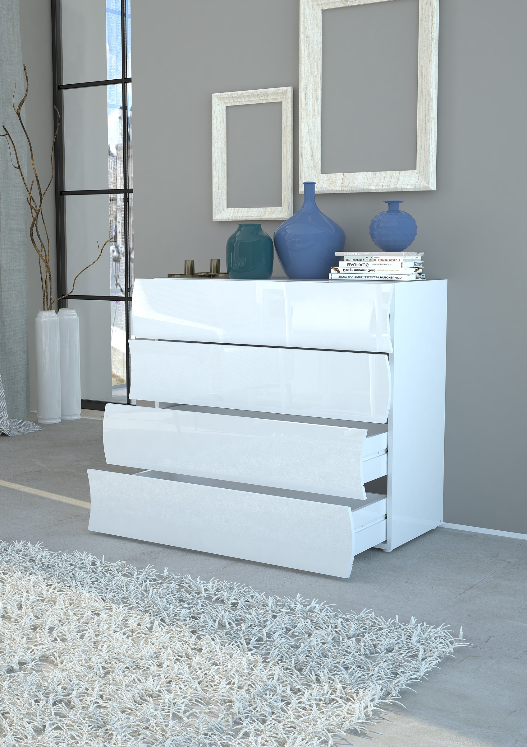 [metaDescription] => Moderne Kommode aus Spanplatte in Weiß-Hochglanz mit 4 Schubkästen Breite 98 cm, Höhe 81,5 cm, Tiefe 40 cm