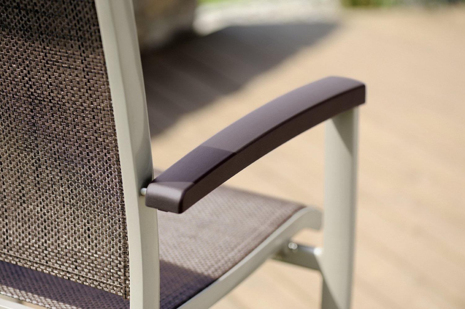 [Bullet-Point 2] => Hochwertiges Gestell aus Aluminium in Champagner und strapazierfähiges Textilux®-Kunstfasergewebe in Mocca.