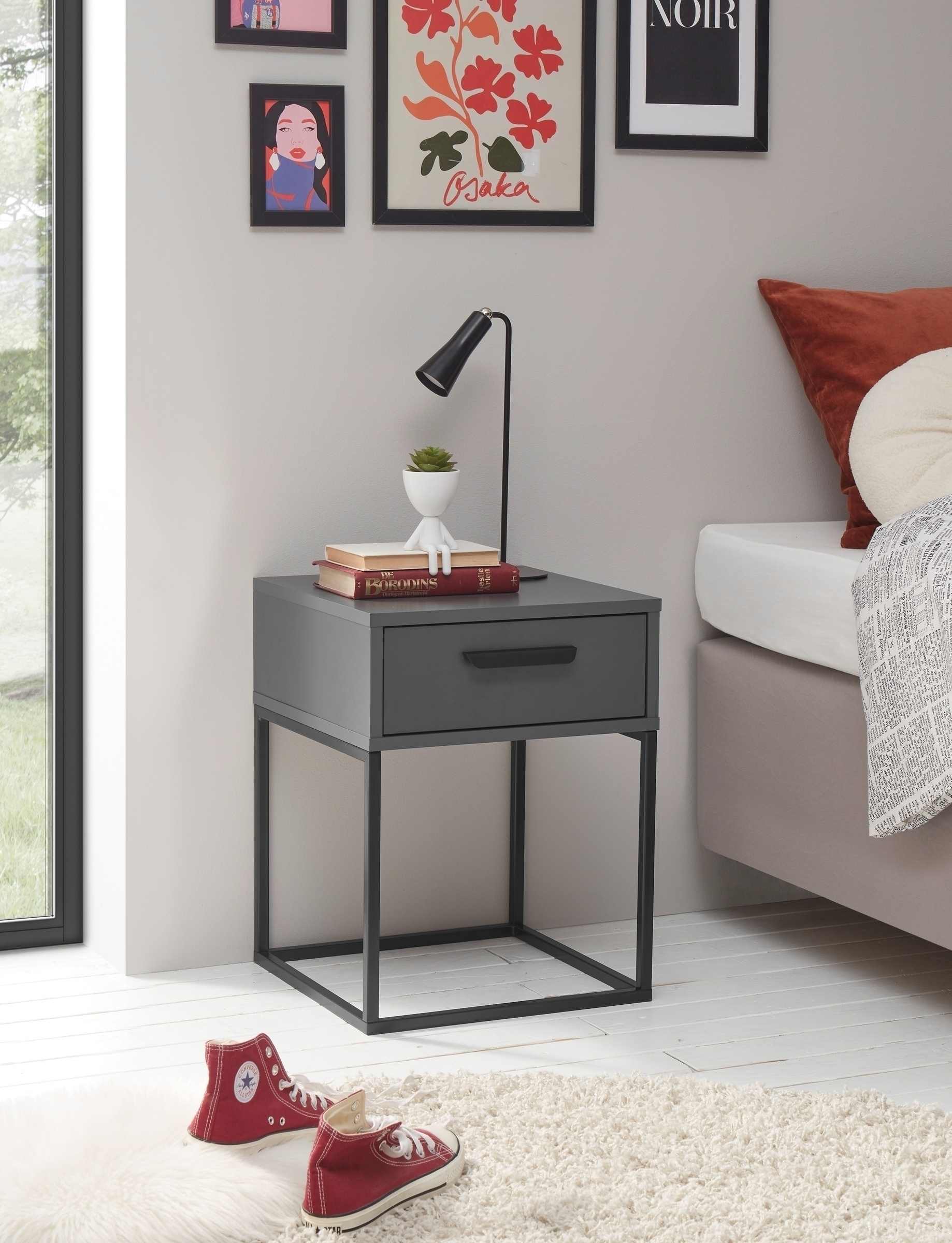 Gefertigt aus einem Korpus aus Spanplatte und einem Metallgestell ist der Nachttisch auf den täglichen Gebrauch im Schlafzimmer ausgelegt. Die pflegeleichten Oberflächen lassen sich mit den im Produkt- und Materialpass beschriebenen Pflegehinweisen leicht sauber halten. Dank der zerlegten Lieferung und der detaillierten Aufbauanleitung gelingt der Aufbau einfach und komfortabel; das benötigte Montage-Material ist bereits im Lieferumfang enthalten.