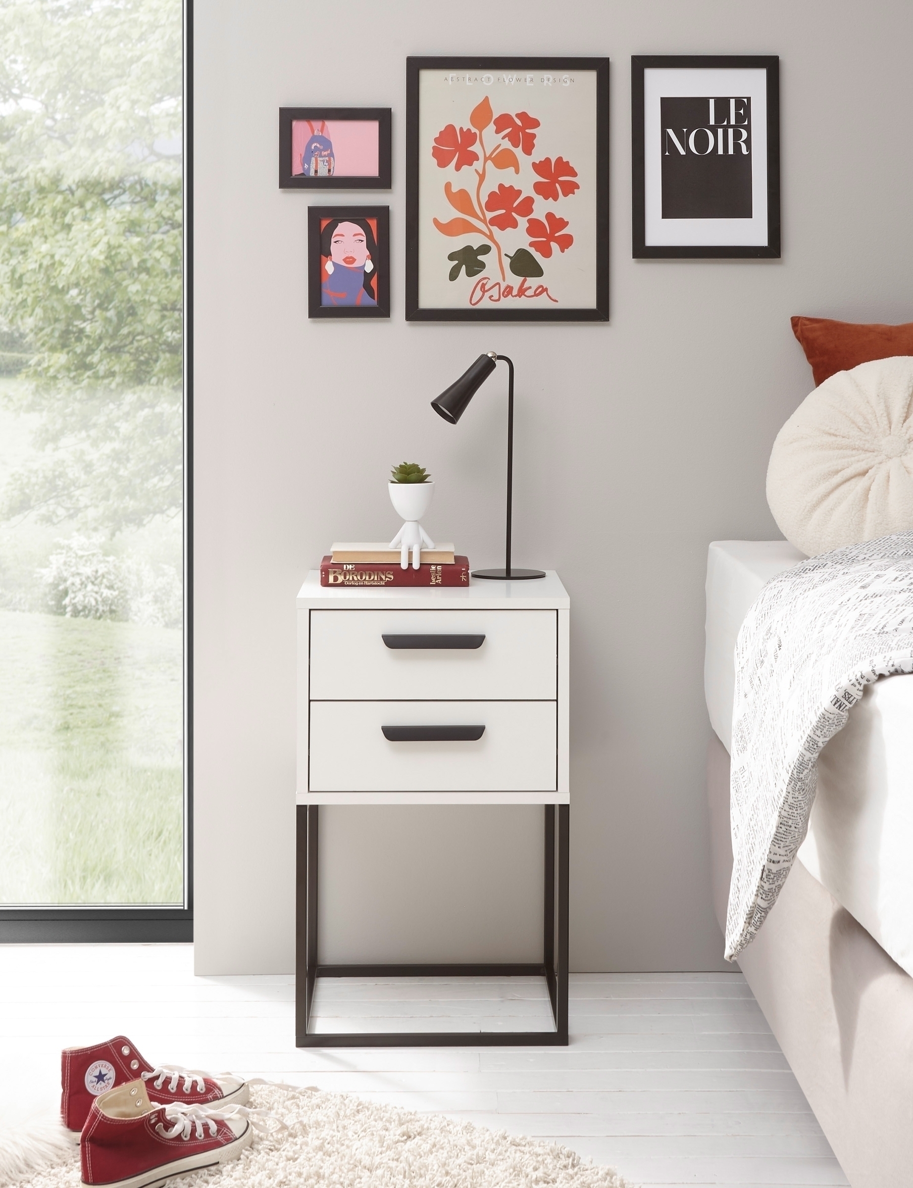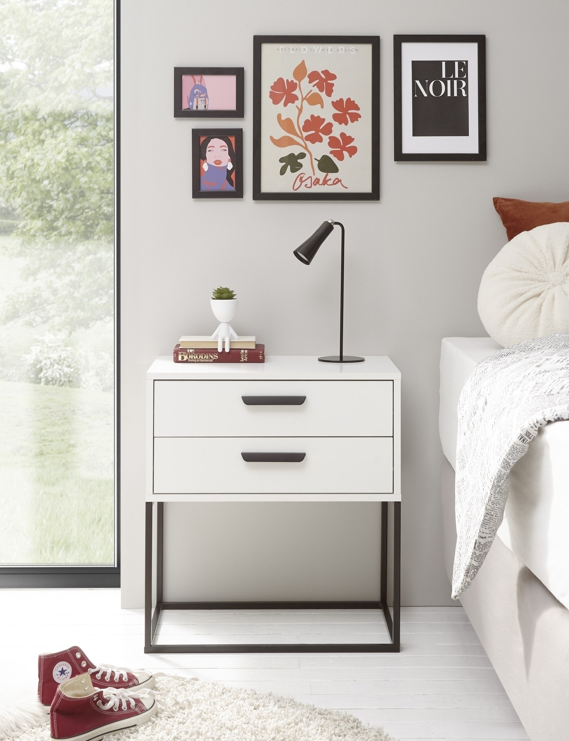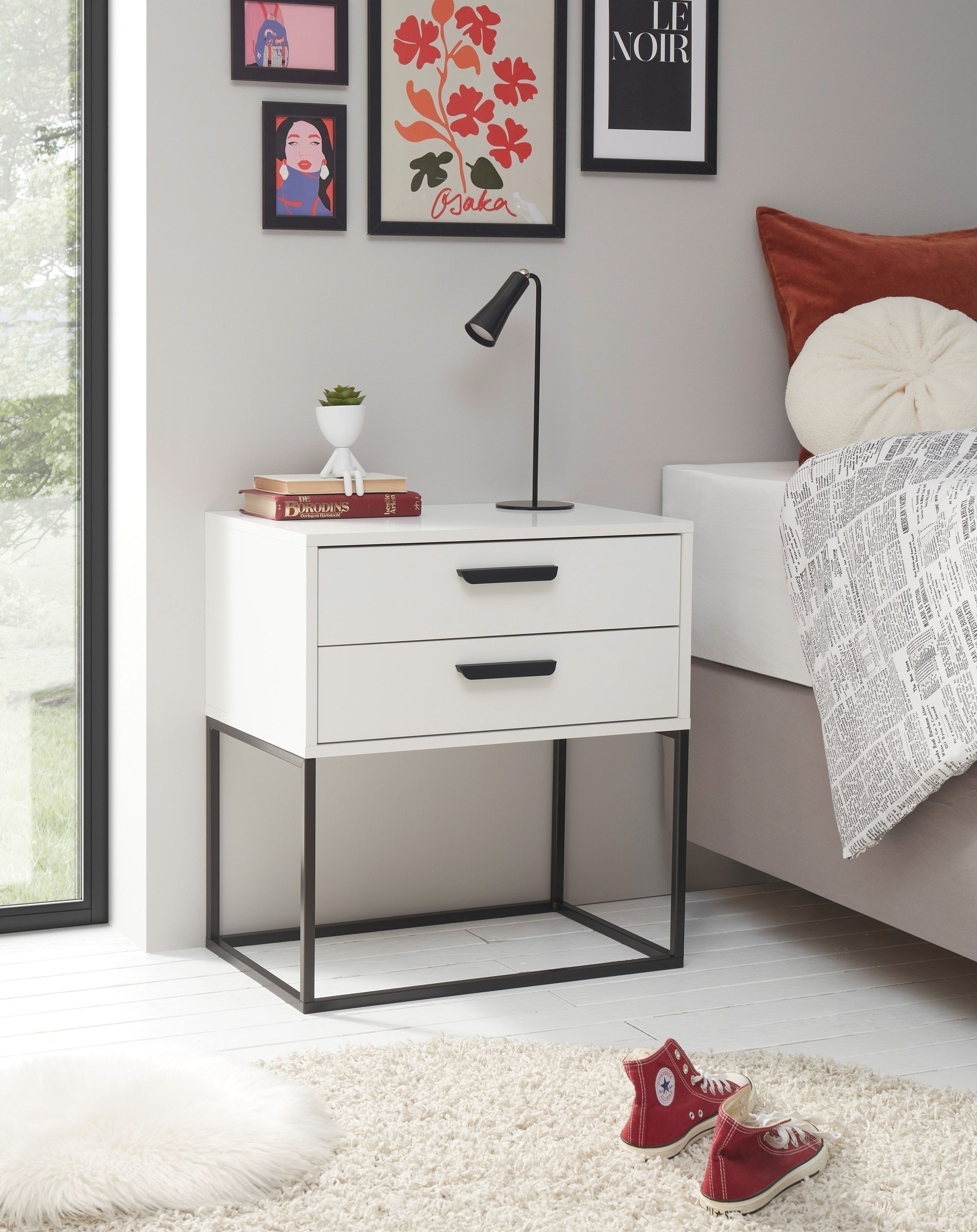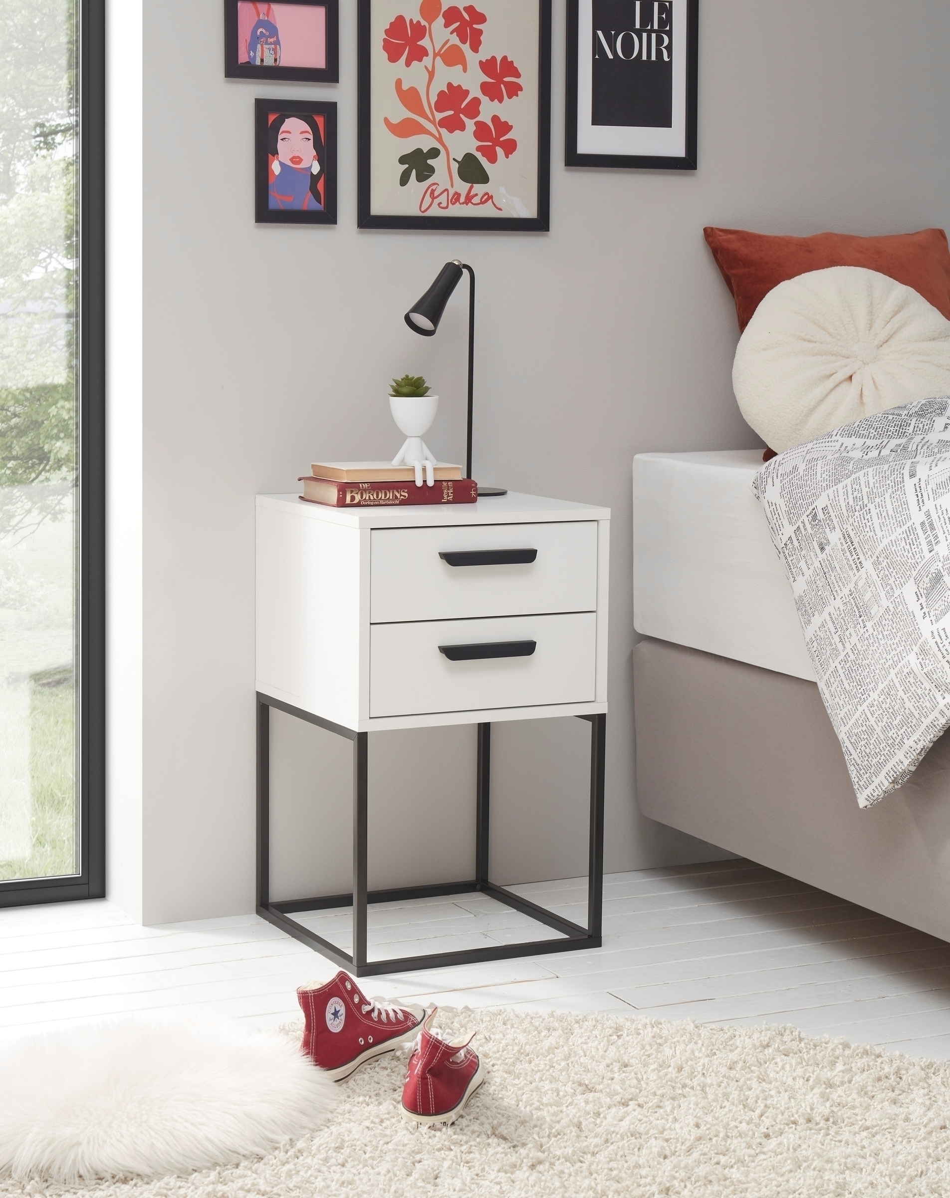 Der weiße Korpus mit schwarzem Metallgestell fügt sich stilvoll in moderne Schlafzimmer ein.