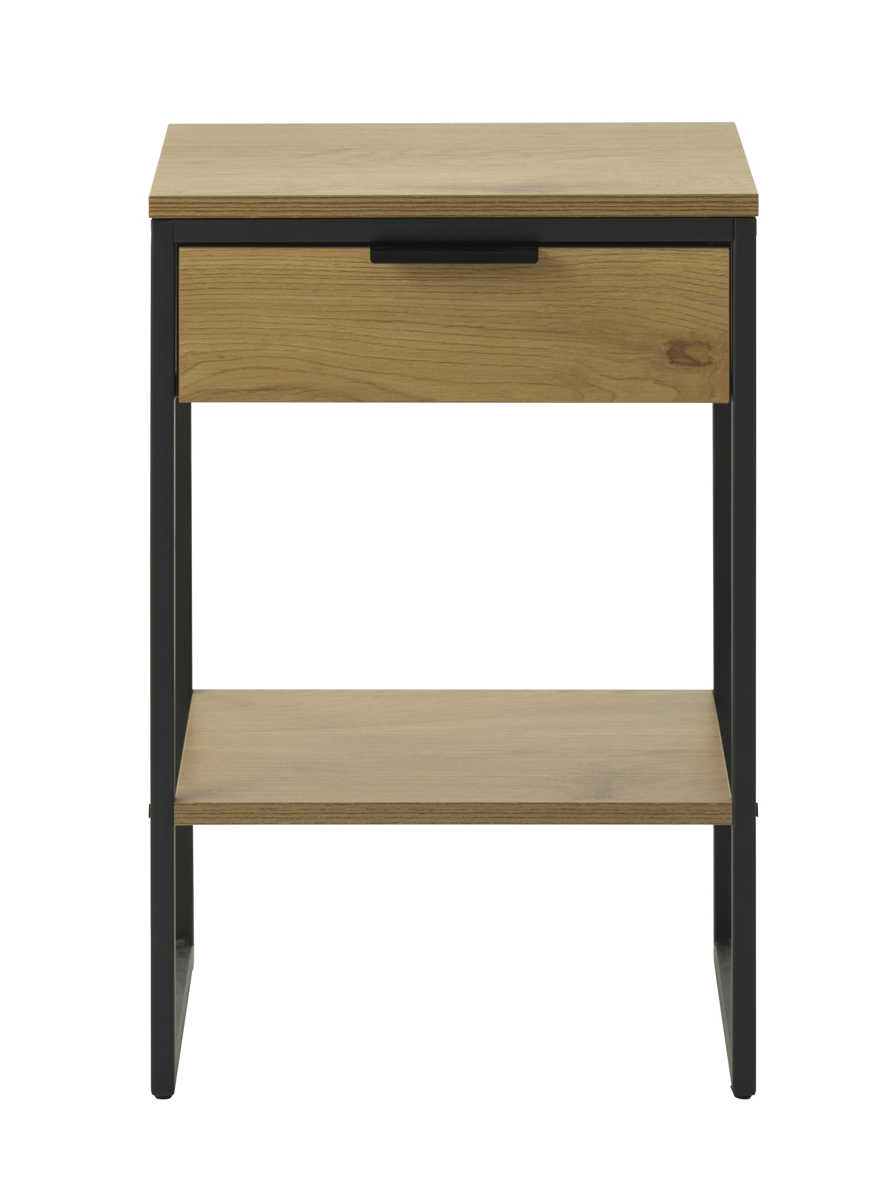 Massive Eiche und ein schwarzes Metallgestell verbinden natürliche Wärme mit moderner Stabilität.