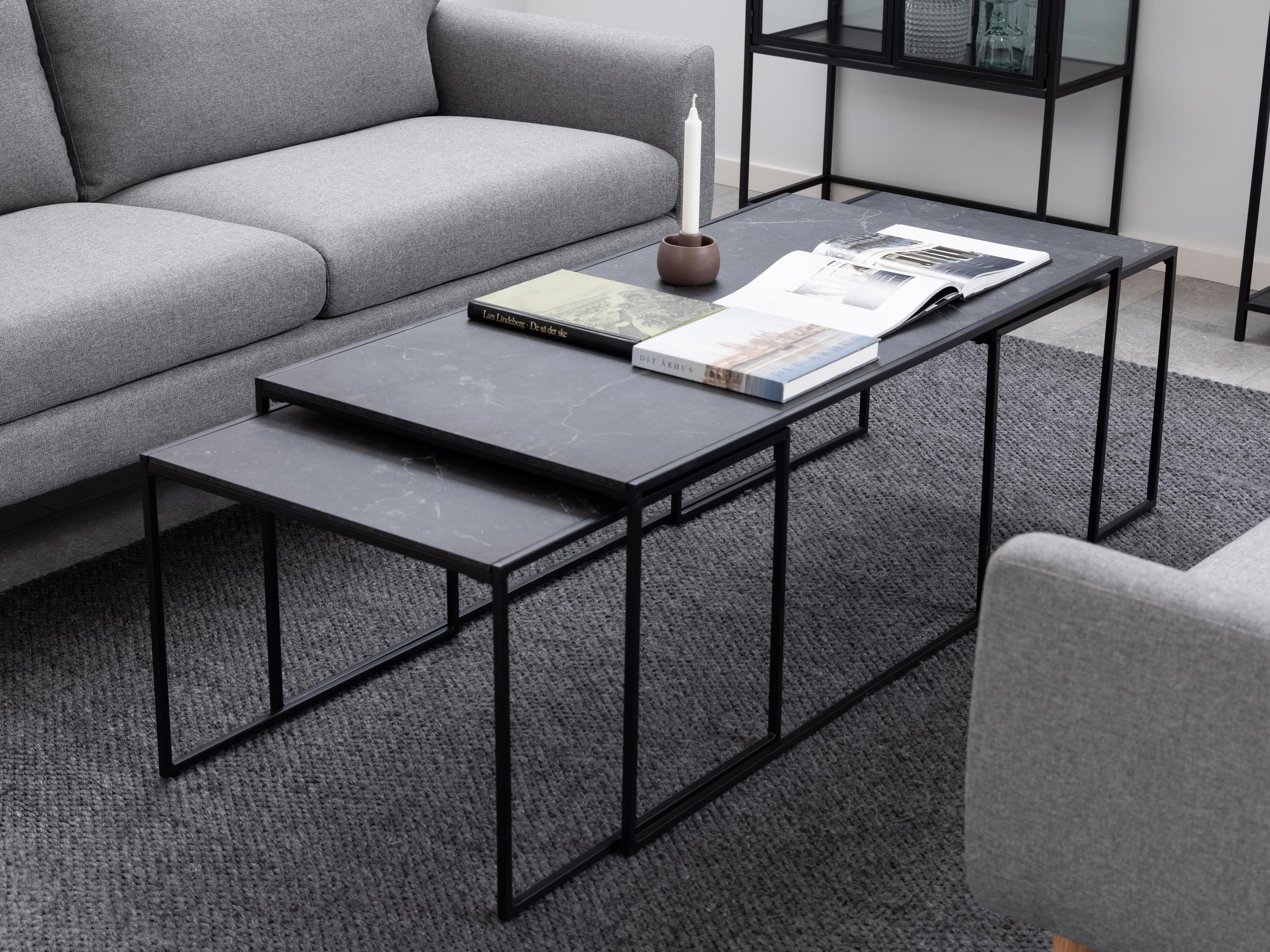 Ein pulverbeschichtetes Metallgestell in Schwarz matt trägt die Tischplatten und verleiht dem Set seinen typischen Industrial-Charakter. Die klare Linienführung und die dunkle Farbgebung lassen „Inverness I“ mit vielen Wohnstilen harmonieren und machen den Satztisch zu einem vielseitig einsetzbaren Möbelstück im Wohnzimmer.