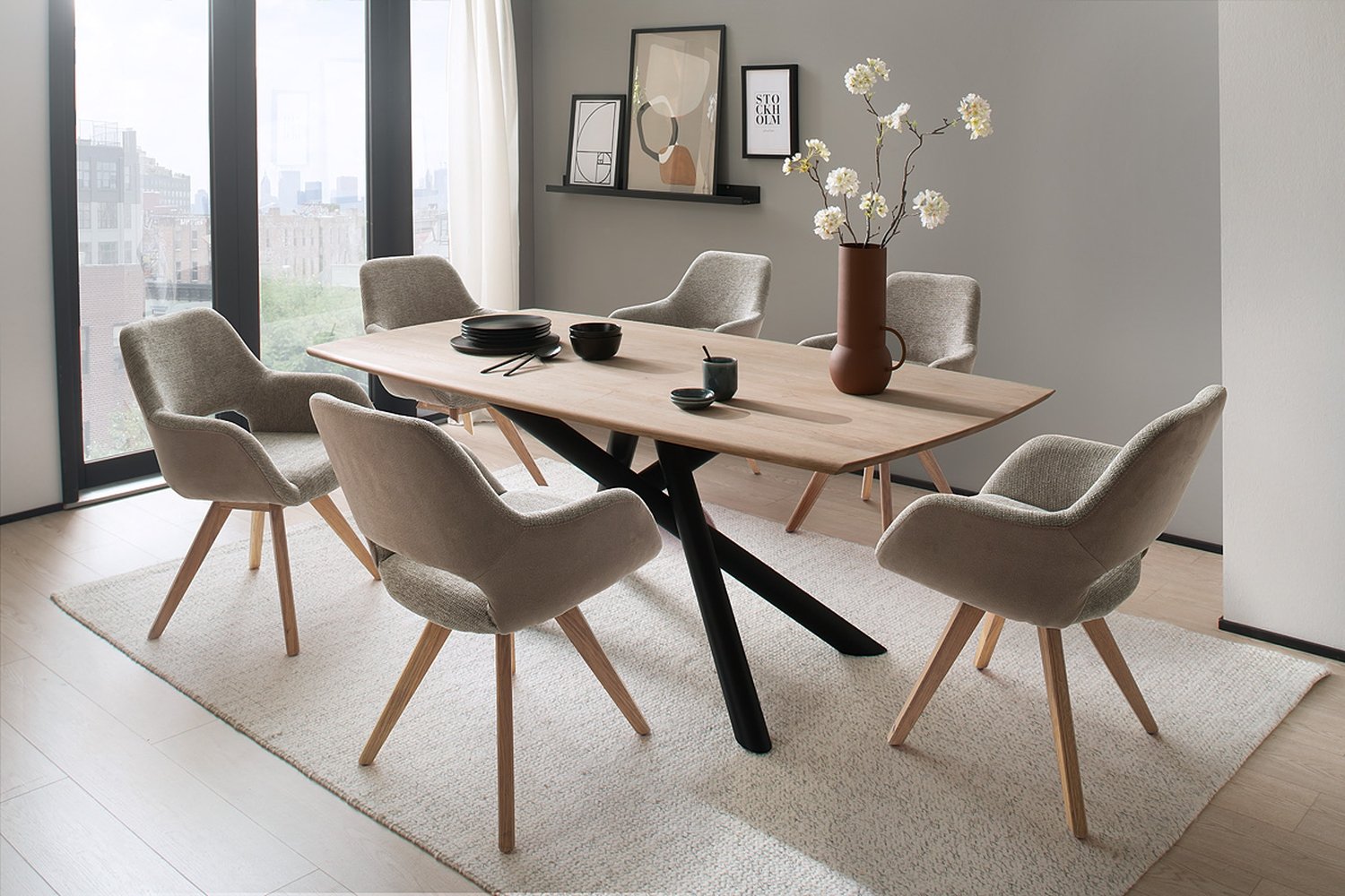 Das stabile, schwarz lackierte Spider-Gestell aus massivem Holz ist bis zu 120 kg belastbar und verleiht dem Stuhl seine elegante Optik. Dank einer Abriebfestigkeit von 51.000 Scheuertouren ist der Bezug besonders strapazierfähig und damit bestens für den täglichen Gebrauch gerüstet.