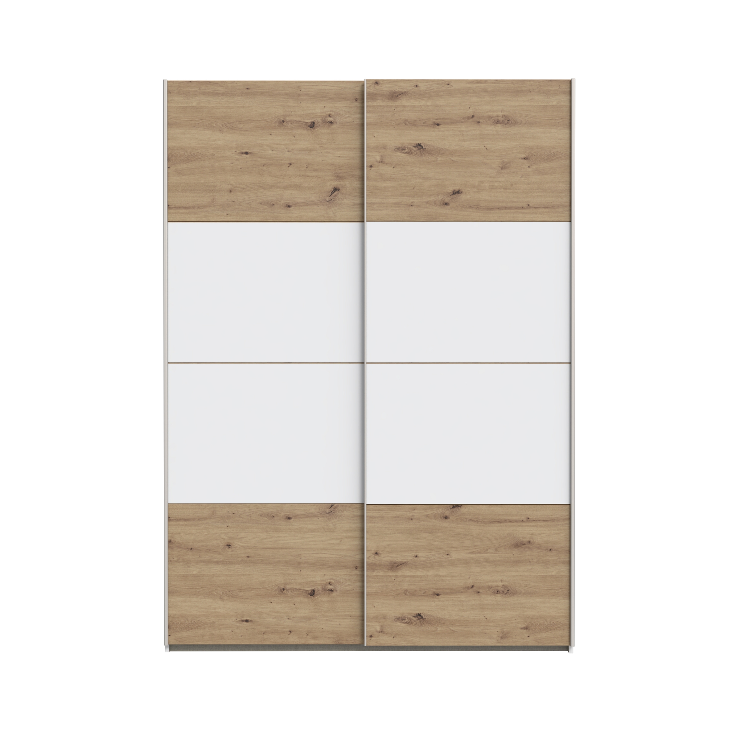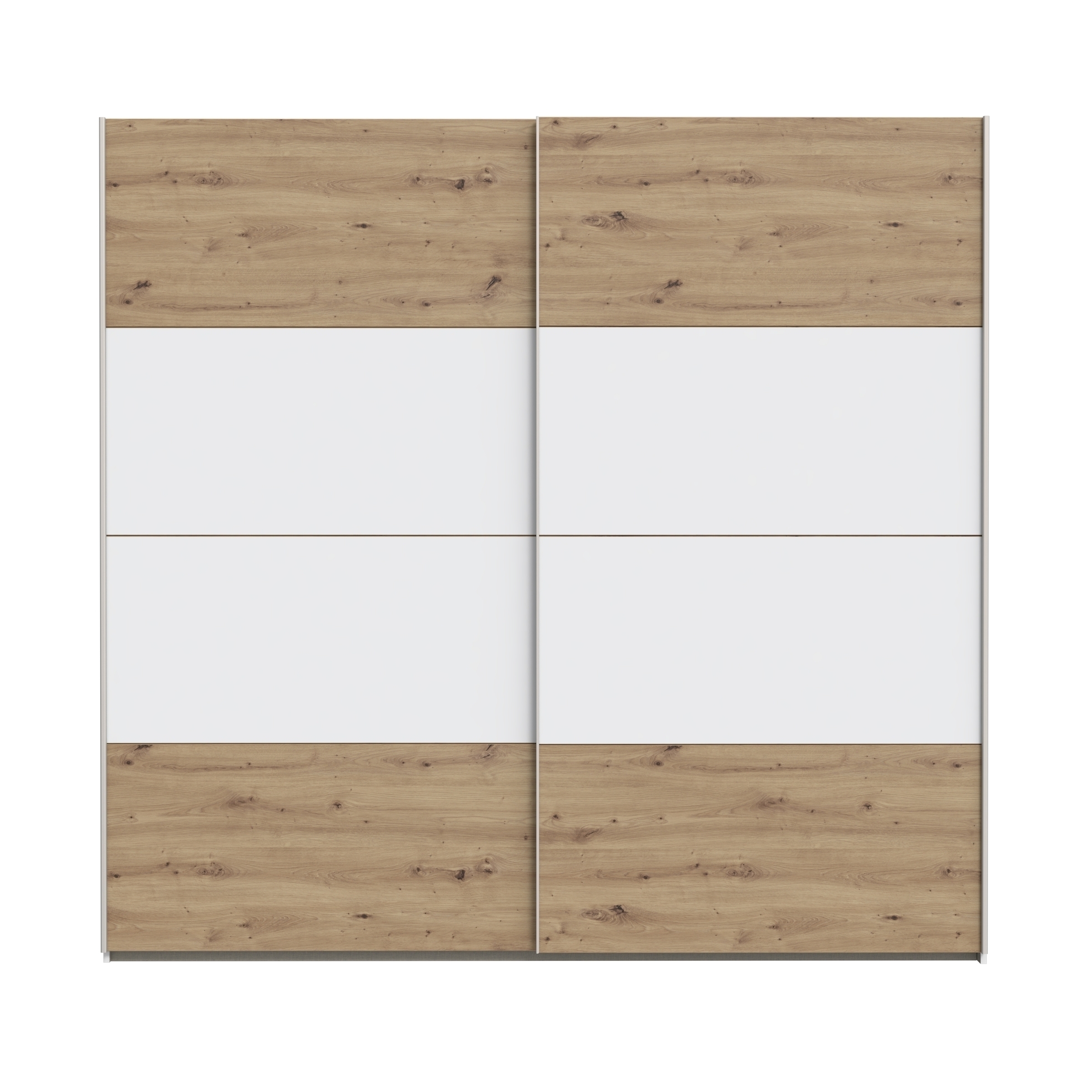Hinter den zwei Schiebetüren verbirgt sich ein durchdachtes Innenleben: Zwei Kleiderstangen mit einer Länge von jeweils 82,2 cm sowie zwei Einlegeböden unterstützen Sie dabei, Ihre Garderobe übersichtlich zu organisieren und alles schnell griffbereit zu haben.