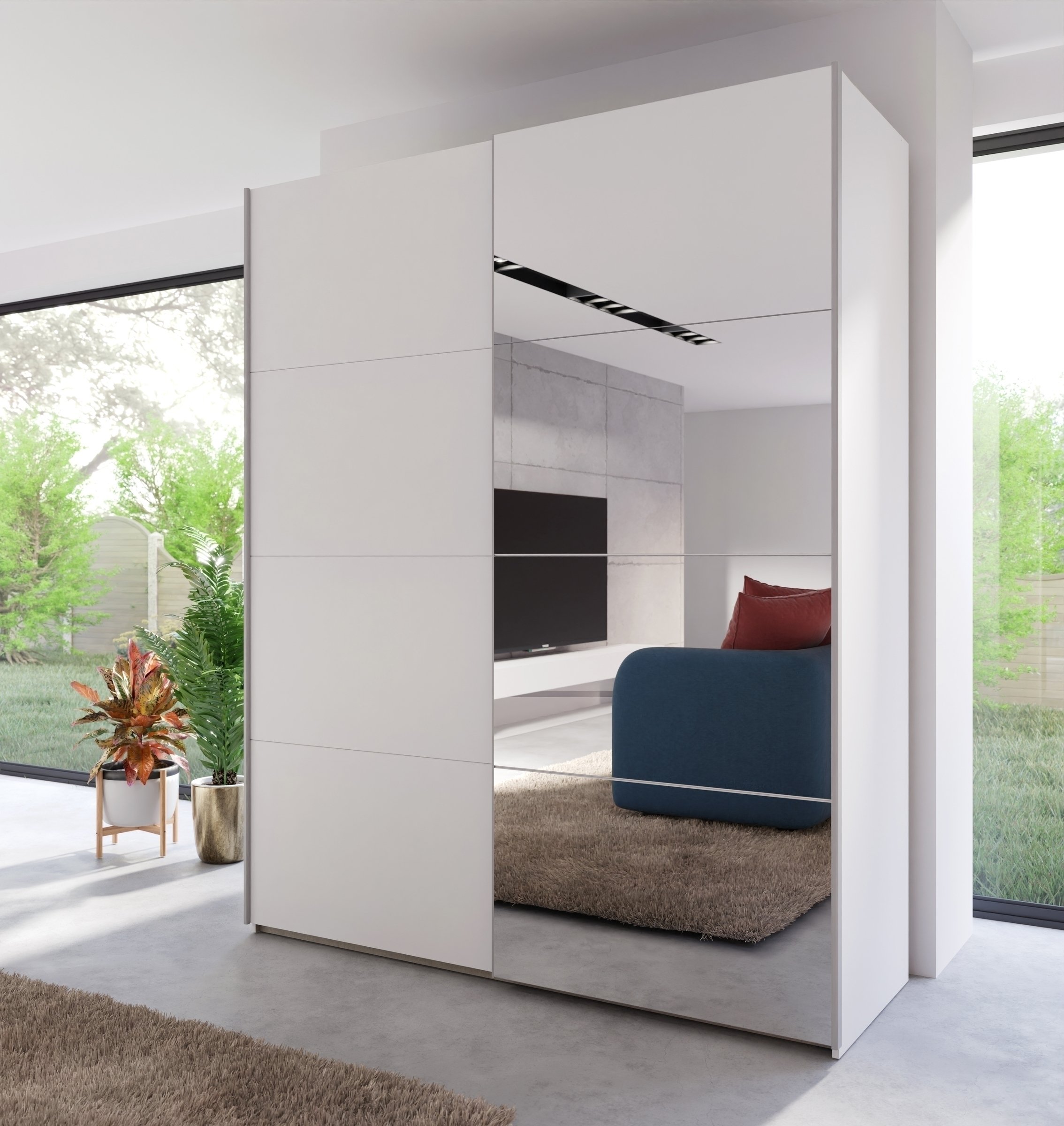 Das schlichte, elegante Design in Weiß mit Folienfinish-Beschichtung fügt sich harmonisch in verschiedenste Einrichtungsstile ein und verleiht dem Raum eine frische, moderne Ausstrahlung. Die praktischen Schiebetüren mit langen Aluminiumgriffen lassen sich leicht öffnen und schließen und machen den Kleiderschrank besonders alltagstauglich, auch in schmaleren Räumen.