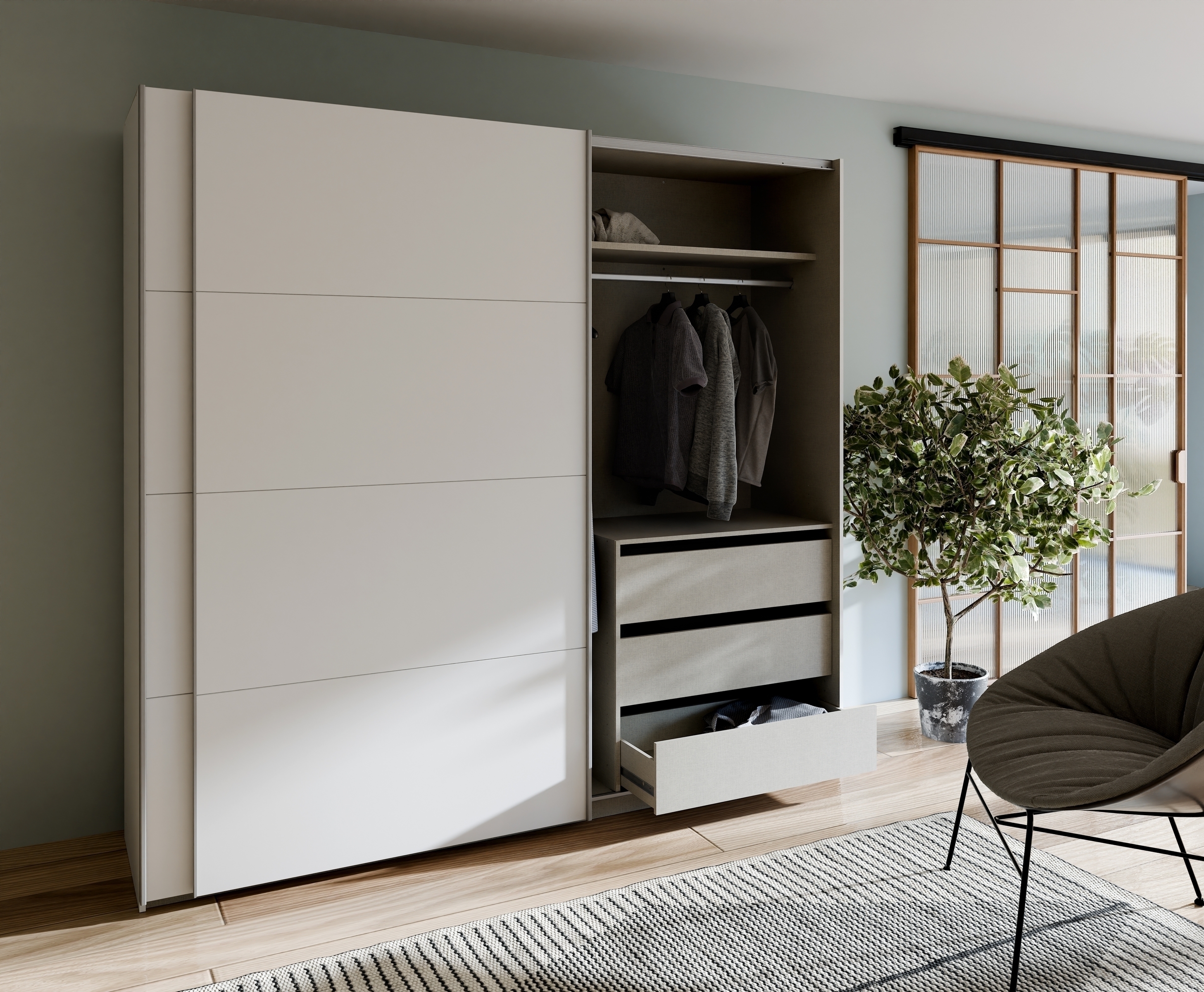 ;Praktische Schiebetüren mit Aluminiumgriffen ermöglichen eine einfache Handhabung und sparen Platz im Raum.
