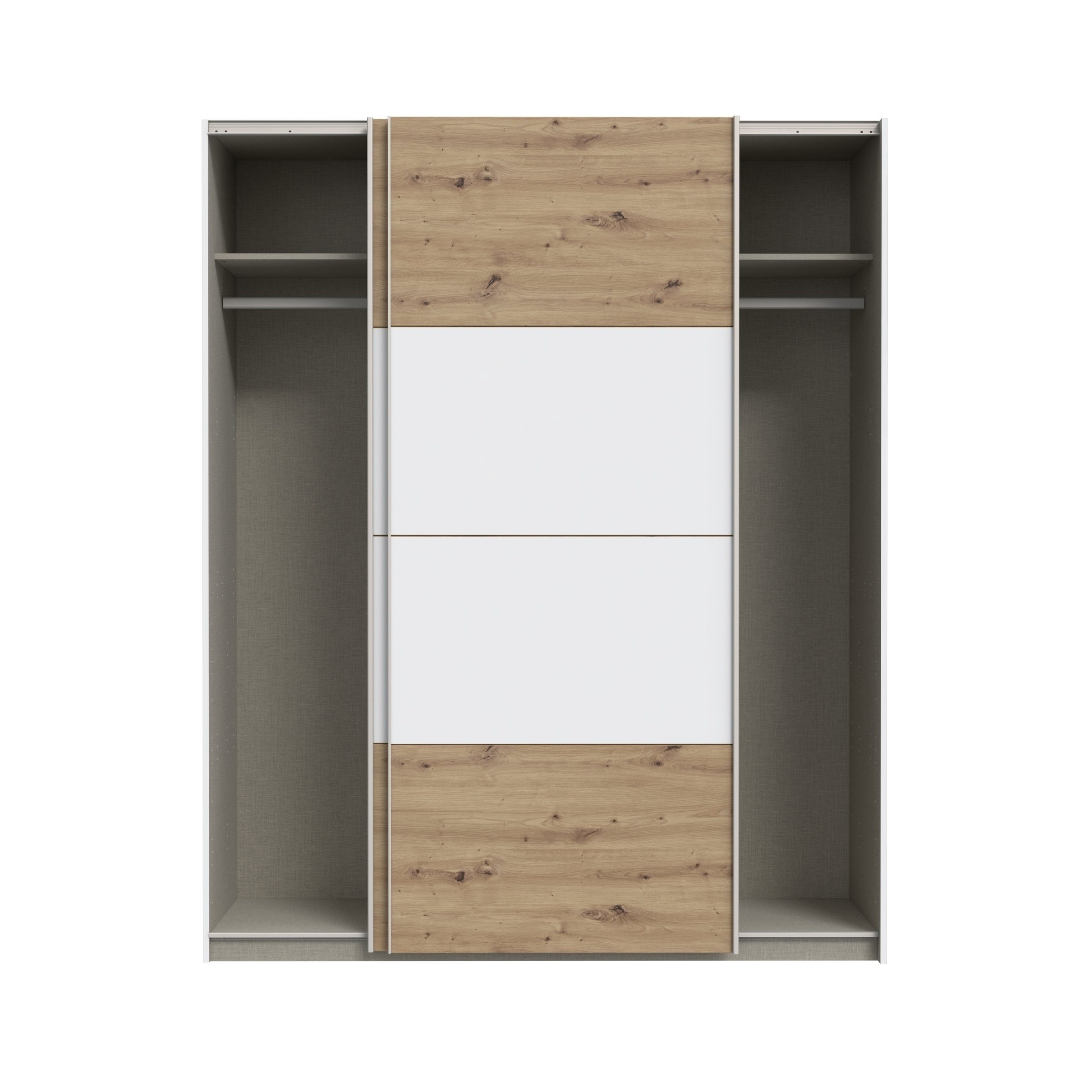 Zwei leicht laufende Schiebetüren mit modernem Kantengriff-Design und integriertem Spiegel machen den Zugriff auf Kleidung komfortabel und lassen den Raum gleichzeitig größer und heller wirken. Im Inneren stehen Ihnen zwei Kleiderstangen und zwei Einlegeböden zur Verfügung, sodass Hemden, Kleider, Hosen und gefaltete Wäsche strukturiert und gut erreichbar verstaut werden können.