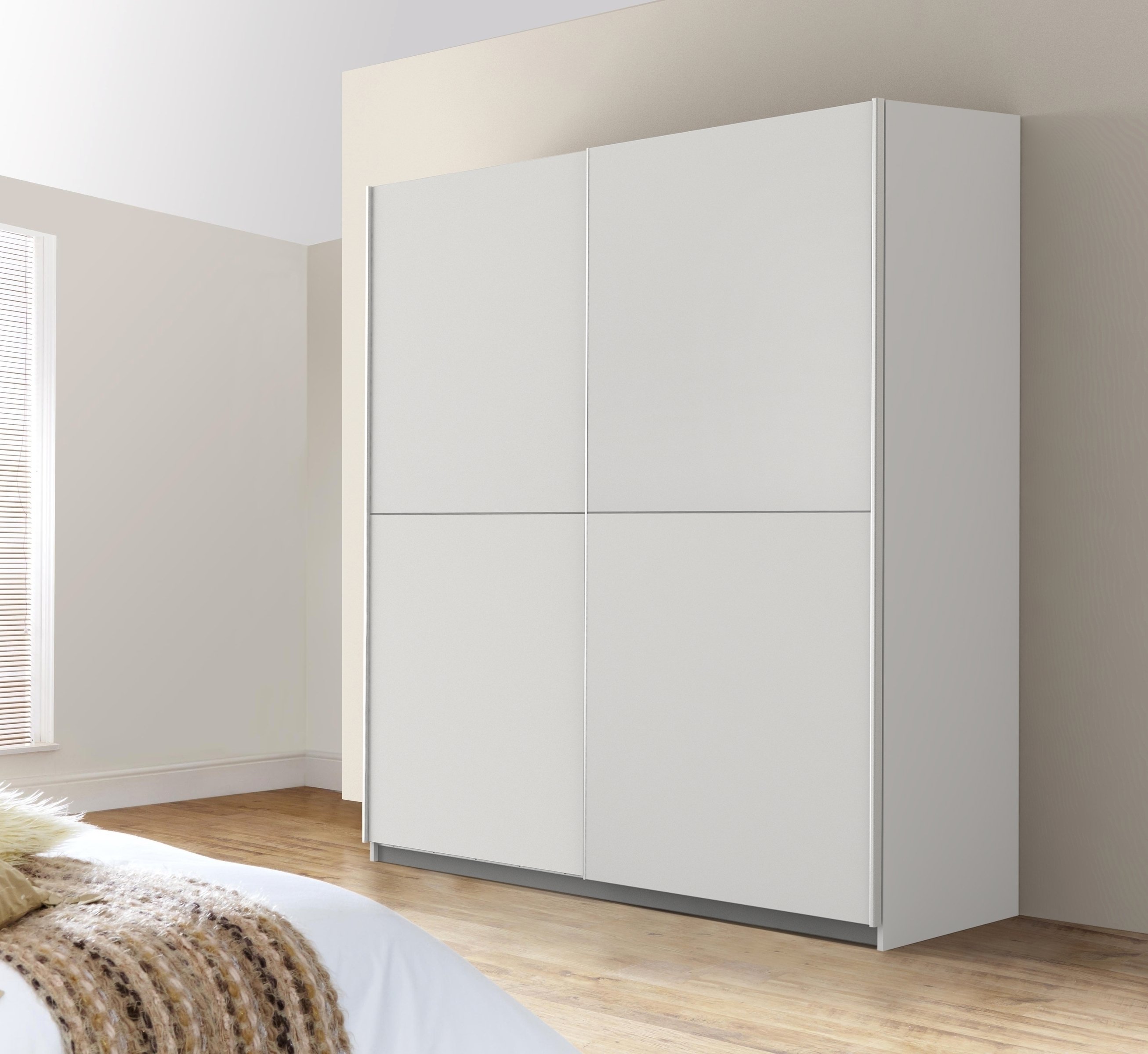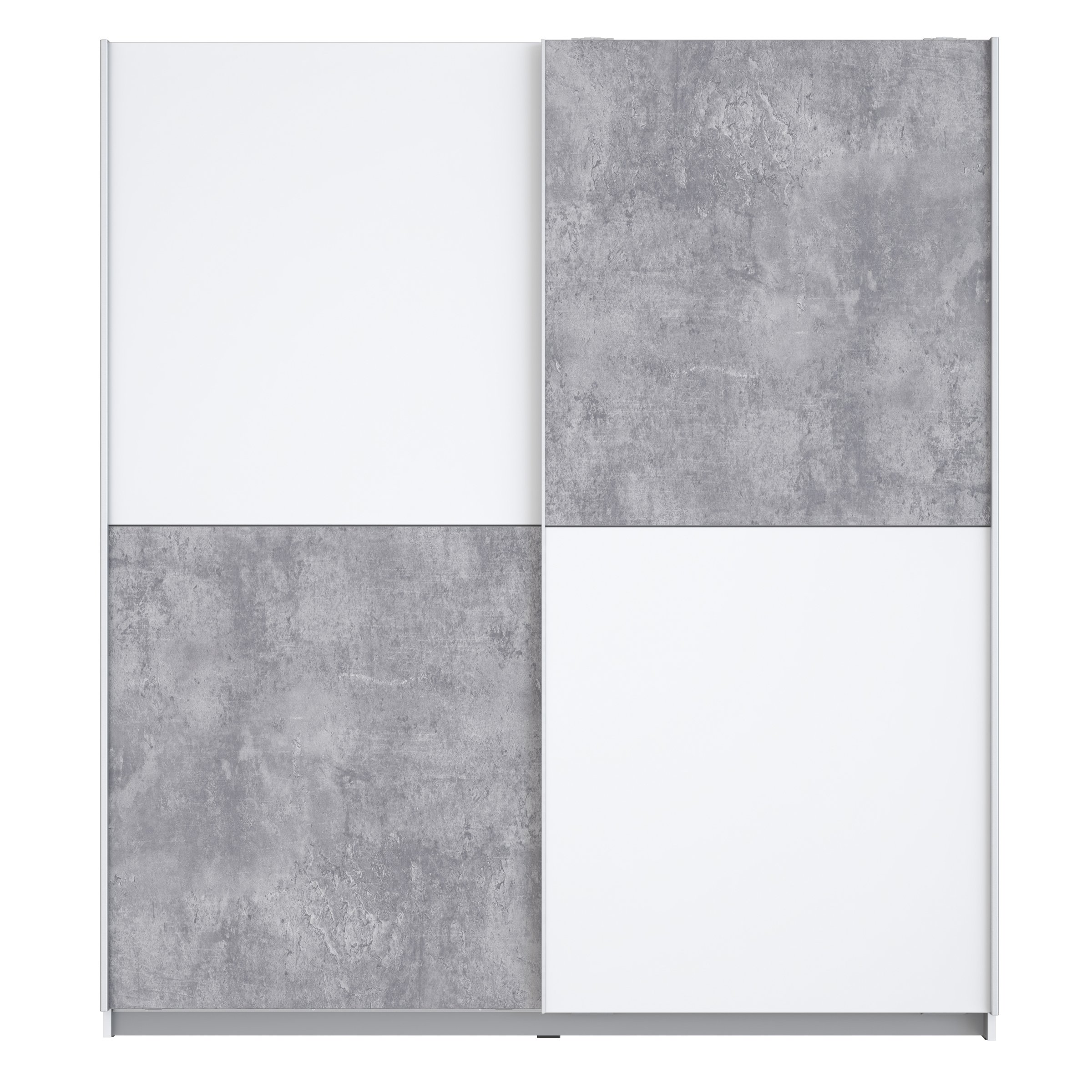 Die Front und der Korpus aus Spanplatte mit Folienfinish präsentieren sich in strahlendem Weiß und unterstützen eine helle, freundliche Raumwirkung. Graue Kunststofffüße sowie Griffe im Aluminiumeffekt setzen dezente Akzente und runden den zeitgemäßen Look ab. Die Schwebetüren gleiten platzsparend vor dem Schrank entlang und sind besonders in kleineren Räumen praktisch.