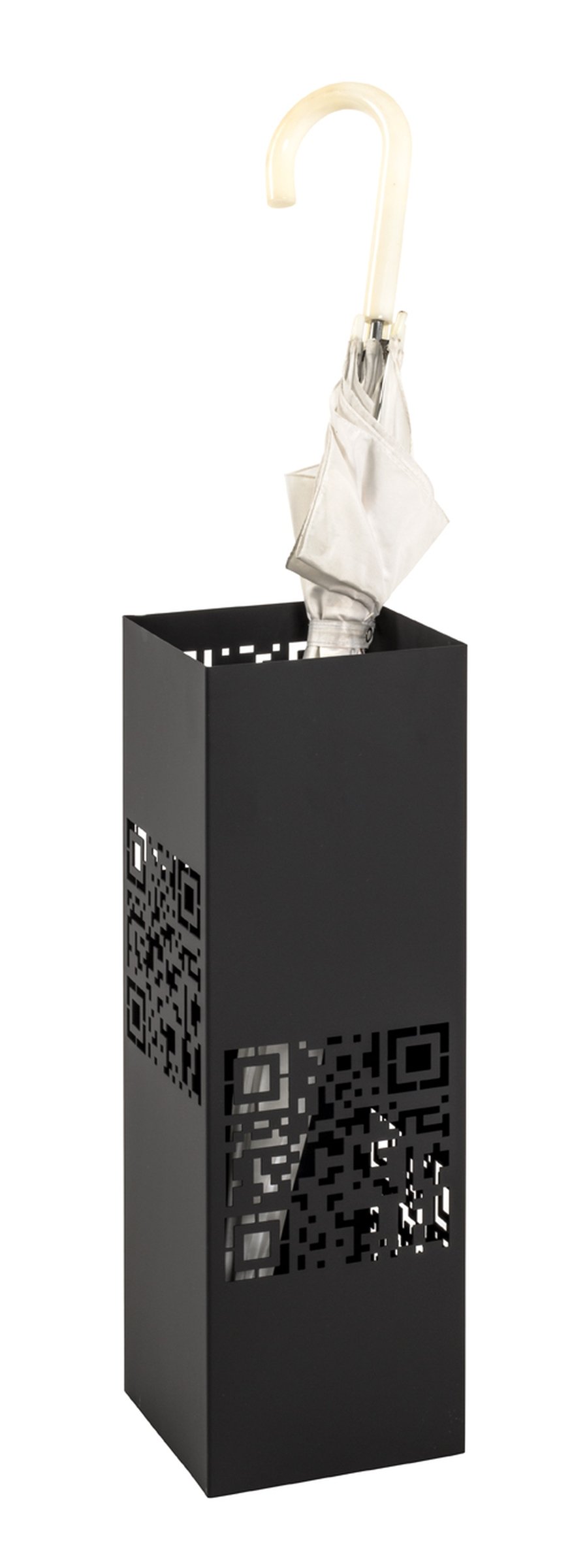 Sein Korpus aus schwarz lackiertem Metall wird durch eine abstrakte QR-Code-Stanzung optisch aufgelockert und erhält so eine markante, zeitgemäße Anmutung. Mit seinen kompakten Maßen von ca. 16x48x16 cm (B/H/T) nimmt der Schirmständer selbst wenig Platz ein, bietet aber dennoch ausreichend Stauraum für mehrere Schirme.