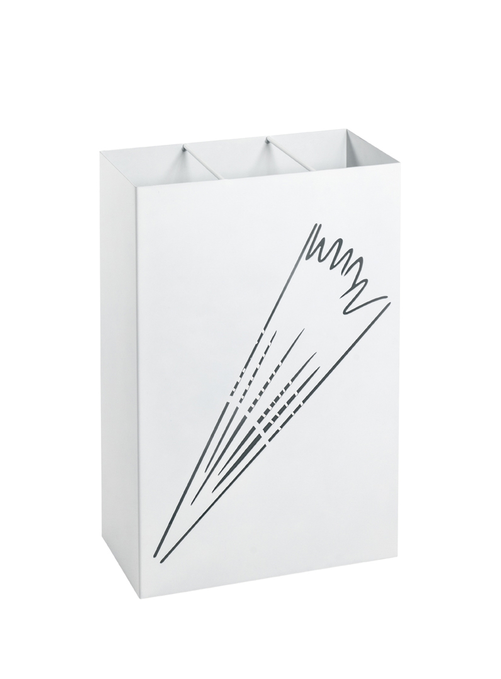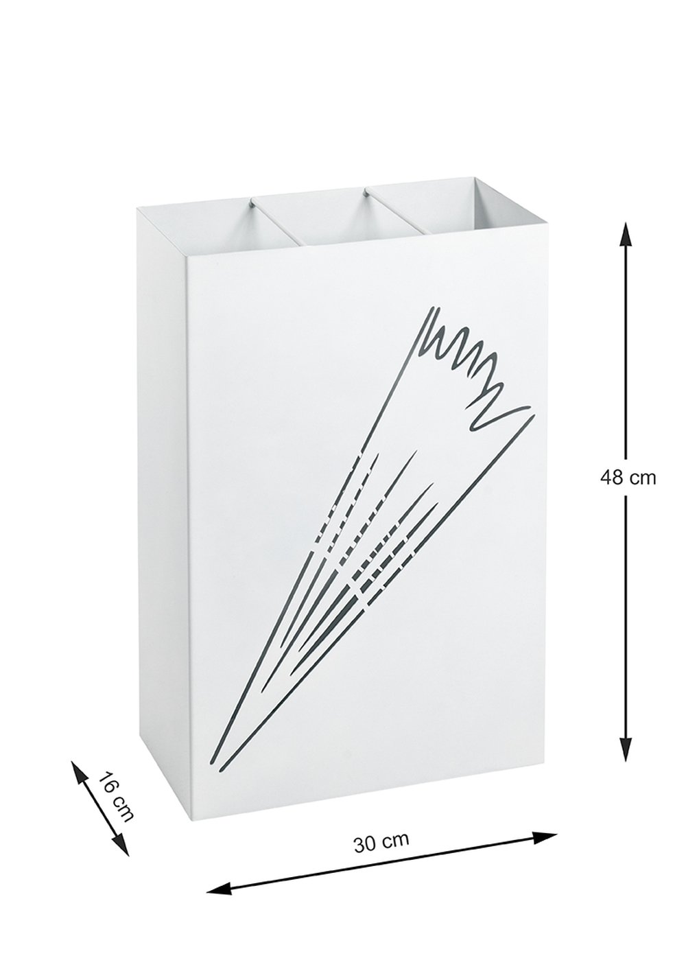 Gefertigt aus hochwertigem, weiß lackiertem Metall überzeugt der Schirmständer durch Stabilität und eine moderne Optik. Das gestanzte Motiv auf der Vorderseite sorgt für einen zeitgemäßen Look und macht den Ständer zu einem stilvollen Blickfang im Flur.