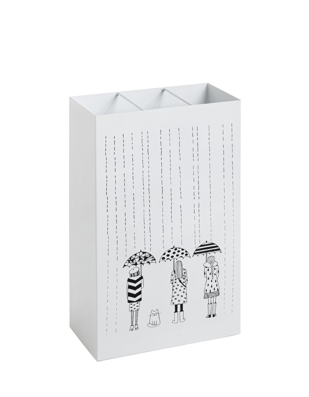 Der stabile Korpus aus hochwertigem, weiß lackiertem Metall macht den Schirmständer zu einem dekorativen Blickfang, der sich harmonisch in moderne Wohnstile einfügt. Die integrierte Abtropfschale aus Kunststoff sorgt dafür, dass Regenwasser zuverlässig aufgefangen wird und der Boden sauber und trocken bleibt.