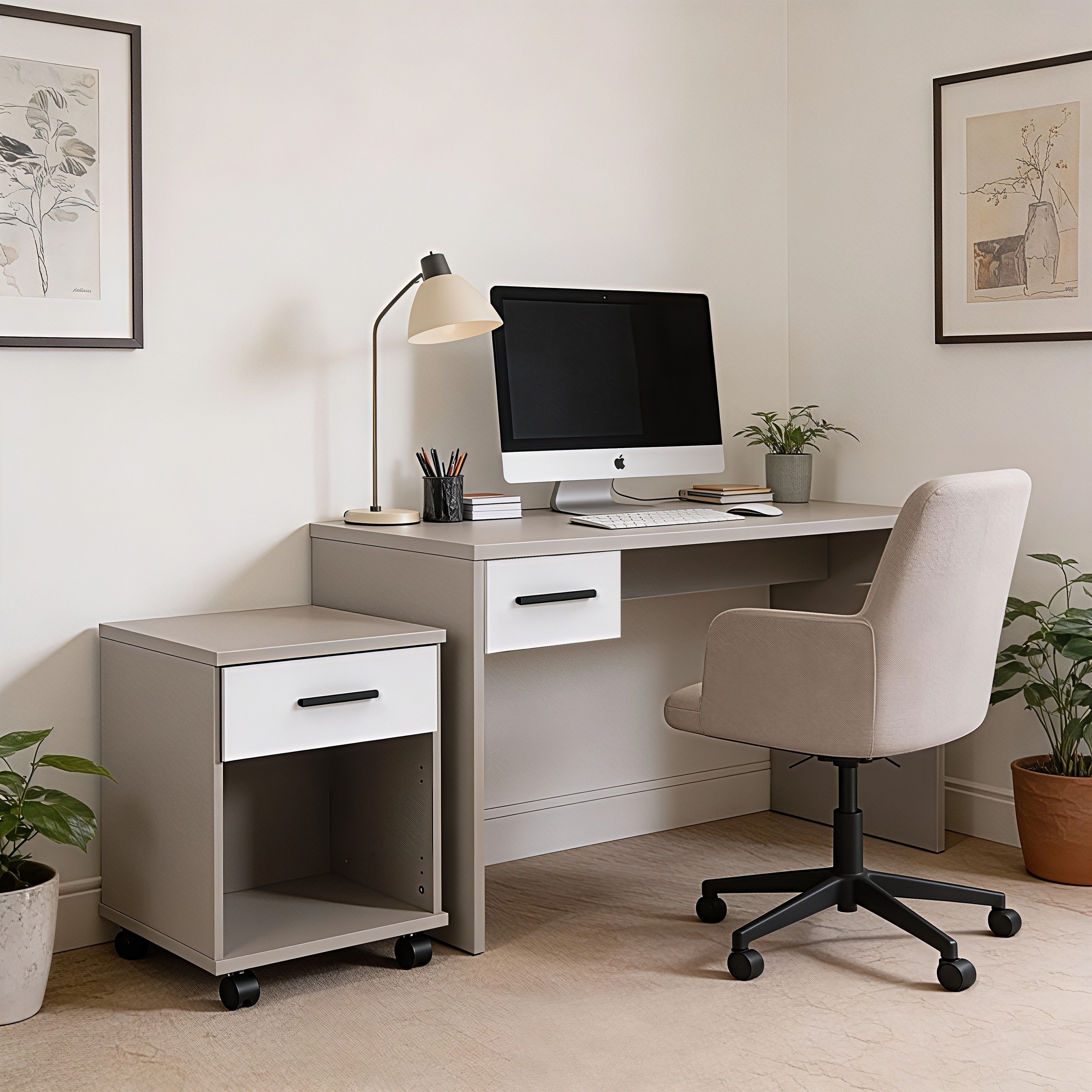 Die Oberfläche aus Holzwerkstoff-Spanplatte ist nicht nur robust, sondern auch pflegeleicht. Flecken oder Kratzer lassen sich einfach entfernen, sodass der Schreibtisch lange wie neu aussieht. Die Farbe Saharagrau + Weiß unterstreicht den modernen Wohnstil und passt zu vielen Einrichtungskonzepten.