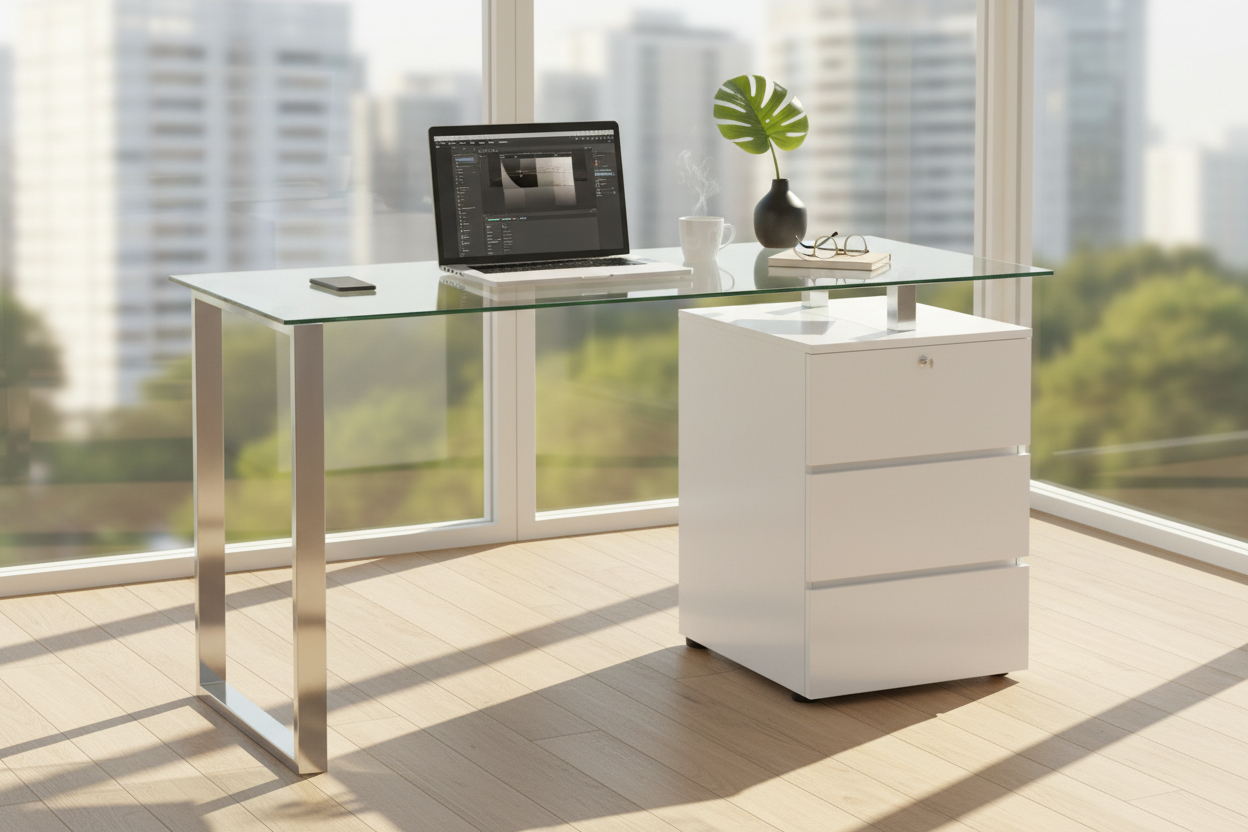 Cinty Schreibtisch – Moderner Bürotisch mit Sicherheitsglas & Stauraum