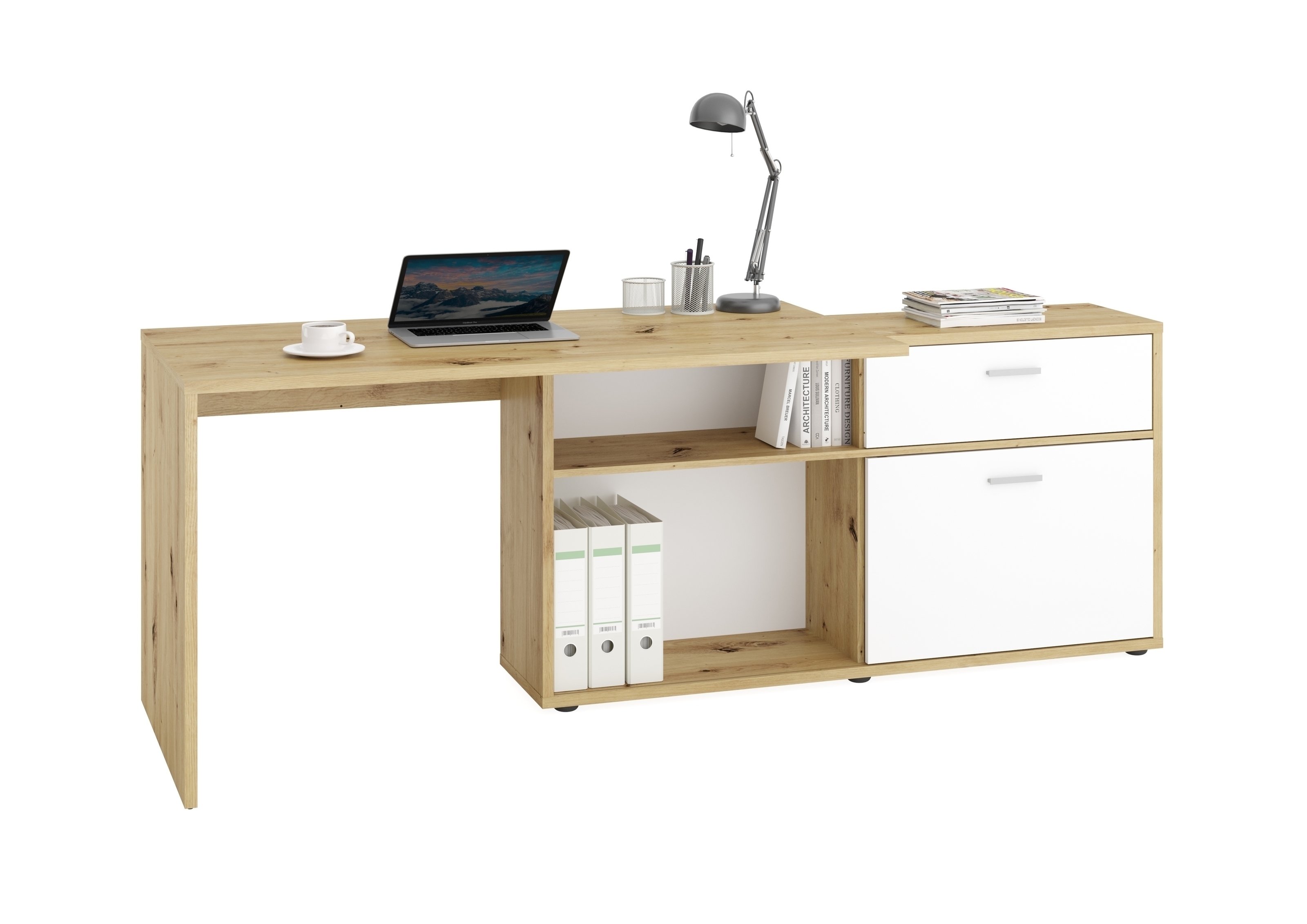 ✔Die moderne Farbkombination Artisan Eiche Dekor-Brillantweiß fügt sich stilvoll in zeitgemäße Büros und Homeoffices ein.