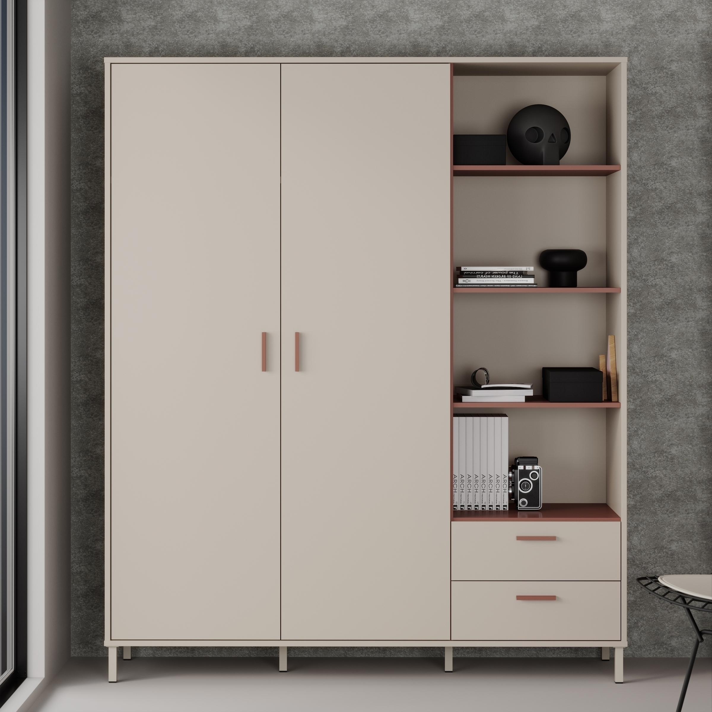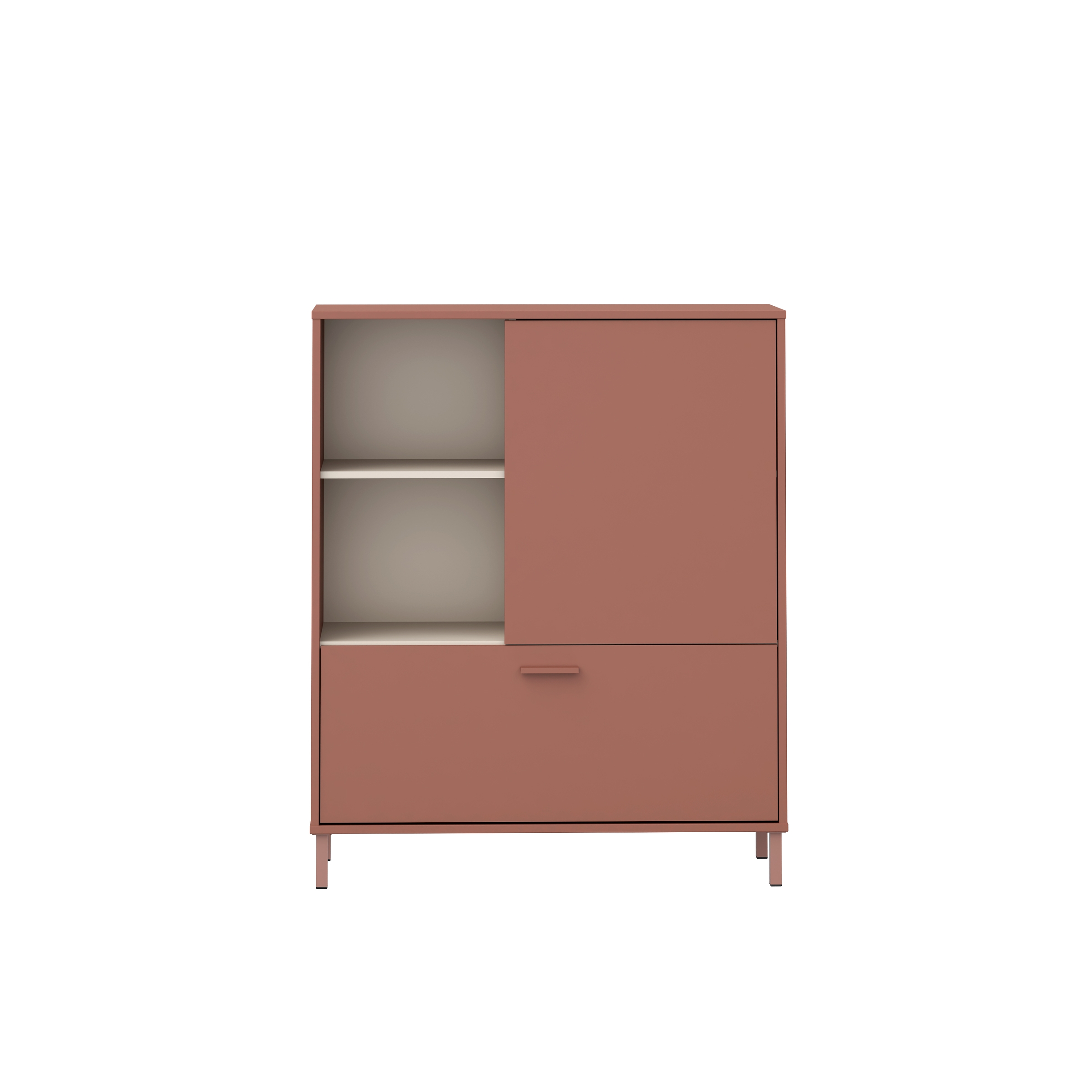 [cWert] => Regal in Sand/Terrakotta mit kompakten Maßen (B/H/T): 58,9 x 201,6 x 41,5 cm – ideal für Wohnzimmer, Büro oder Flur.;Hochwertige Spanplatte mit Folie-Finish-Beschichtung – pflegeleicht, langlebig und optisch modern zugleich.;4 offene Fächer, 2 Schubladen mit Vollauszug und 1 Tür bieten vielseitigen Stauraum für Bücher, Deko und mehr.;Terrakottafarbene Kunststoffgriffe und 8 stabile Holzeinlegeböden mit je 15 kg Tragkraft – durchdacht bis ins Detail.;Lieferung erfolgt zerlegt – einfache Selbstmontage dank bebilderter Anleitung, ideal für den unkomplizierten Aufbau.