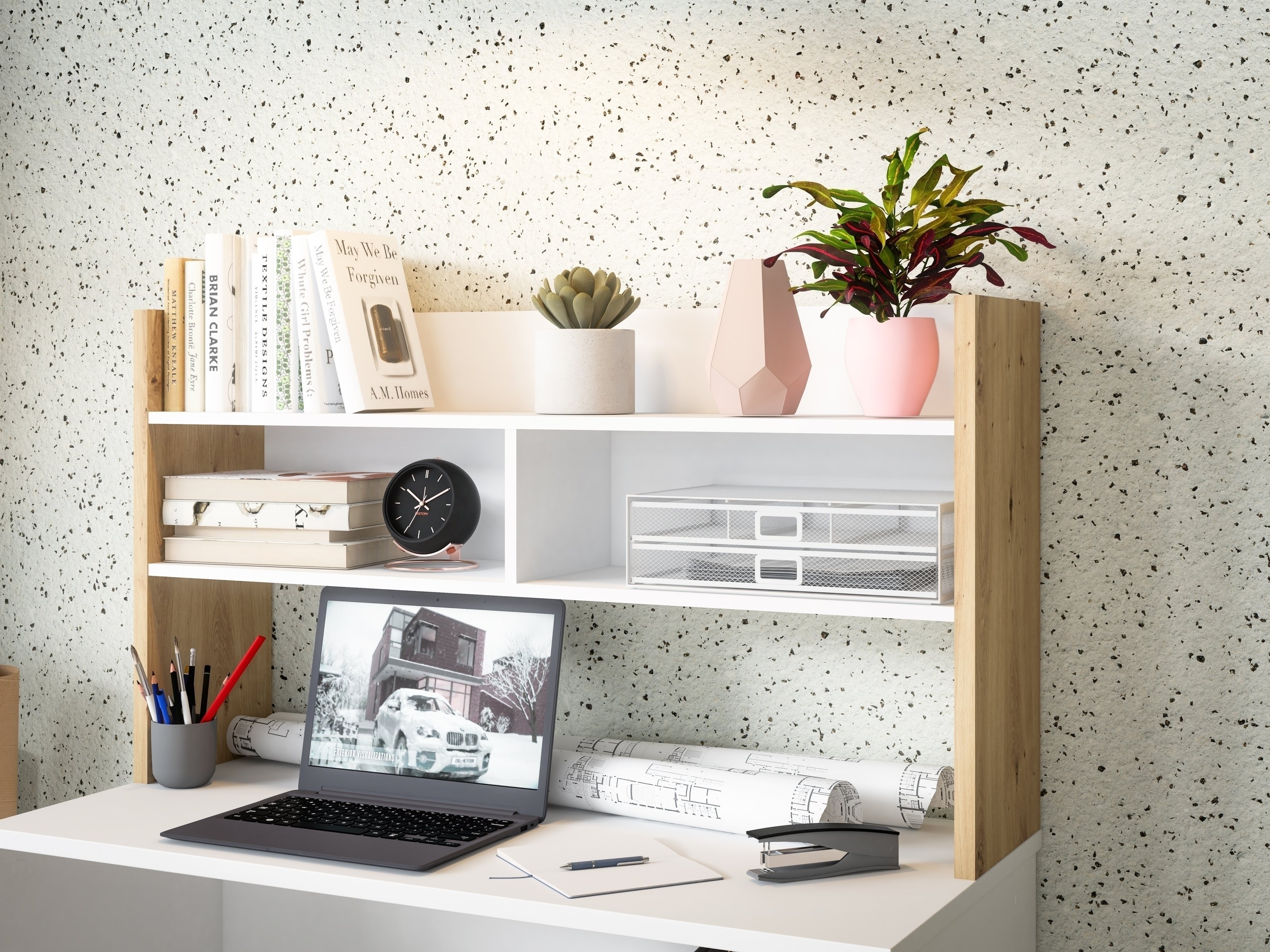 [BulletPoints] => Der Schreibtischaufsatz Modultrick beeindruckt mit großzügigen Maßen von 139,6 cm Breite, 60 cm Höhe und 25,8 cm Tiefe, ideal für Ihren Arbeitsplatz.;Die Uni Wolfram Grau/Artisan Eiche Farbkombination verleiht Ihrem Büro eine moderne und stilvolle Ästhetik, die sich nahtlos in jede Einrichtung einfügt.;Hergestellt aus hochwertiger Spanplatte mit einer Stärke von 22 mm für den Korpus und 15 mm für die Seitenteile, bietet der Modultrick Schreibtischaufsatz eine robuste und langlebige Konstruktion.;Mit zwei großzügigen Ablageböden bietet dieser Aufsatz ausreichend Platz für eine organisierte und effiziente Arbeitsumgebung.;Der Modultrick Schreibtischaufsatz wird zerlegt geliefert, um eine einfache Montage und schnelle Integration in Ihren Arbeitsbereich zu ermöglichen.