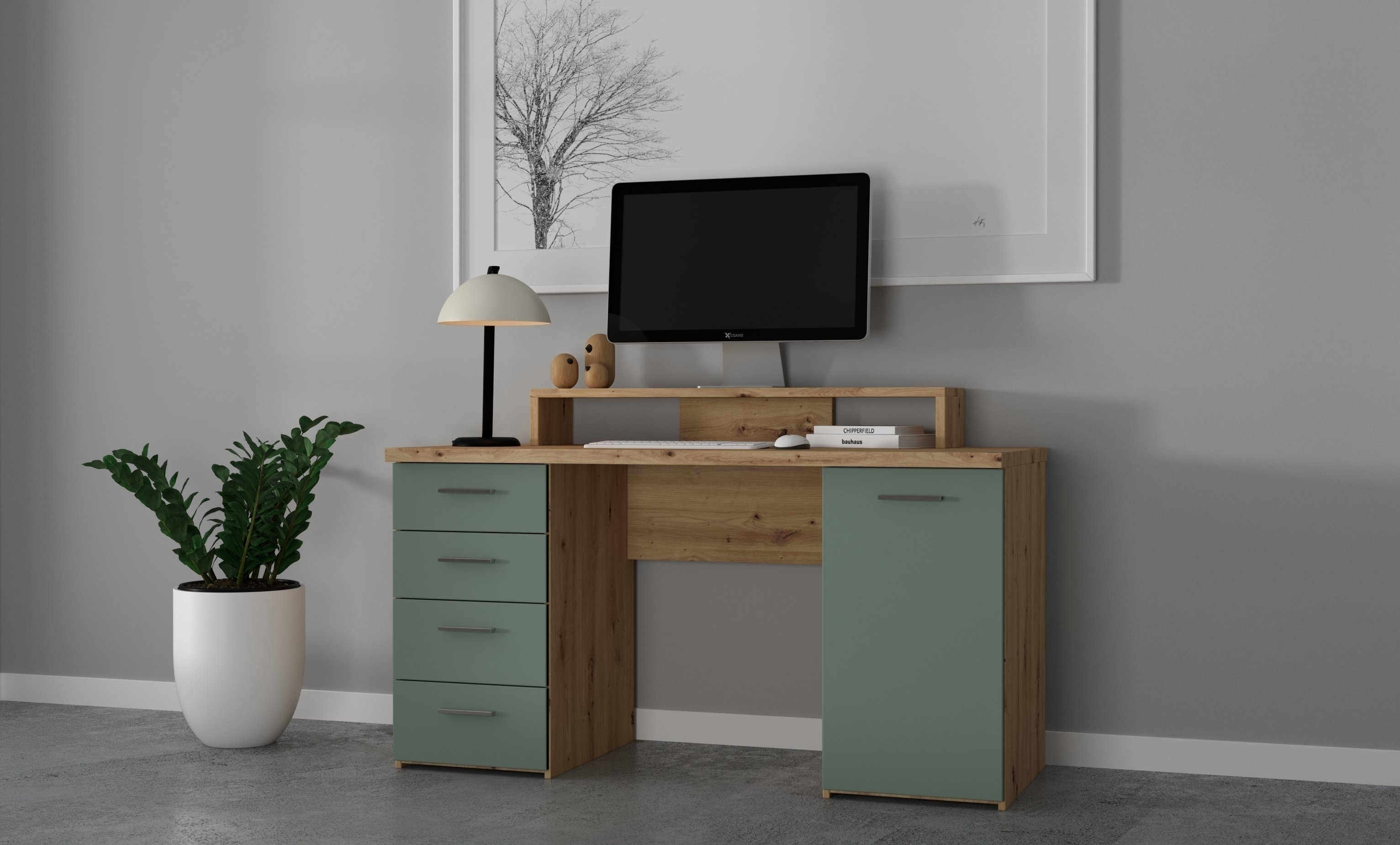 Die gelungene Kombination aus Artisan Eiche und Hellgrau verleiht dem Schreibtisch eine zeitgemäße Optik, die sich harmonisch in moderne Wohnstile einfügt. Vier geräumige Schubladen, eine Tür und ein praktischer Ablage-Aufsatz helfen dabei, Unterlagen, Schreibutensilien und Zubehör übersichtlich zu verstauen und jederzeit griffbereit zu haben.