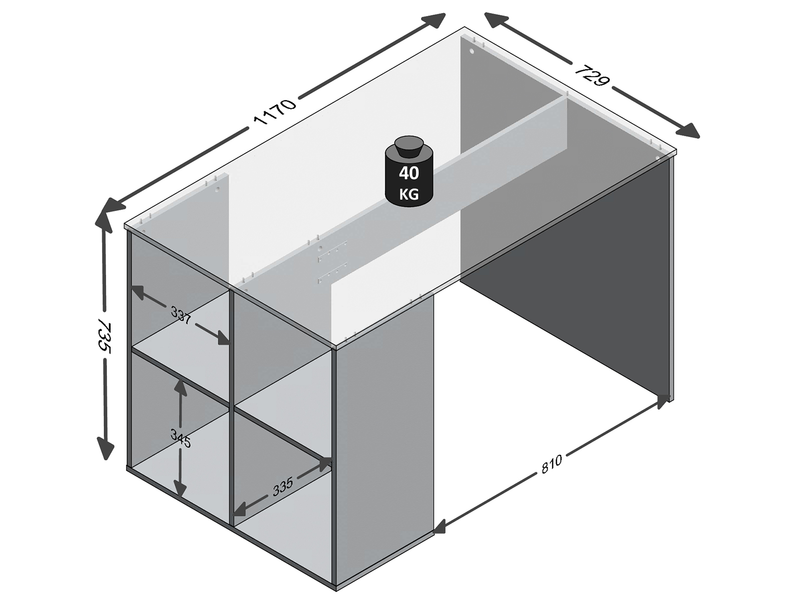 Der Schreibtisch ist aus melaminharzbeschichteter Spanplatte gefertigt und für den normalen Büroalltag konzipiert. Er eignet sich für Laptops, Monitore, Bücher und leichtere Dekoration. Für sehr schwere Gegenstände empfehlen wir, die Belastbarkeit der Ablagefächer zu prüfen.