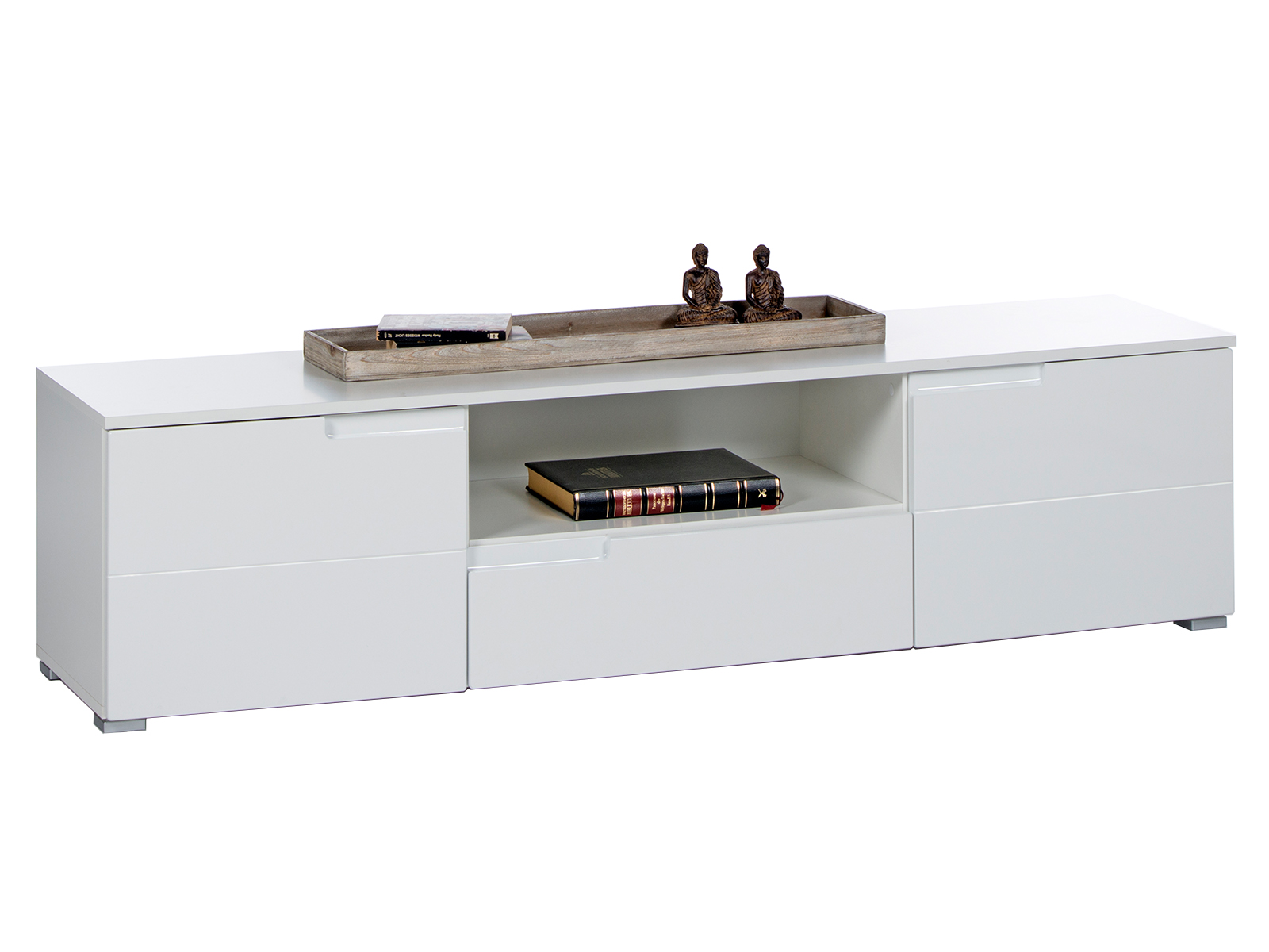 [BulletPoints] => TV-Lowboard, Korpus aus Spanplatte in Weiß und Front aus MDF in Weiß-Hochglanz mit 1 Schubkasten, 2 Türen und 1 offenes Fach;Breite 165 cm, Höhe 42 cm, Tiefe 40 cm ;Pflegeleichte Oberflächen;Made in Europe