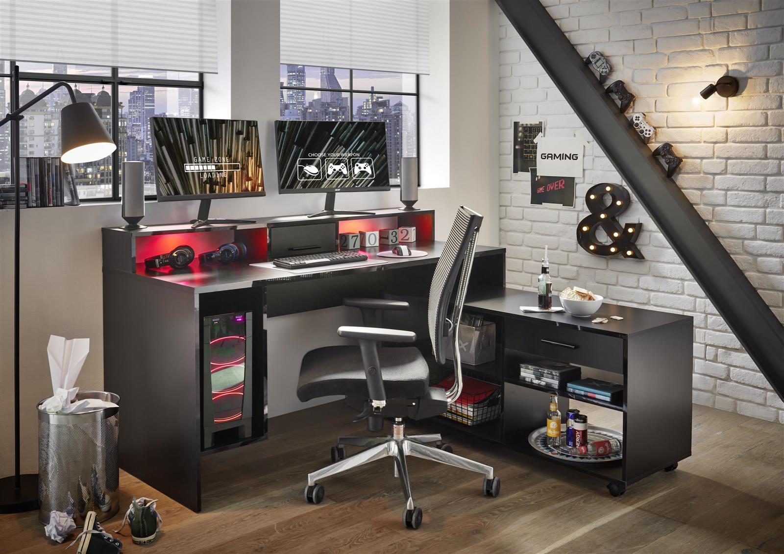 „Thasos I“ – moderner Gamer-Schreibtisch mit Rollcontainer und Beleuchtung