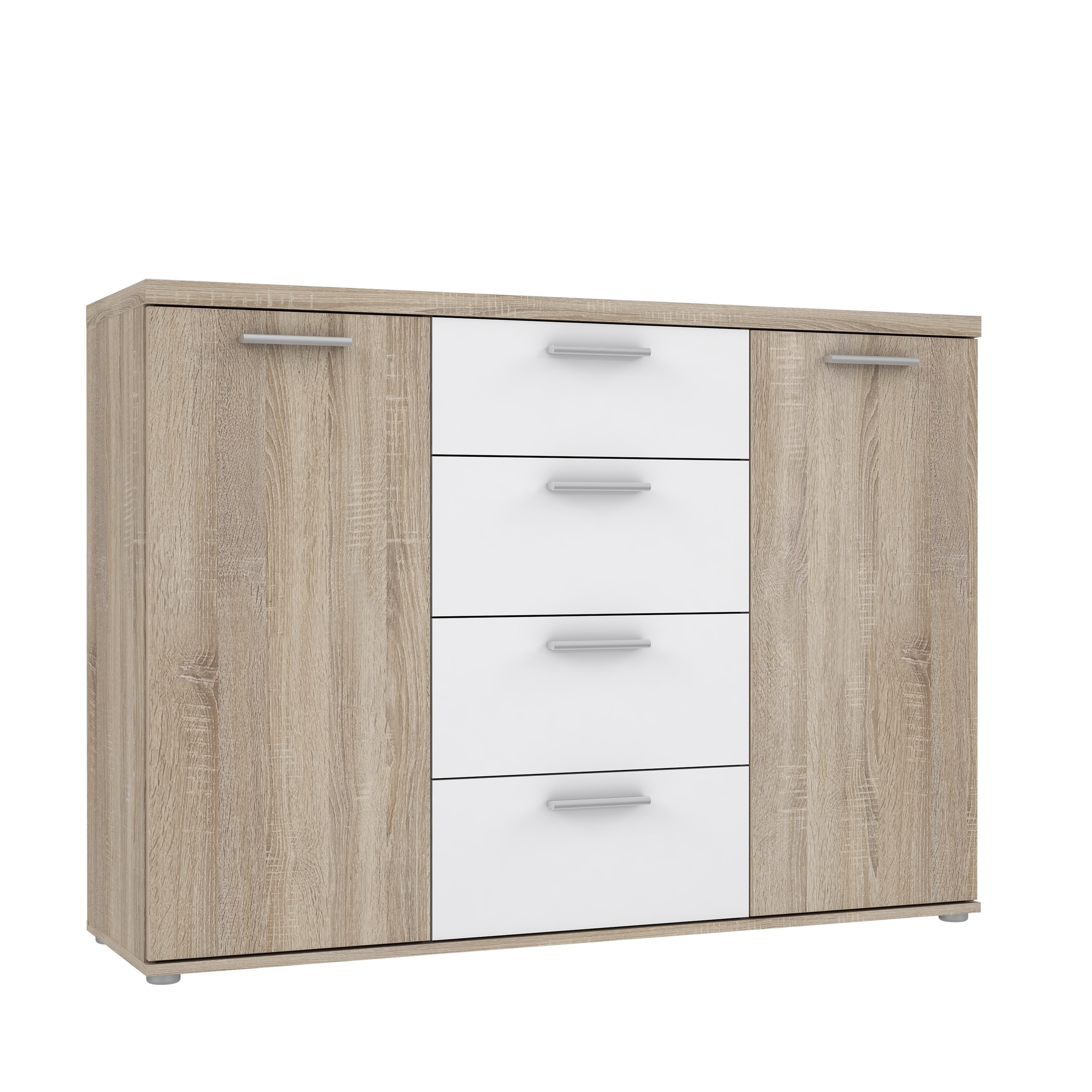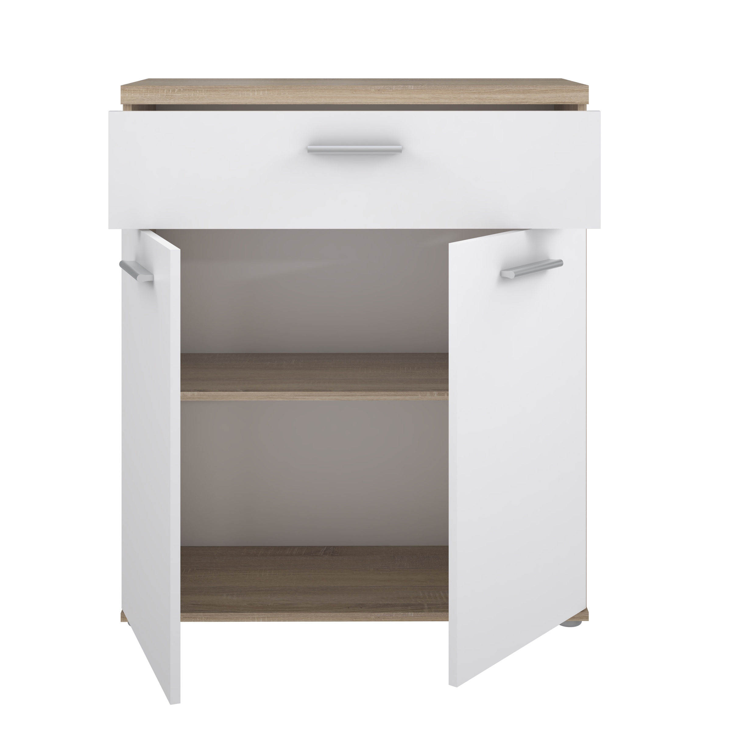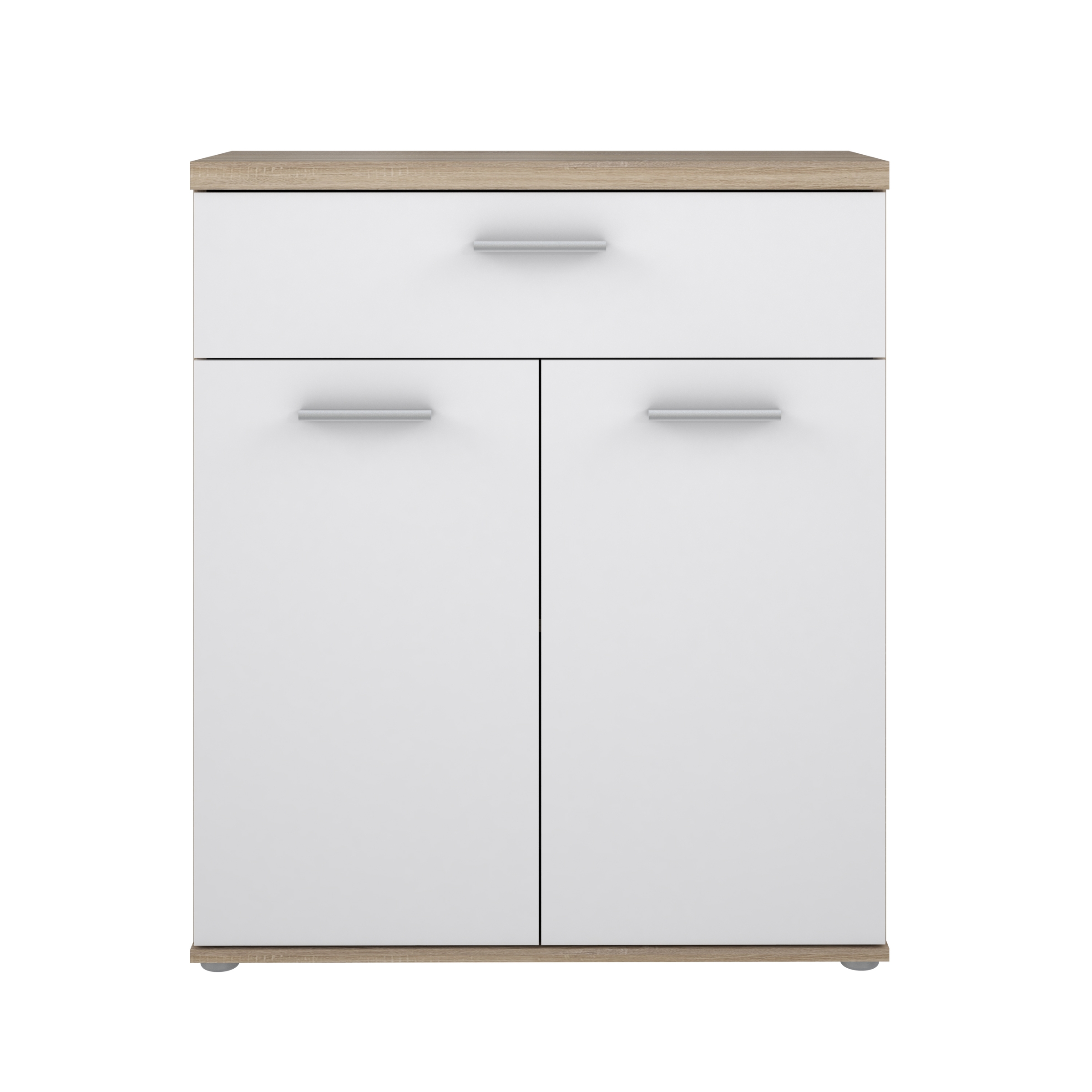 Optisch überzeugt WINNIE durch die Kombination aus einem Korpus in Sonoma Eiche Dekor und einer Front in Weiß. Diese Gestaltung wirkt freundlich, hell und fügt sich problemlos in unterschiedliche Einrichtungskonzepte ein – von modern bis zeitlos. Schwarze Kunststofffüße und ein Griff im Aluminiumeffekt setzen dezente Akzente und unterstreichen den modernen Look.