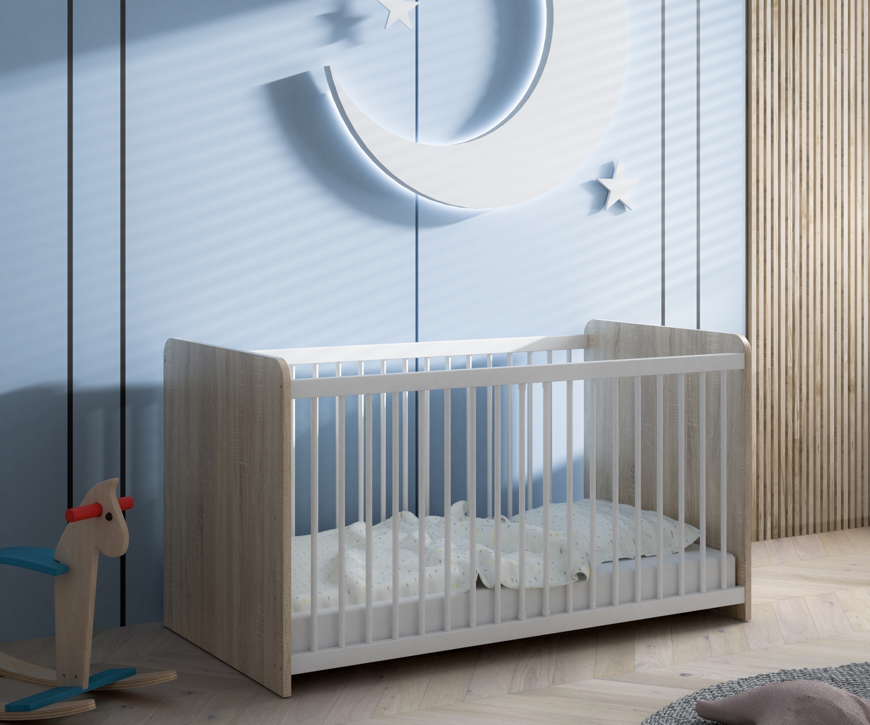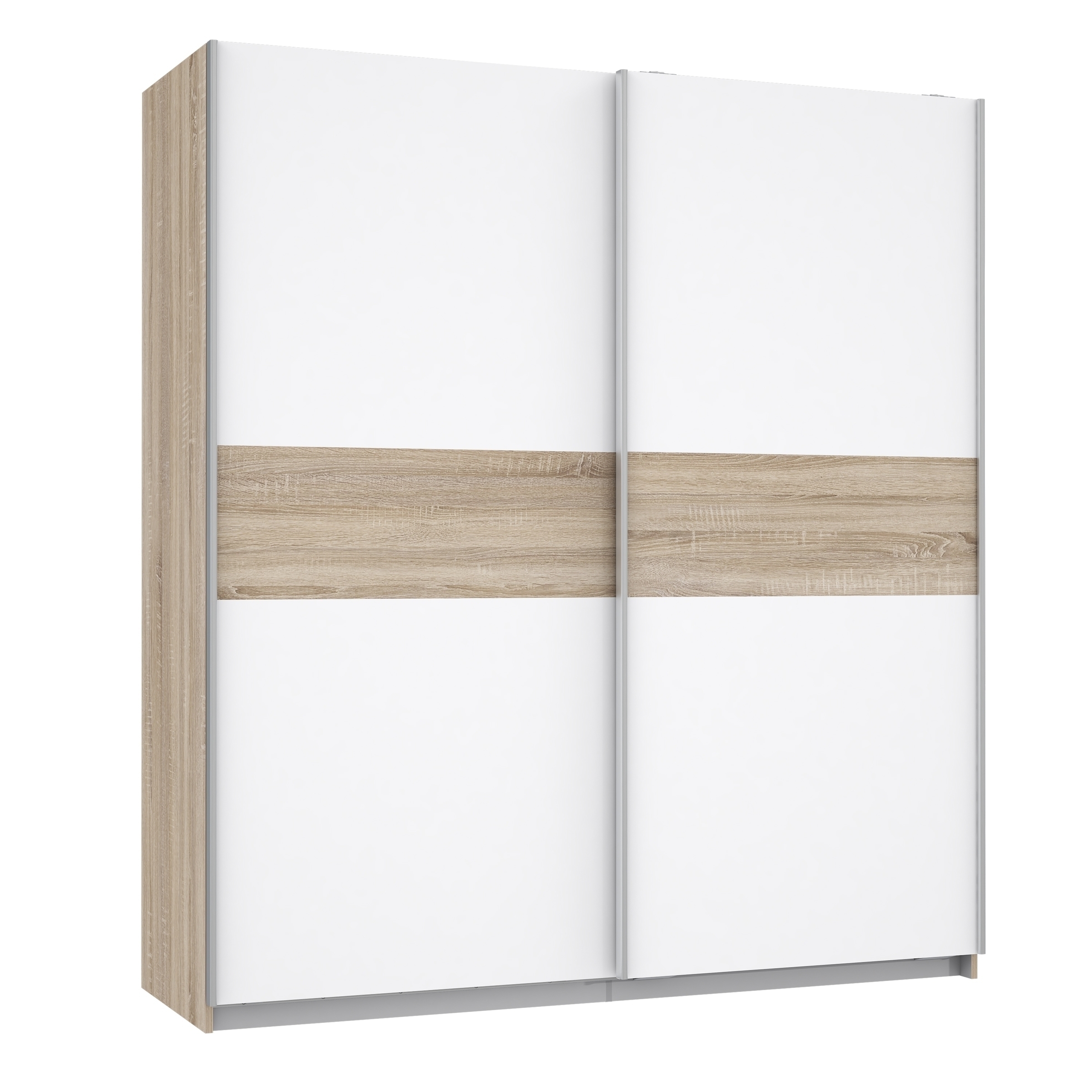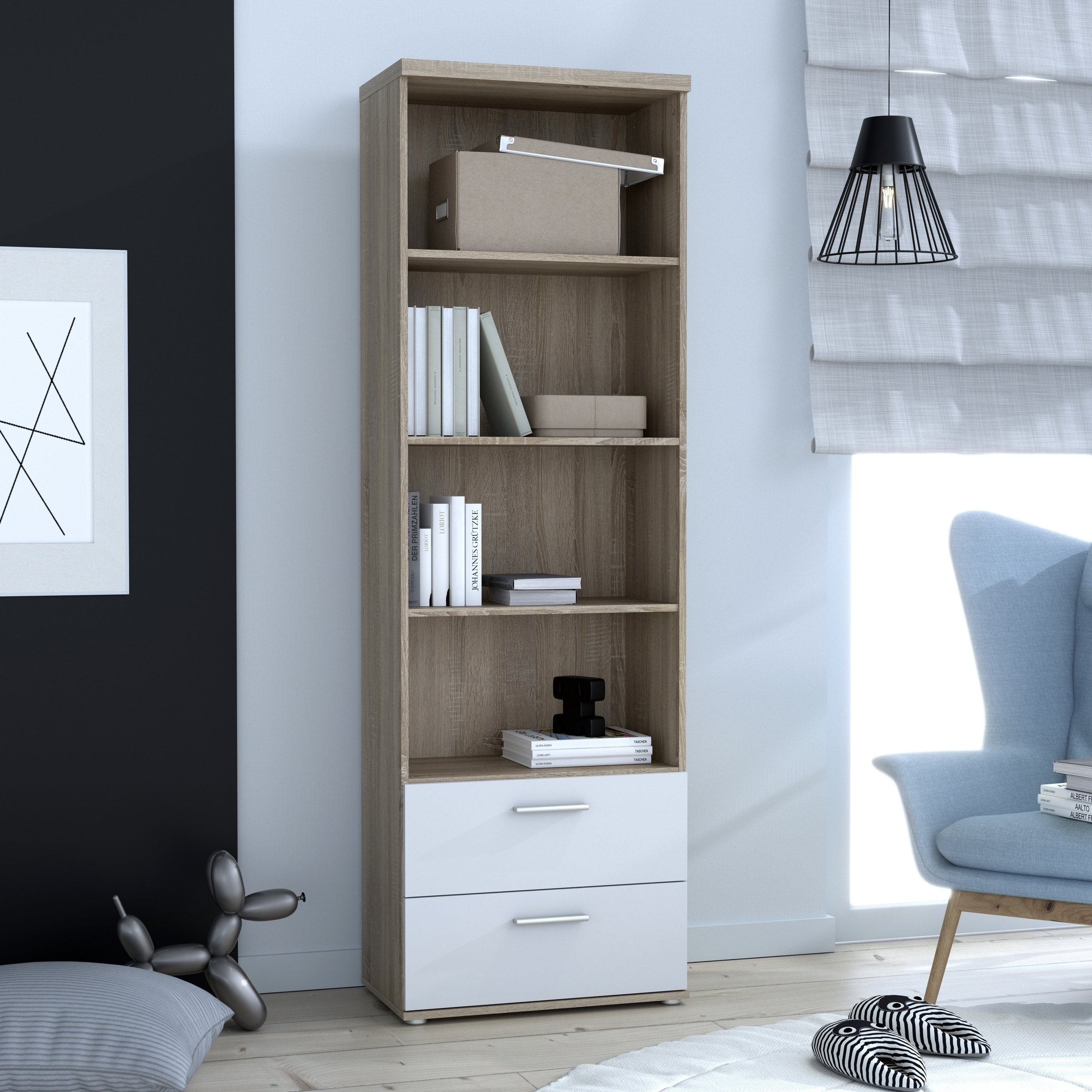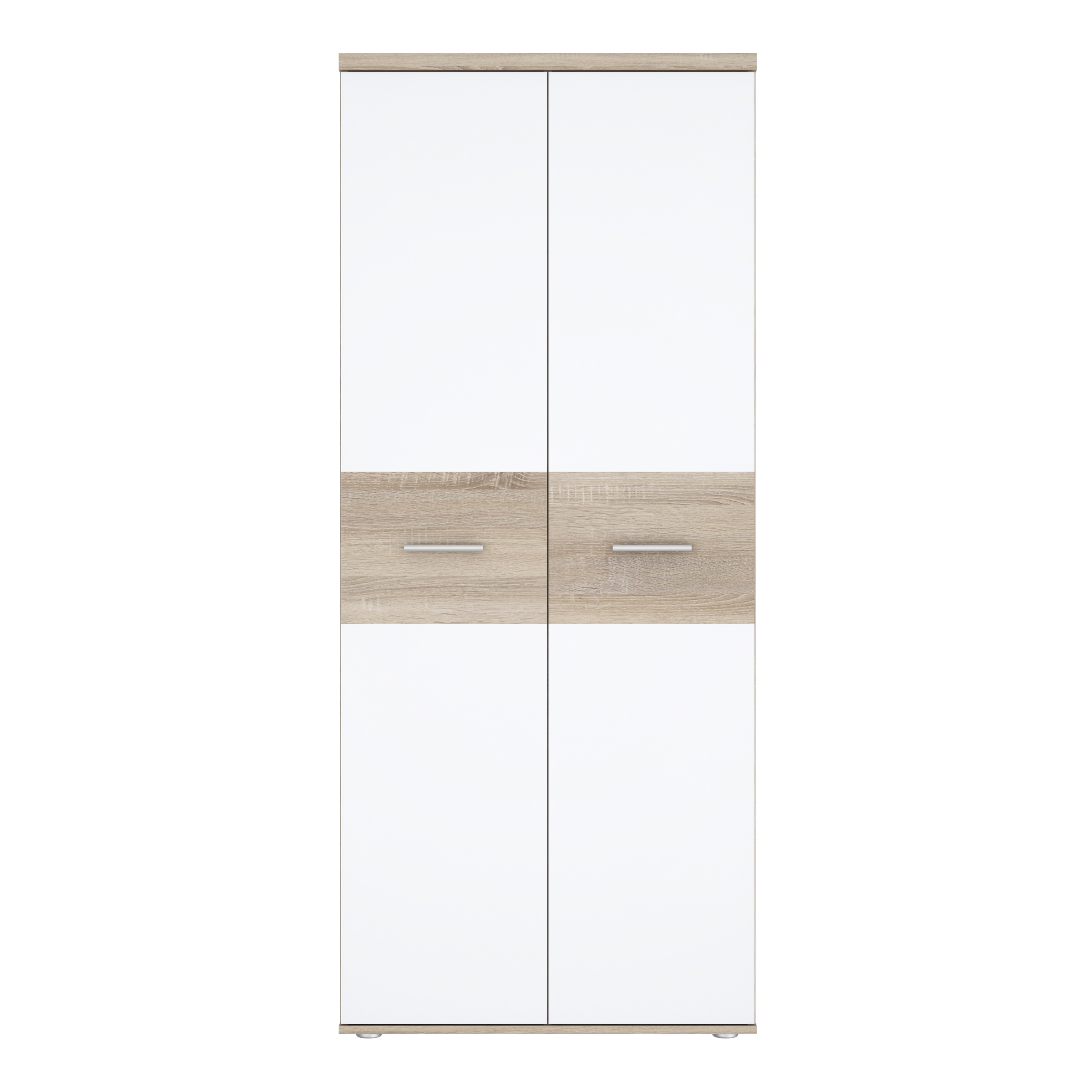 Optisch überzeugt WINNIE durch die Kombination aus einem Korpus in Sonoma Eiche Dekor und einer Front in Weiß. Diese Gestaltung wirkt freundlich, hell und fügt sich problemlos in unterschiedliche Einrichtungskonzepte ein – von modern bis zeitlos. Schwarze Kunststofffüße und ein Griff im Aluminiumeffekt setzen dezente Akzente und unterstreichen den modernen Look.