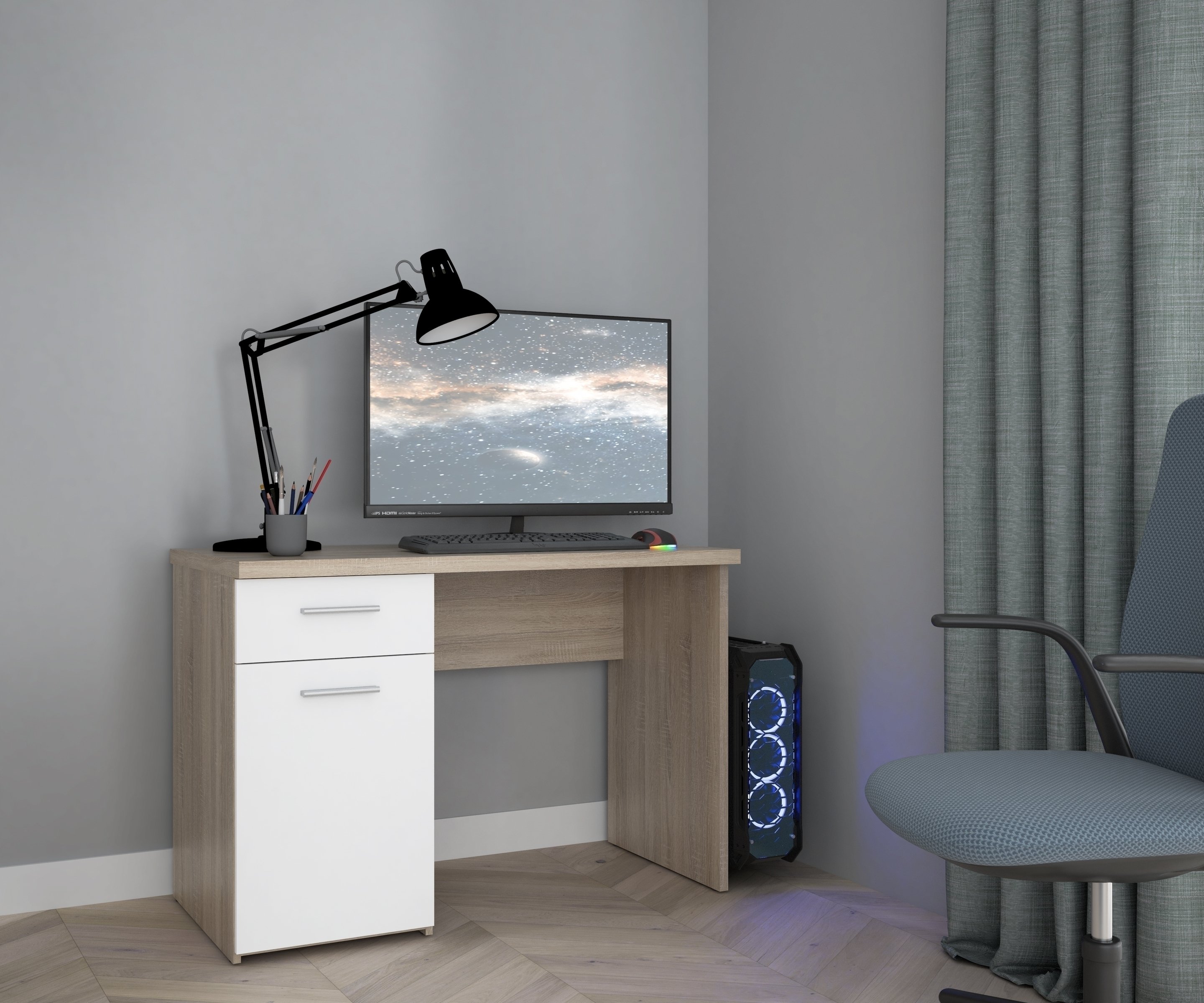 Die Kombination aus Sonoma Eiche-Dekor für den Korpus und der weißen Front sorgt für einen freundlichen, modernen Look, der viele Einrichtungsstile harmonisch ergänzt. Praktische Stauraumlösungen mit einer Schublade und zwei geschlossenen Fächern hinter Drehtüren bieten Platz für Dokumente, Büromaterial und Utensilien, die Sie schnell zur Hand haben oder unsichtbar verstauen möchten.
